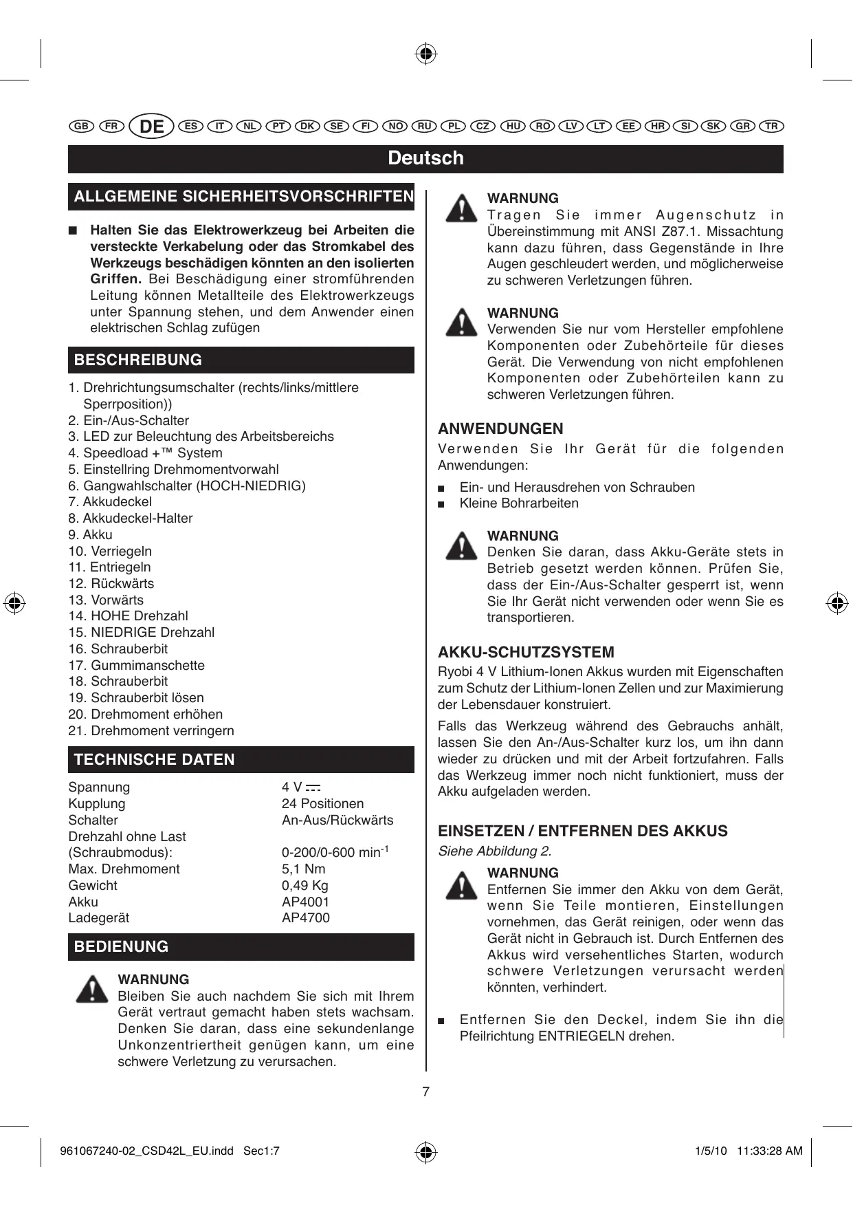 BEDIENUNGSANLEITUNG CSD 40 LI, CSD42L RYOBI