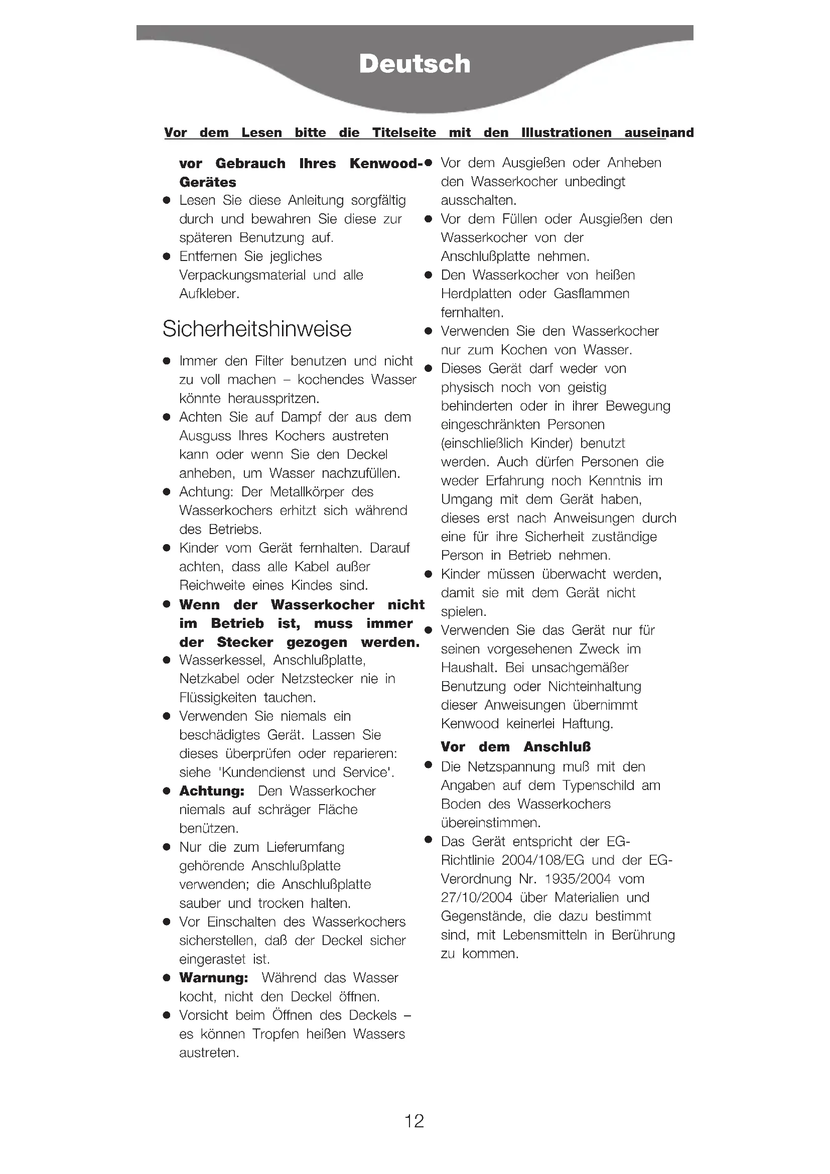 Verwenden Sie das Gerät nur für seinen vorgesehenen Zweck im Haushalt. Bei unsachgemäßer Benutzung oder Nichteinhaltung dieser Anweisungen übernimmt Kenwood keinerlei Haftung. Vor dem Anschluß