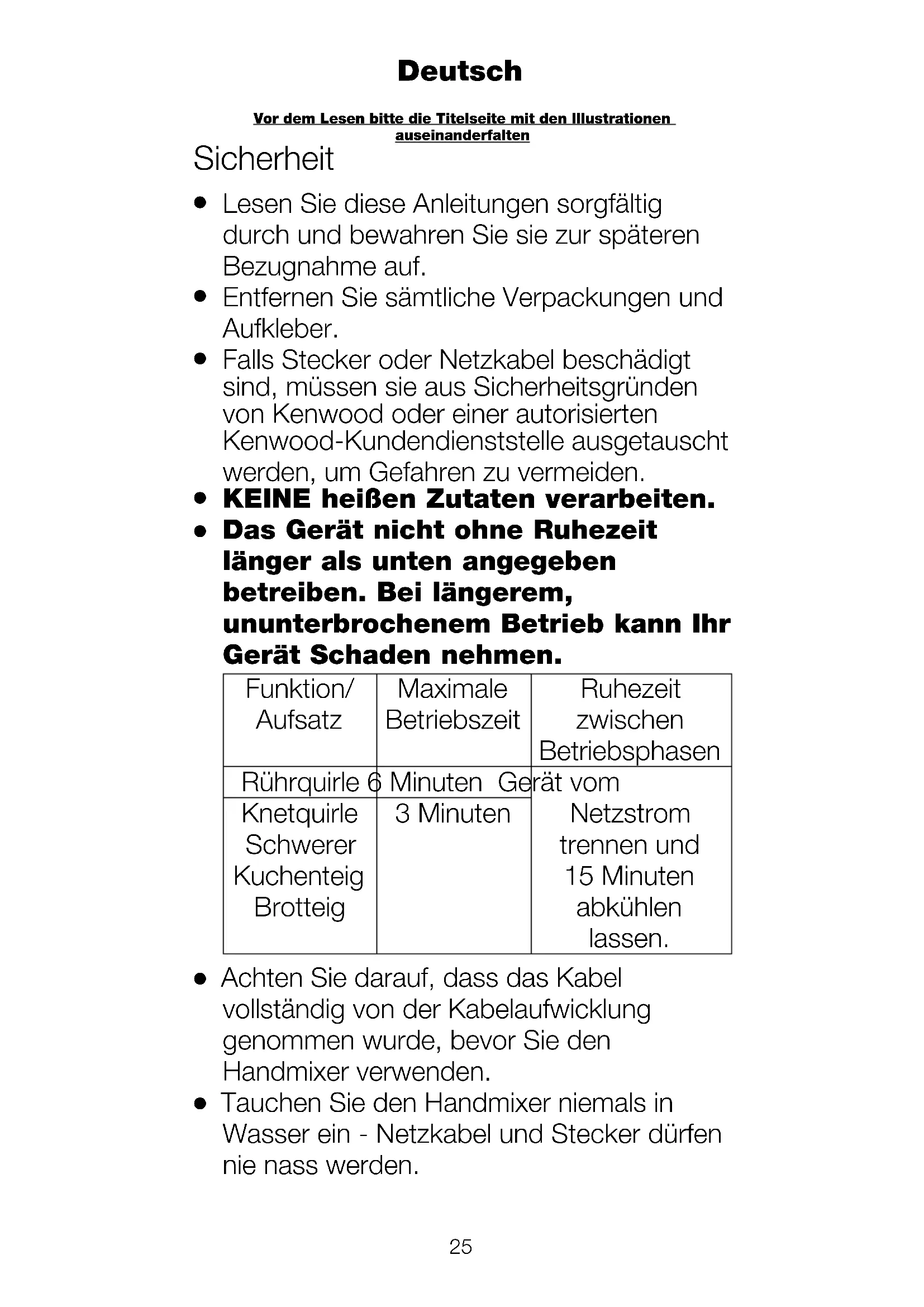 Tauchen Sie den Handmixer niemals in Wasser ein - Netzkabel und Stecker dürfen nie nass werden. Deutsch Vor dem Lesen bitte die Titelseite mit den Illustrationen auseinanderfalten26