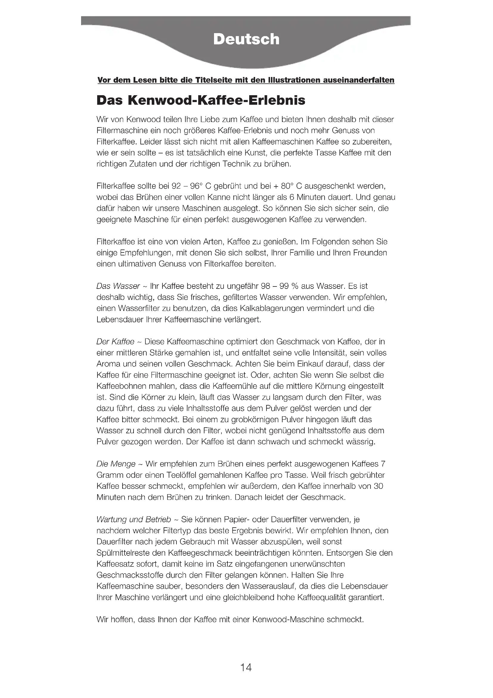 2002/96/EC. Au terme de son utilisation, le produit ne doit pas être éliminé avec les déchets urbains. Le produit doit être remis à l'un des centres de collecte sélective prévus par l'administration communale ou auprès des revendeurs assurant ce service. Éliminer séparément un appareil électroménager permet d'éviter les retombées négatives pour l'environnement et la santé dérivant d'une élimination incorrecte, et permet de récupérer les matériaux qui le composent dans le but d'une économie importante en termes d'énergie et de ressources.Pour rappeler l'obligation d'éliminer séparément les appareils électroménagers, le produit porte le symbole d'un caisson à ordures barré. 13Das Kenwood-Kaffee-Erlebnis Wir von Kenwood teilen Ihre Liebe zum Kaffee und bieten Ihnen deshalb mit dieser Filtermaschine ein noch größeres Kaffee-Erlebnis und noch mehr Genuss von Filterkaffee. Leider lässt sich nicht mit allen Kaffeemaschinen Kaffee so zubereiten, wie er sein sollte – es ist tatsächlich eine Kunst, die perfekte Tasse Kaffee mit den richtigen Zutaten und der richtigen Technik zu brühen. Filterkaffee sollte bei 92 – 96° C gebrüht und bei + 80° C ausgeschenkt werden, wobei das Brühen einer vollen Kanne nicht länger als 6 Minuten dauert. Und genau dafür haben wir unsere Maschinen ausgelegt. So können Sie sich sicher sein, die geeignete Maschine für einen perfekt ausgewogenen Kaffee zu verwenden. Filterkaffee ist eine von vielen Arten, Kaffee zu genießen. Im Folgenden sehen Sie einige Empfehlungen, mit denen Sie sich selbst, Ihrer Familie und Ihren Freunden einen ultimativen Genuss von Filterkaffee bereiten. Das Wasser ~ Ihr Kaffee besteht zu ungefähr 98 – 99 % aus Wasser. Es ist deshalb wichtig, dass Sie frisches, gefiltertes Wasser verwenden. Wir empfehlen, einen Wasserfilter zu benutzen, da dies Kalkablagerungen vermindert und die Lebensdauer Ihrer Kaffeemaschine verlängert. Der Kaffee ~ Diese Kaffeemaschine optimiert den Geschmack von Kaffee, der in einer mittleren Stärke gemahlen ist, und entfaltet seine volle Intensität, sein volles Aroma und seinen vollen Geschmack. Achten Sie beim Einkauf darauf, dass der Kaffee für eine Filtermaschine geeignet ist. Oder, achten Sie wenn Sie selbst die Kaffeebohnen mahlen, dass die Kaffeemühle auf die mittlere Körnung eingestellt ist. Sind die Körner zu klein, läuft das Wasser zu langsam durch den Filter, was dazu führt, dass zu viele Inhaltsstoffe aus dem Pulver gelöst werden und der Kaffee bitter schmeckt. Bei einem zu grobkörnigen Pulver hingegen läuft das Wasser zu schnell durch den Filter, wobei nicht genügend Inhaltsstoffe aus dem Pulver gezogen werden. Der Kaffee ist dann schwach und schmeckt wässrig. Die Menge ~ Wir empfehlen zum Brühen eines perfekt ausgewogenen Kaffees 7 Gramm oder einen Teelöffel gemahlenen Kaffee pro Tasse. Weil frisch gebrühter Kaffee besser schmeckt, empfehlen wir außerdem, den Kaffee innerhalb von 30 Minuten nach dem Brühen zu trinken. Danach leidet der Geschmack. Wartung und Betrieb ~ Sie können Papier- oder Dauerfilter verwenden, je nachdem welcher Filtertyp das beste Ergebnis bewirkt. Wir empfehlen Ihnen, den Dauerfilter nach jedem Gebrauch mit Wasser abzuspülen, weil sonst Spülmittelreste den Kaffeegeschmack beeinträchtigen könnten. Entsorgen Sie den Kaffeesatz sofort, damit keine im Satz eingefangenen unerwünschten Geschmacksstoffe durch den Filter gelangen können. Halten Sie Ihre Kaffeemaschine sauber, besonders den Wasserauslauf, da dies die Lebensdauer Ihrer Maschine verlängert und eine gleichbleibend hohe Kaffeequalität garantiert. Wir hoffen, dass Ihnen der Kaffee mit einer Kenwood-Maschine schmeckt. Deutsch
