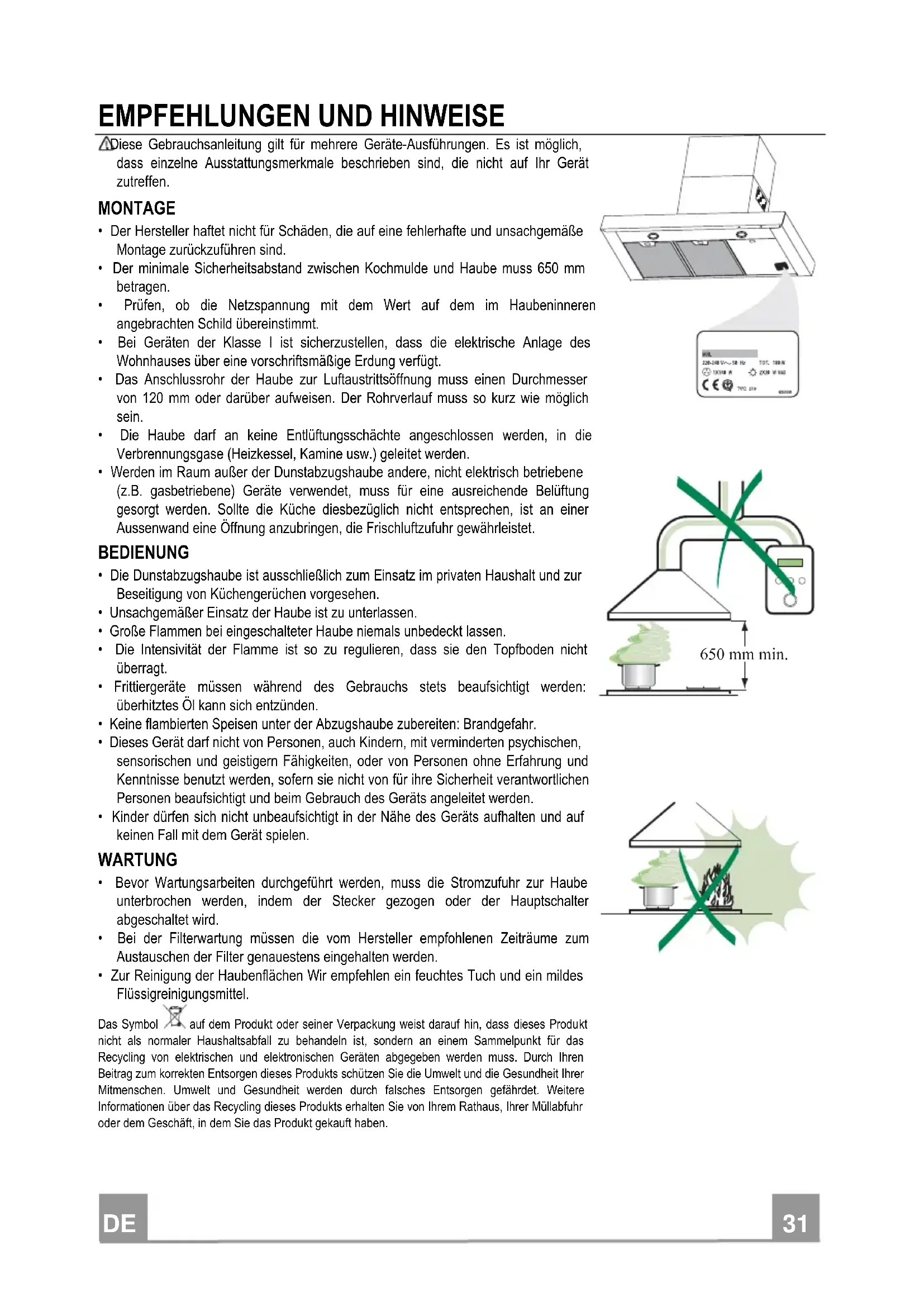 - Bevor Wartungsarbeiten durchgeführt werden, muss die Stromzufuhr zur Haube unterbrochen werden, indem der Stecker gezogen oder der Hauptschalter abgeschaltet wird. • Bei der Filterwartung müssen die vom Hersteller empfohlenen Zeiträume zum Austauschen der Filter genauestens eingehalten werden. • Zur Reinigung der Haubenflächen Wir empfehlen ein feuchtes Tuch und ein mildes Flüssigreinigungsmittel. Das Symbol auf dem Produkt oder seiner Verpackung weist darauf hin, dass dieses Produkt nicht als normaler Haushaltsabfall zu behandeln ist, sondern an einem Sammelpunkt für das Recycling von elektrischen und elektronischen Geräten abgegeben werden muss. Durch Ihren Beitrag zum korrekten Entsorgen dieses Produkts schützen Sie die Umwelt und die Gesundheit Ihrer Mitmenschen. Umwelt und Gesundheit werden durch falsches Entsorgen gefährdet. Weitere Informationen über das Recycling dieses Produkts erhalten Sie von Ihrem Rathaus, Ihrer Müllabfuhr oder dem Geschäft, in dem Sie das Produkt gekauft haben. 650 mm min.DE