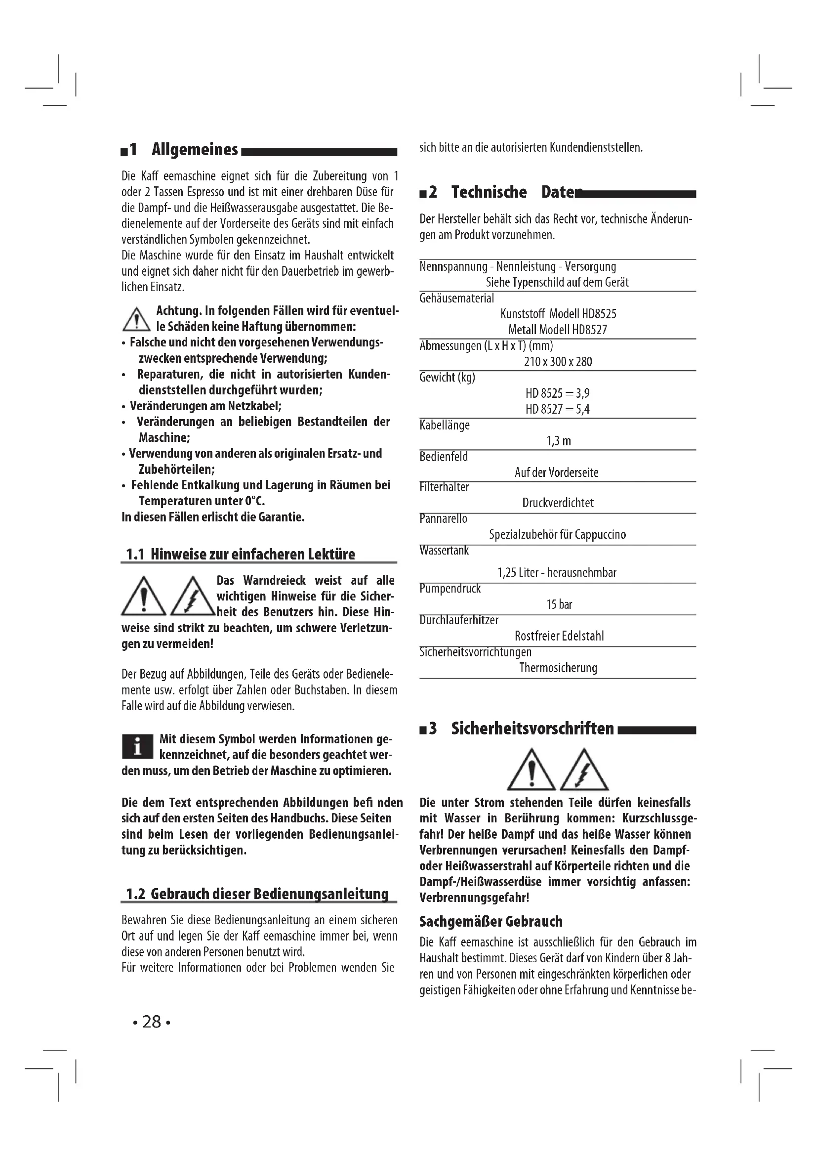 Bewahren Sie diese Bedienungsanleitung an einem sicheren Ort auf und legen Sie der Ka eemaschine immer bei, wenn diese von anderen Personen benutzt wird. Für weitere Informationen oder bei Problemen wenden Sie sich bitte an die autorisierten Kundendienststellen. 2 Technische Daten Der Hersteller behält sich das Recht vor, technische Änderun- gen am Produkt vorzunehmen. Nennspannung - Nennleistung - Versorgung Siehe Typenschild auf dem Gerät Gehäusematerial Kunststo Modell HD8525 Metall Modell HD8527 Abmessungen (L x H x T) (mm) 210 x 300 x 280 Gewicht (kg) HD 8525 = 3,9 HD 8527 = 5,4 Kabellänge 1,3 m Bedienfeld Auf der Vorderseite Filterhalter Druckverdichtet Pannarello Spezialzubehör für Cappuccino Wassertank 1,25 Liter - herausnehmbar Pumpendruck 15 bar Durchlauferhitzer Rostfreier Edelstahl Sicherheitsvorrichtungen Thermosicherung 3 Sicherheitsvorschriften Die unter Strom stehenden Teile dürfen keinesfalls mit Wasser in Berührung kommen: Kurzschlussge- fahr! Der heiße Dampf und das heiße Wasser können Verbrennungen verursachen! Keinesfalls den Dampf- oder Heißwasserstrahl auf Körperteile richten und die Dampf-/Heißwasserdüse immer vorsichtig anfassen: Verbrennungsgefahr! Sachgemäßer Gebrauch Die Ka eemaschine ist ausschließlich für den Gebrauch im Haushalt bestimmt. Dieses Gerät darf von Kindern über 8 Jah- ren und von Personen mit eingeschränkten körperlichen oder geistigen Fähigkeiten oder ohne Erfahrung und Kenntnisse be-• 29 • Deutsch dient werden, wenn diese im sicheren Umgang mit dem Gerät geschult oder dabei überwacht werden, und die vorhandenen Gefahren verstehen. Kindern sollten nicht mit dem Gerät spie- len. Die vom Benutzer auszuführende Reinigung und Instand- haltung darf nicht von Kindern ausgeführt werden, wenn diese nicht überwacht werden. Stromversorgung Die Ka eemaschine darf ausschließlich an eine geeignete Steckdose angeschlossen werden. Die Spannung muss mit derjenigen übereinstimmen, die auf dem Typenschild des Ge- räts angegeben ist. Netzkabel Die Ka eemaschine darf keinesfalls mit defektem Netzkabel betrieben werden. Bei Schäden am Netzkabel muss dieses vom Hersteller oder von dessen Kundendienst ausgetauscht werden. Das Netzkabel darf nicht in Ecken, über scharfe Kanten oder auf sehr heißen Gegenständen verlegt werden. Es sollte vor Öl geschützt werden. Die Ka eemaschine darf nicht am Kabel getragen oder gezo- gen werden. Der Stecker darf nicht durch Ziehen am Kabel her- ausgezogen werden. Er sollte nicht mit nassen Händen berührt werden. Der freie Fall des Netzkabels von Tischen oder Regalen sollte vermieden werden. Schutz anderer Personen Kinder beaufsichtigen, damit sie nicht mit dem Gerät spielen. Kinder können die Gefahrensituationen, die durch Haushalts- geräte entstehen können, nicht abschätzen. Die für die Ver- packung der Maschine benutzten Materialien sollten nicht in Reichweite von Kindern aufbewahrt werden. Verbrühungsgefahr Den Heißwasser- oder Dampfstrahl keinesfalls auf sich selbst oder auf andere Personen richten. Die Dampfdüse keinesfalls direkt berühren. Dabei sollten stets die entsprechenden Hand- gri e oder Kurbeln benutzt werden. Der Druck lterhalter darf keinesfalls während der Ausgabe des Ka ees herausgenommen (abgenommen) werden. Während der Aufheizphase der Brühgruppe besteht die Mög- lichkeit des Austritts von Tropfen heißen Wassers. Die Brühgruppe keinesfalls bei eingeschalteter Maschine, oder bevor die Brühgruppe abgekühlt ist, berühren. Standort Die Ka eemaschine sollte an einem sicheren Ort aufgestellt werden, an dem nicht die Gefahr des Umkippens oder der Ver- letzung von Personen besteht. Es besteht die Möglichkeit des Austrittes von heißem Wasser oder Dampf: Verbrennungs- gefahr! Die Maschine sollte Temperaturen von unter 0°C nicht ausge- setzt werden. Es besteht die Gefahr, dass die Maschine durch gefrierendes Wasser beschädigt wird. Die Ka eemaschine darf nicht im Freien betrieben werden. Die Maschine nicht auf heißen Flächen oder in der Nähe von o enem Feuer aufstellen, da das Gehäuse schmelzen oder auf andere Art beschädigt werden könnte. Reinigung Bevor die Maschine gereinigt wird, muss sie mit der Taste ON/ OFF ausgeschaltet und dann der Stecker von der Steckdose abgenommen werden. Darüber hinaus abwarten, bis die Ma- schine abgekühlt ist. Die Maschine keinesfalls in Wasser tauchen! Der Versuch von Eingri en im Inneren der Maschine ist streng- stens verboten. Wasser, das einige Tage lang im Wassertank verblieben ist, darf nicht für Lebensmittelzwecke genutzt oder getrunken werden. Den Tank reinigen und mit frischem Trink- wasser füllen. Raumbedarf für den Betrieb und die Wartung Für einen korrekten und einwandfreien Betrieb der Ka eema- schine sollten folgende Empfehlungen berücksichtigt werden: