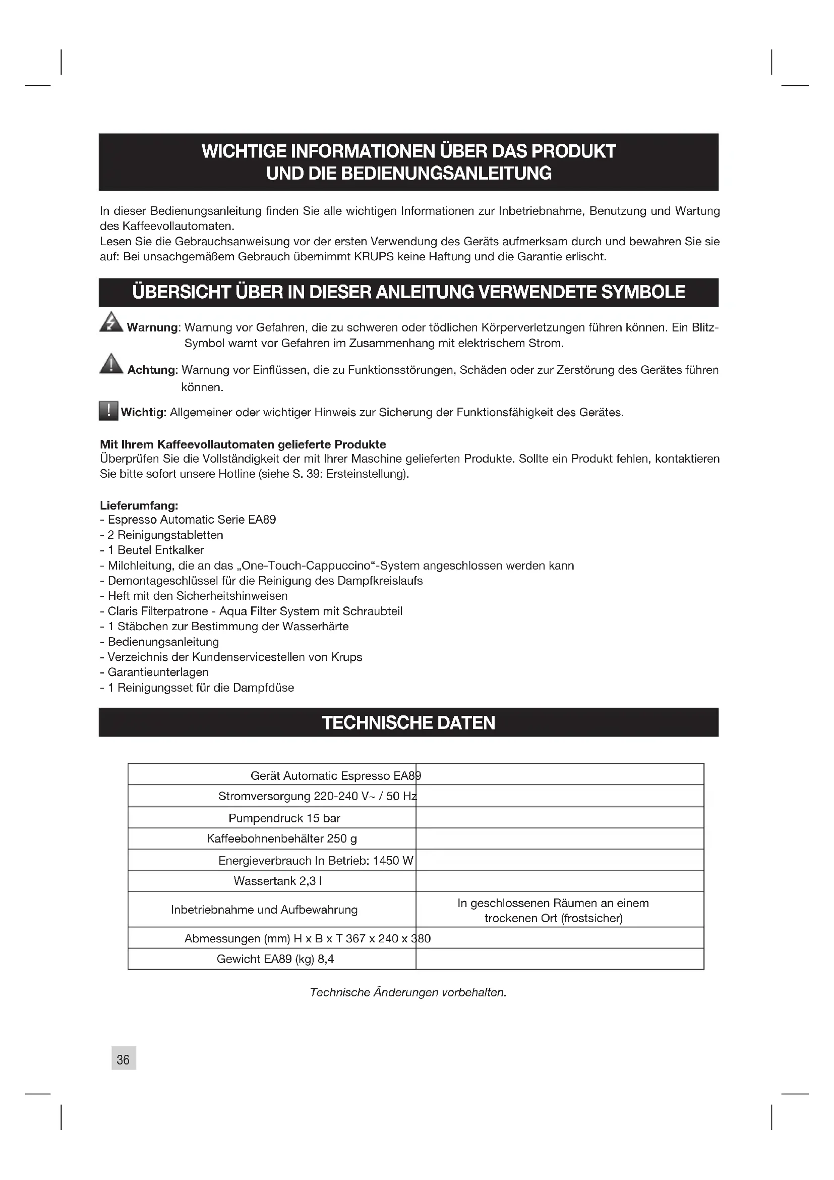 Wichtig: Allgemeiner oder wichtiger Hinweis zur Sicherung der Funktionsfähigkeit des Gerätes. Mit Ihrem Kaffeevollautomaten gelieferte Produkte Überprüfen Sie die Vollständigkeit der mit Ihrer Maschine gelieferten Produkte. Sollte ein Produkt fehlen, kontaktieren Sie bitte sofort unsere Hotline (siehe S. 39: Ersteinstellung). Lieferumfang: - Espresso Automatic Serie EA89 - 2 Reinigungstabletten - 1 Beutel Entkalker - Milchleitung, die an das „One-Touch-Cappuccino“-System angeschlossen werden kann - Demontageschlüssel für die Reinigung des Dampfkreislaufs - Heft mit den Sicherheitshinweisen - Claris Filterpatrone - Aqua Filter System mit Schraubteil - 1 Stäbchen zur Bestimmung der Wasserhärte - Bedienungsanleitung - Verzeichnis der Kundenservicestellen von Krups - Garantieunterlagen - 1 Reinigungsset für die Dampfdüse TECHNISCHE DATEN Gerät Automatic Espresso EA89 Stromversorgung 220-240 V~ / 50 Hz Pumpendruck 15 bar Kaffeebohnenbehälter 250 g Energieverbrauch In Betrieb: 1450 W Wassertank 2,3 l Inbetriebnahme und Aufbewahrung In geschlossenen Räumen an einem trockenen Ort (frostsicher) Abmessungen (mm) H x B x T 367 x 240 x 380 Gewicht EA89 (kg) 8,4 Technische Änderungen vorbehalten.BESCHREIBUNG DES KAFFEEVOLLAUTOMATEN A Griff/Deckel des Wassertanks B Wassertank C Kaffeesatzbehälter D Höhenverstellbare Kaffeeauslässe E Abnehmbares Abtropffach mit Gitter F Deckel des Kaffeebohnenbehälters G Abnehmbares One-Touch-Cappuccino- System H Milchleitung und Mischelement I Wasserstandschwimmer