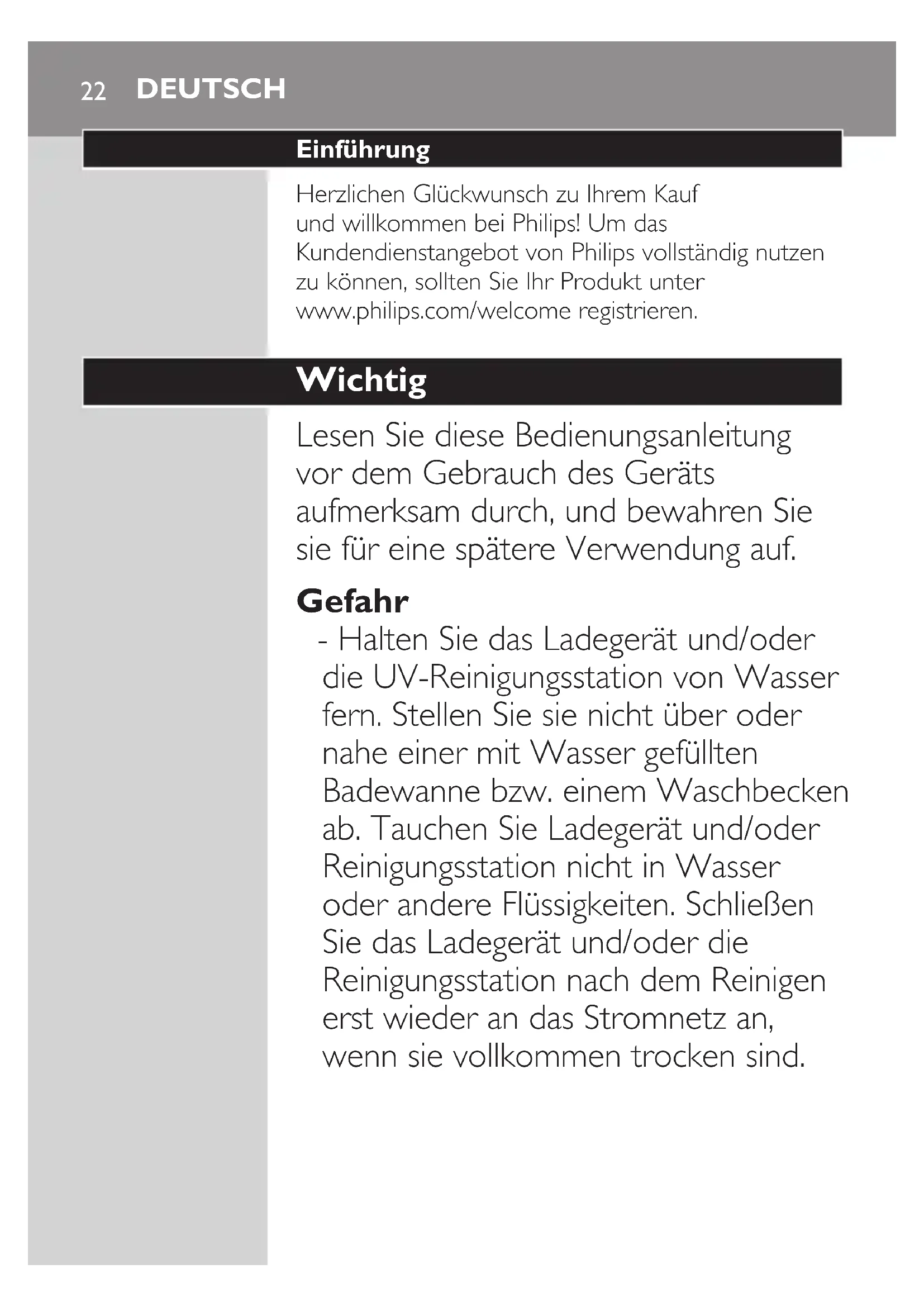 7 After you have completed the brushing cycle, you can spend additional time brushing the chewing surfaces of your teeth and areas where staining occurs. You may also brush your tongue, with the toothbrush switched on or off, as you prefer. The Sonicare is safe to use on: - Braces (brush heads wear out sooner when used on braces) - Dental restorations (llings, crowns, veneers) Note: You can switch the toothbrush on or off at any time by pressing and holding the power on/off button for 2 seconds. Clean and White mode brushing instructions The Clean and White mode combines 2 minutes of Clean mode for a whole mouth clean, with an additional 30 seconds of White mode to focus on the visible front teeth. 1 Brush the rst 2 minutes as instructed in steps 1-6 above. 2 After the 2 minutes of Clean mode, the White mode begins with a change in brushing sound and motion. This is your signal to start brushing the upper front teeth for 15 seconds. ENGLISH 113 At the next beep and pause, move to the bottom front teeth for the nal 15 seconds of brushing. Brushing modes Sonicare automatically starts in the default Clean mode. To select a different brushing mode: 1 Press the on/off button to toggle between modes. , The green LED indicates the selected mode. Note: You can only toggle between modes when the toothbrush is switched on. Clean mode Standard mode for superior teeth cleaning. Sensitive mode (specic types only) Gentle yet thorough cleaning for sensitive gums and teeth. Clean and White mode 2 minutes of Clean mode, with an additional 30 seconds of White mode to focus on your visible front teeth. Note: When Sonicare is used in clinical studies, the default 2-minute Clean mode must be selected. However, in whitening/stain reduction studies, the Clean and White mode must be selected. The handle must be fully charged and the Easy-start feature must be deactivated. ENGLISH12Features Easy-start - This Sonicare model comes with the Easy-start feature activated. - The Easy-start feature gently increases power over the rst 14 brushings to let you get used to brushing with the Sonicare. Note: Each of the rst 14 brushings must be at least 1 minute in length to move through the Easy-start ramp-up cycle properly. Note: When the Clean and White mode is selected, the Easy-start feature is inactive. Deactivating or activating the Easy-start feature 1 Attach your brush head to the handle. 2 Place the handle on the plugged-in charger. - To deactivate Easy-start: Press and hold the power on/off button for 2 seconds. You hear 1 beep to indicate that the Easy-start feature has been deactivated. - To activate Easy-start: Press and hold the power on/off button for 2 seconds. You hear 2 beeps to indicate that the Easy-start feature has been activated. Note: Using the Easy-start feature beyond the initial ramp-up period is not recommended and reduces Sonicare’s effectiveness in removing plaque. ENGLISH 13Smartimer The Smartimer indicates that your brushing cycle is complete by automatically switching off the toothbrush at the end of the brushing cycle. Dentists recommend brushing at leas 2 minutes twice a day. If you want to pause or stop brushing during your 2-minute cycle, press and hold the power on/off button for 2 seconds. Press the power on/off button again and the Smartimer picks up where you left off. The Smartimer automatically resets to the beginning of a 2-minute cycle if: - brushing is paused for 30 seconds or longer. - the handle is placed on the charger. Quadpacer (specic types only) - The Quadpacer is an interval timer that has a short beep and pause to remind you to brush the 4 sections of your mouth evenly and thoroughly. - When you use the two-minute Clean or Sensitive mode, you hear a short beep and a pause in brushing action at 30, 60 and 90 second intervals. - When you use the Clean and White mode, you hear and feel a change in the brush head sound and motion after 2 minutes of Clean mode. Then move the brush head to the visible top front teeth and brush them for 15 seconds. At the nal beep and pause, move to the visible bottom teeth and brush them for 15 seconds. ENGLISH14Cord wrap on sanitiser with integrated charger 1 If your Sonicare type includes the sanitiser, you can use the cord wrap feature in the bottom of the sanitiser to store excess cord. Sanitising (specic types only) - With the UV sanitiser you can clean your brush head after every use. Unplug the sanitiser, discontinue use and call Consumer Care if: - The window is broken or missing from the sanitiser. - The UV light bulb remains on when the door is open. - The sanitiser gives off smoke or a burning smell while it is operating. Note: UV light can be harmful to the human eye and skin. Keep the sanitiser out of reach of children at all times. 1 After brushing, rinse the brush head and shake off excess water. Do not place the travel cap on the brush head during sanitisation. 2 Place your nger in the door recess on top of the sanitiser and pull open the door. ENGLISH 153 Place the brush head on one of the 2 pegs in the sanitiser with the bristles facing the light bulb. Note: Only clean Sonicare snap-on brush heads in the sanitiser. Note: Do not clean Sonicare for Kids brush heads in the sanitiser. 4 Put the plug in a wall socket. 5 Close the door and press the green power on/ off button once to select the UV clean cycle. Note: You can only switch on the sanitiser if the door is closed properly. Note: The sanitiser stops if you open the door during the sanitising cycle. Note: The sanitiser cycle runs for 10 minutes and then automatically switches off. , The sanitiser is in operation when the blue light glows through the window. , When the sanitising cycle is complete, the sanitiser automatically shuts off. Cleaning Do not clean the brush head, handle, charger or UV sanitiser in the dishwasher. Toothbrush handle 1 Remove the brush head and rinse the metal shaft area with warm water. Do not push on the rubber seal on the metal shaft with shar