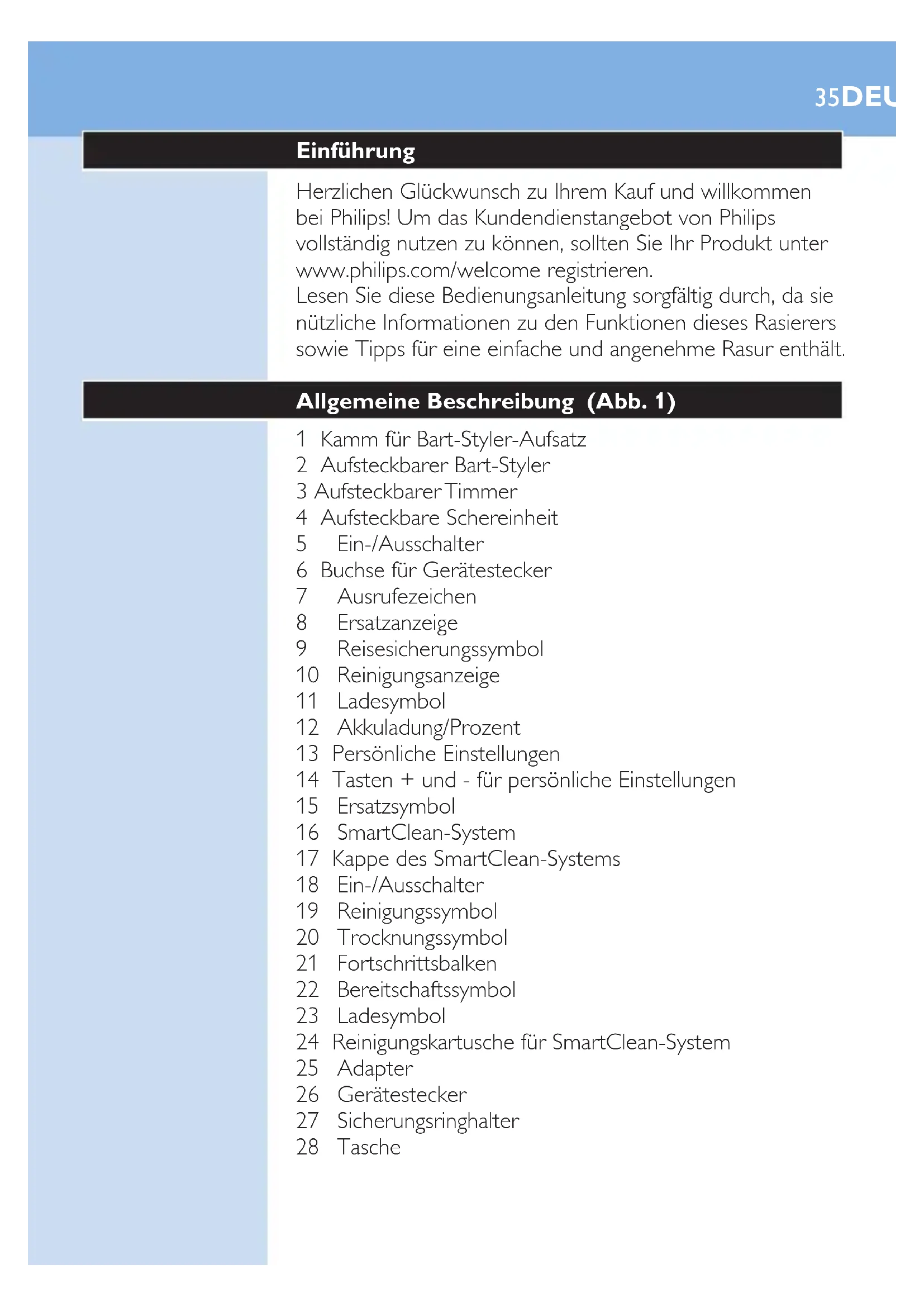 Ziehen Sie den Kammaufsatz vom Bart-Styler-Aufsatz ab. Hinweis: Halten Sie den Kammaufsatz in der Mitte, um ihn vom Bart-Styler-Aufsatz zu ziehen. Ziehen Sie nicht an den Seiten des Kammaufsatzes. 2 Drücken Sie den Ein-/Ausschalter einmal, um das Gerät einzuschalten. 3 Sie können jetzt beginnen, die Konturen Ihres Barts, Schnurrbarts, der Koteletten oder Halspartie zu denieren. Reinigung und Wartung Den Rasierer im SmartClean-System reinigen - Das SmartClean-System Pro verfügt ebenfalls über zwei Phasen: die Durchspülphase und die Trocknungsphase. Es verfügt außerdem über einen Fortschrittsbalken, der den Fortschritt für die beiden Phasen anzeigt. Das SmartClean-System für den Gebrauch vorbereiten Kippen Sie das SmartClean-System nicht, um ein Auslaufen zu vermeiden. Hinweis: Halten Sie das SmartClean-System fest, während Sie es für den Gebrauch vorbereiten. 1 Stecken Sie den kleinen Stecker in die Rückseite des SmartClean-Systems. 2 Stecken Sie den Adapter in die Steckdose. DEUTSCH463 Drücken Sie die Taste auf der Seite des SmartClean- Systems, (1) und heben Sie den oberen Teil des SmartClean-Systems (2) an. 4 Ziehen Sie das Siegel von der Reinigungskartusche. 5 Platzieren Sie die Reinigungskartusche im SmartClean-System. 6 Drücken Sie den oberen Teil des SmartClean-Systems wieder nach unten (Sie hören ein “Klicken”). Das SmartClean-System verwenden Vergewissern Sie sich, überschüssiges Wasser vor dem Einsetzen in das SmartClean-System immer abzuschütteln. 1 Halten Sie den Rasierer kopfüber über der Halterung. Vergewissern Sie sich, dass die Vorderseite des Rasierers auf das SmartClean-System gerichtet ist. DEUTSCH 472 Stellen Sie den Rasierer in die Halterung, (1) kippen Sie den Rasierer nach hinten, (2) und drücken Sie die obere Kappe nach unten, um den Rasierer zu verbinden (Sie hören ein “Klicken”) (3). , Das Akkusymbol und der Ein-/Ausschalter blinken, um anzuzeigen, dass der Rasierer aufgeladen wird. 3 Drücken Sie den Ein-/Ausschalter am SmartClean- System, um das Reinigungsprogramm zu starten. , Der Ein-/Ausschalter und das Durchspülsymbol leuchten kontinuierlich auf. Hinweis: Die Durchspülphase dauert ca. 10 Minuten. Hinweis: Der Fortschrittsbalken informiert Sie über den Fortschritt der Durchspülphase. , Während der Trocknungsphase leuchtet das Trocknungssymbol kontinuierlich. Hinweis: Die Trocknungsphase dauert ca. 4 Stunden. Hinweis: Der Fortschrittsbalken informiert Sie über den Fortschritt der Trocknungsphase. , Wenn das Reinigungsprogramm abgeschlossen ist, leuchtet das Bereitschaftssymbol kontinuierlich. , Das Akkusymbol leuchtet kontinuierlich, um anzuzeigen, dass der Rasierer vollständig aufgeladen ist. Hinweis: Der Ladevorgang dauert ca. 1 Stunde. Hinweis: Wenn Sie während des Reinigungsprogramms des SmartClean-Systems den Ein-/Ausschalter betätigen, wird das Programm abgebrochen. In diesem Fall hört das Durchspül- oder Trocknungssymbol auf zu blinken. Hinweis: Wenn Sie den Adapter während des Reinigungsprogramms vom Netzstrom entfernen, wird das Programm abgebrochen. DEUTSCH48Hinweis: 30 Minuten nach Beendigung des Reinigungsprogramms und des Auadens schaltet sich das SmartClean-System automatisch aus. Die Kartusche des SmartClean-Systems ersetzen - Ersetzen Sie die Reinigungskartusche, wenn das Ersatzsymbol orange blinkt oder wenn Sie mit dem Ergebnis nicht mehr zufrieden sind. 1 Drücken Sie die Taste auf der Seite des SmartClean- Systems, (1) und heben Sie den oberen Teil des SmartClean-Systems (2) an. 2 Entfernen Sie die leere Reinigungskartusche aus dem SmartClean-System, und gießen Sie verbleibende Rückstände von Reinigungslösung aus der Reinigungskartusche. Sie können die Reinigungsüssigkeit einfach über dem Spülbecken ausgießen. 3 Entsorgen Sie die leere Reinigungskartusche. 4 Nehmen Sie die neue Reinigungskartusche aus der Verpackung, und ziehen Sie das Siegel von der Kartusche. 5 Platzieren Sie die neue Reinigungskartusche im SmartClean-System. 6 Drücken Sie den oberen Teil des SmartClean-Systems wieder nach unten (Sie hören ein “Klicken”). Den Rasierer unter ießendem Wasser reinigen Für eine optimale Rasierleistung empfehlen wir, den Rasierer nach jedem Gebrauch zu reinigen. Gehen Sie vorsichtig mit heißem Wasser um. Achten Sie darauf, dass das Wasser nicht zu heiß ist und Sie sich nicht die Hände verbrühen. DEUTSCH 49Trocknen Sie die Schereinheit niemals mit einem Tuch ab, um Beschädigungen der Scherköpfe zu vermeiden. 1 Schalten Sie den Rasierer aus. 2 Spülen Sie die Schereinheit von außen einige Zeit mit warmem Leitungswasser ab. 3 Ziehen Sie den Scherkopfhalter vom unteren Teil der Schereinheit ab. 4 Spülen Sie den Scherkopfhalter mit warmem Leitungswasser ab. 5 Schütteln Sie überschüssiges Wasser sorgfältig ab, und lassen Sie den Scherkopfhalter trocknen. 6 Befestigen Sie den Scherkopfhalter am unteren Teil der Schereinheit, bis er hörbar einrastet. Gründliche Reinigungsmethode Vergewissern Sie sich, dass das Gerät ausgeschaltet ist. 1 Ziehen Sie den Scherkopfhalter vom unteren Teil der Schereinheit ab. 2 Setzen Sie den Sicherungsringhalter auf den Sicherungsring, (1) drehen Sie ihn gegen den Uhrzeigersinn, (2) und heben Sie den Scherkopf an (3). Entfernen Sie den Sicherungsring aus dem Sicherungsringhalter, und wiederholen Sie diese Vorgehensweise für die anderen Sicherungsringe. DEUTSCH503 Entfernen Sie die Scherköpfe vom Scherkopfhalter. Jeder Scherkopf besteht aus einem Schermesser und einem Scherkorb. Hinweis: Reinigen Sie immer nur ein Schermesser mit dem dazugehörigen Scherkorb, da die Paare jeweils aufeinander eingeschliffen sind. Wenn Sie ein Schermesser versehentlich in den falschen Scherkorb einsetzen, kann es mehrere Wochen dauern, bis wieder die optimale Rasierleistung erreicht wird. 4 Reinigen Sie das Schermesser und den Scherkorb unter ießendem Wasser. 5 Setzen Sie nach dem Reinigen das Schermesser wieder in den Korb. 6 Setzen Sie die Scherköpfe wieder in 