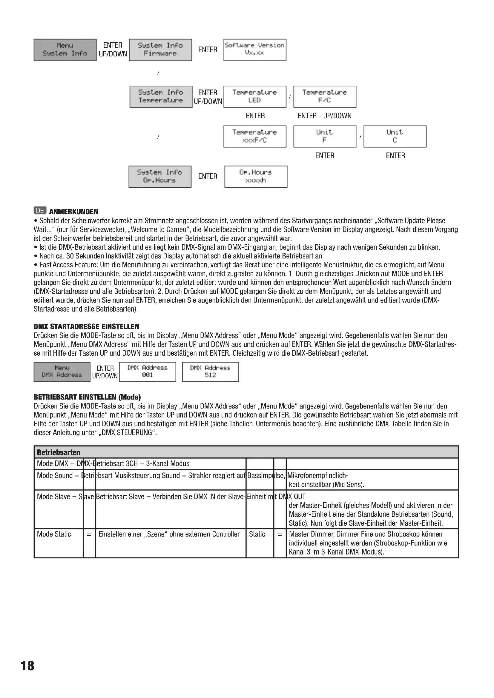DE MODE - Durch Drücken der MODE-Taste gelangen Sie in das Auswahl-Menü für Systemeinstellungen. Durch wiederholtes Drucken gelangen Sie zurück zur Hauptanzeige. ENTER - Durch Drucken der ENTER-Taste gelangen Sie auf die Menu-Ebene um Wertänderungen vornehmen zu konnen und um eines der Untermenü zu erreichen. Wertänderungen bestätigten Sie bereits durch Drucken der ENTER-Taste. UP und DOWN - Auswähen der einzelnen Menupunkte im Auswahl-Menü (DMX-Adresse, Betriebsart usw.) und in den Untermenü. Ermöglichen es, den Wert eines Menu-Punkts, wie z.B. die DMX-Adresse, wunschgemäß zu verändern.