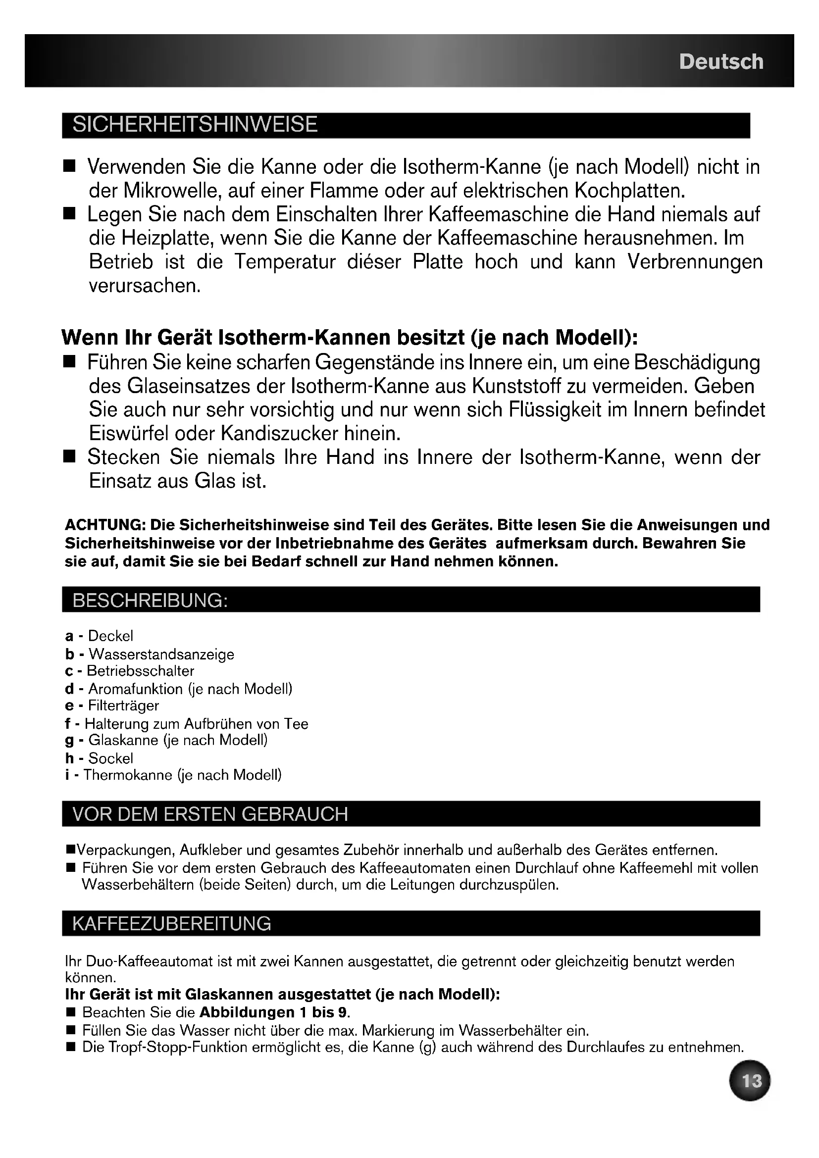 KR_DUOTECK_NC00125274 15/07/14 08:58 Page12SICHERHEITSHINWEISE n Verwenden Sie die Kanne oder die Isotherm-Kanne (je nach Modell) nicht in der Mikrowelle, auf einer Flamme oder auf elektrischen Kochplatten. n Legen Sie nach dem Einschalten Ihrer Kaffeemaschine die Hand niemals auf die Heizplatte, wenn Sie die Kanne der Kaffeemaschine herausnehmen. Im Betrieb ist die Temperatur diéser Platte hoch und kann Verbrennungen verursachen. Wenn Ihr Gerät Isotherm-Kannen besitzt (je nach Modell): n Führen Sie keine scharfen Gegenstände ins Innere ein, um eine Beschädigung des Glaseinsatzes der Isotherm-Kanne aus Kunststoff zu vermeiden. Geben Sie auch nur sehr vorsichtig und nur wenn sich Flüssigkeit im Innern befindet Eiswürfel oder Kandiszucker hinein. n Stecken Sie niemals Ihre Hand ins Innere der Isotherm-Kanne, wenn der Einsatz aus Glas ist. ACHTUNG: Die Sicherheitshinweise sind Teil des Gerätes. Bitte lesen Sie die Anweisungen und Sicherheitshinweise vor der Inbetriebnahme des Gerätes aufmerksam durch. Bewahren Sie sie auf, damit Sie sie bei Bedarf schnell zur Hand nehmen können. BESCHREIBUNG: a - Deckel b - Wasserstandsanzeige c - Betriebsschalter d - Aromafunktion (je nach Modell) e - Filterträger f - Halterung zum Aufbrühen von Tee g - Glaskanne (je nach Modell) h - Sockel i - Thermokanne (je nach Modell)