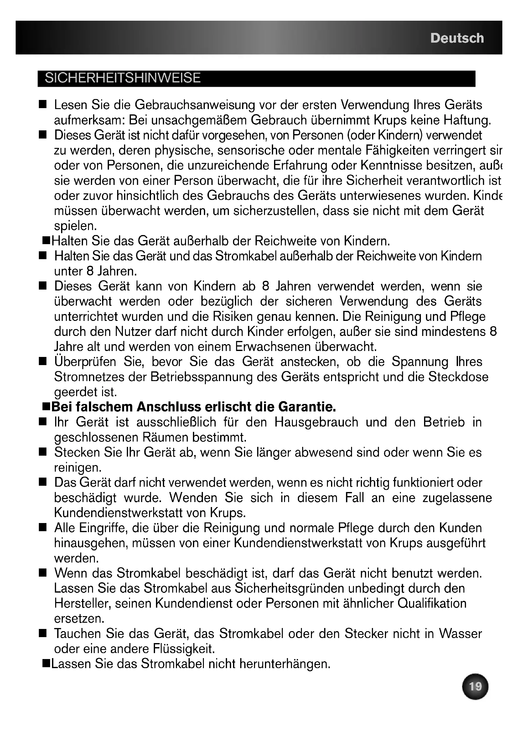 KRPS-CAFET-DUOTECH-NC0011572622/04/1309:05Page18SICHERHEITSHINWEISE n Lesen Sie die Gebrauchsanweisung vor der ersten Verwendung Ihres Geräts aufmerksam: Bei unsachgemäßem Gebrauch übernimmt Krups keine Haftung. n Dieses Gerät ist nicht dafür vorgesehen, von Personen (oder Kindern) verwendet zu werden, deren physische, sensorische oder mentale Fähigkeiten verringert sind, oder von Personen, die unzureichende Erfahrung oder Kenntnisse besitzen, außer sie werden von einer Person überwacht, die für ihre Sicherheit verantwortlich ist, oder zuvor hinsichtlich des Gebrauchs des Geräts unterwiesenes wurden. Kinder müssen überwacht werden, um sicherzustellen, dass sie nicht mit dem Gerät spielen. n Halten Sie das Gerät außerhalb der Reichweite von Kindern. n Halten Sie das Gerät und das Stromkabel außerhalb der Reichweite von Kindern unter 8 Jahren. n Dieses Gerät kann von Kindern ab 8 Jahren verwendet werden, wenn sie überwacht werden oder bezüglich der sicheren Verwendung des Geräts unterrichtet wurden und die Risiken genau kennen. Die Reinigung und Pflege durch den Nutzer darf nicht durch Kinder erfolgen, außer sie sind mindestens 8 Jahre alt und werden von einem Erwachsenen überwacht. n Überprüfen Sie, bevor Sie das Gerät anstecken, ob die Spannung Ihres Stromnetzes der Betriebsspannung des Geräts entspricht und die Steckdose geerdet ist. n Bei falschem Anschluss erlischt die Garantie. n Ihr Gerät ist ausschließlich für den Hausgebrauch und den Betrieb in geschlossenen Räumen bestimmt. n Stecken Sie Ihr Gerät ab, wenn Sie länger abwesend sind oder wenn Sie es reinigen. n Das Gerät darf nicht verwendet werden, wenn es nicht richtig funktioniert oder beschädigt wurde. Wenden Sie sich in diesem Fall an eine zugelassene Kundendienstwerkstatt von Krups. n Alle Eingriffe, die über die Reinigung und normale Pflege durch den Kunden hinausgehen, müssen von einer Kundendienstwerkstatt von Krups ausgeführt werden. n Wenn das Stromkabel beschädigt ist, darf das Gerät nicht benutzt werden. Lassen Sie das Stromkabel aus Sicherheitsgründen unbedingt durch den Hersteller, seinen Kundendienst oder Personen mit ähnlicher Qualifikation ersetzen. n Tauchen Sie das Gerät, das Stromkabel oder den Stecker nicht in Wasser oder eine andere Flüssigkeit. n Lassen Sie das Stromkabel nicht herunterhängen. Deutsch