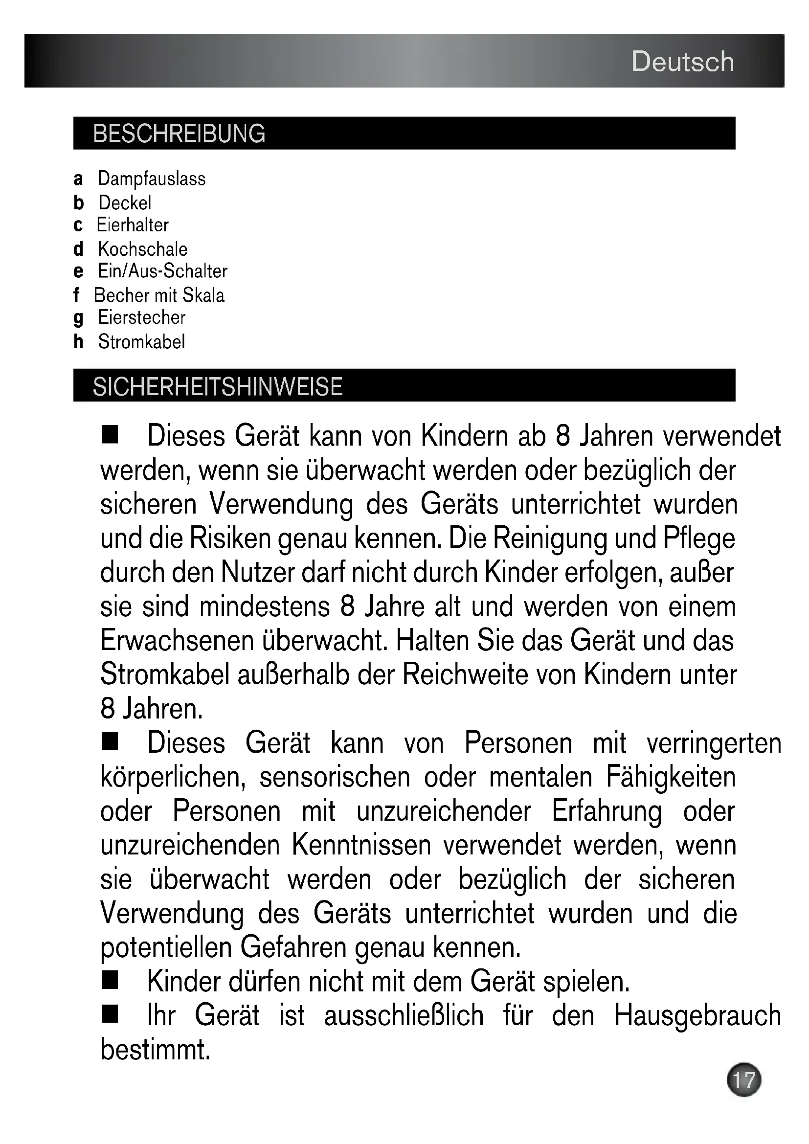 Fill the lower part of the appliance with cold water depending on the cooking method selected. Use the water jug for the quantity of water required (1 to 2). Place the egg holder on the lower part of the appliance (place the egg holder in the right way - 3). Turn the water jug and position it so it is flat with the egg piercing needle uppermost. Take each egg and place it on the Egg piercing needle so that the shell is pierced, to prevent the egg from cracking during cooking. (4). Position the eggs evenly around the egg holder. (5). Make sure to place the eggs in such a way that the opening is at the top. (If you want to cook less than seven eggs, place them along the edge of the holder). Place the lid correctly on the egg holder. (6). Unwind the power cord and plug your appliance into the mains power supply. Move the switch to the I position. (7). During cooking some hot steam will escape through the small opening on the top of the lid, this is completely normal. (8). Do not place hands over this opening in the lid during cooking. CLEANING AND MAINTENANCE: Before any cleaning or maintenance, unplug and leave the appliance to cool. The lid and egg holder are cleaned using water and washing up liquid. Wipe the appliance exterior and the cord using a damp cloth. Leave to dry. Do this regularly, ideally after each use.16 English DESCALING PROTECTING THE ENVIRONMENT! The appliance must be descaled from time to time, preferably once a month, depending on how often it is used and more frequently if the water has a high calcium content. To descale your appliance. Use: – 20 g of commercially available white vinegar added to a jug of water; – Place the liquid in the lower part of the appliance; – Allow to heat for 10 mins without a lid; – Stop the appliance, unplug and empty out the liquid; – Rinse the cooking bowl using a damp sponge; – Leave the appliance to cool; – Allow the appliance to cool down completely before storing. Your appliance contains valuable materials which can be recovered or recycled. Leave it at a local civic waste collection point or an approved service centre.17 Deutsch BESCHREIBUNG SICHERHEITSHINWEISE a Dampfauslass b Deckel c Eierhalter d Kochschale e Ein/Aus-Schalter f Becher mit Skala g Eierstecher h Stromkabel Dieses Gerät kann von Kindern ab 8 Jahren verwendet werden, wenn sie überwacht werden oder bezüglich der sicheren Verwendung des Geräts unterrichtet wurden und die Risiken genau kennen. Die Reinigung und Pflege durch den Nutzer darf nicht durch Kinder erfolgen, außer sie sind mindestens 8 Jahre alt und werden von einem Erwachsenen überwacht. Halten Sie das Gerät und das Stromkabel außerhalb der Reichweite von Kindern unter 8 Jahren. Dieses Gerät kann von Personen mit verringerten körperlichen, sensorischen oder mentalen Fähigkeiten oder Personen mit unzureichender Erfahrung oder unzureichenden Kenntnissen verwendet werden, wenn sie überwacht werden oder bezüglich der sicheren Verwendung des Geräts unterrichtet wurden und die potentiellen Gefahren genau kennen. Kinder dürfen nicht mit dem Gerät spielen. Ihr Gerät ist ausschließlich für den Hausgebrauch bestimmt.18 Deutsch Dieses Gerät darf nicht von Personen (inbegriffen Kindern) mit eingeschränkten körperlichen, sensorischen oder geistigen Fähigkeiten benutzt werden. Das Gleiche gilt für Personen, die keine Erfahrung mit dem Gerät besitzen oder sich mit ihm nicht auskennen, außer wenn sie von einer für ihre Sicherheit verantwortlichen Person beaufsichtigt werden oder von dieser mit dem Gebrauch des Gerät vertraut gemacht wurden. Kinder müssen beaufsichtigt werden, damit sie nicht mit dem Gerät spielen. Es wurde nicht entwickelt, um in folgenden, nicht von der Garantie gedeckten Fällen verwendet zu werden: – in Küchen für Mitarbeiter, in Läden, Büros und anderen gewerblichen Bereichen, – in landwirtschaftlichen Anwesen, – von Kunden in Hotels, Motels und anderen Wohneinrichtungen, – in Frühstückspensionen. Benutzen Sie das Gerät nicht, wenn es nicht fehlerfrei funktioniert, es heruntergefallen ist oder sichtbare Schäden aufweist. Um Unfälle zu vermeiden, muss eine beschädigte Zuleitung des Gerätes durch einen autorisierten Servicepartner oder eine ähnlich qualifizierte Person ersetzt werden. Achten Sie darauf, dass Sie sich nicht am Eierstecher verletzen.19 Deutsch Vorsicht: Die Oberfläche des Heizelements ist auch nach dem Gebrauch noch heiß. Vorsicht: Verletzungsgefahr bei falscher Benutzung des Gerätes. Reinigen Sie das Zubehör und die Teile, die mit Lebensmitteln in Berührung kommen, mit einem feuchten Tuch oder Schwamm mit etwas Geschirrspülmittel. Mit einem feuchten Tuch oder Schwamm abwischen. Zubehör und die Teile, die mit Lebensmitteln in Berührung kommen, mit einem trockenen Tuch abtrocknen. Um Ihre Sicherheit zu gewährleisten, entspricht dieses Gerät den gültigen Normen und Vorschriften (Richtlinien zur Niederspannung, elektromagnetischen Verträglichkeit, Lebensmittelechtheit von Materialien, Umweltverträglichkeit,...). Lesen Sie bitte die Gebrauchsanleitung sorgfältig durch und bewahren Sie diese griffbereit auf. Die Gebrauchsanleitung ist je nach mitgeliefertem Zubehör für verschiedene Modelle gültig. Lassen Sie das Gerät nie unbeaufsichtigt in Betrieb. Lassen Sie das Gerät niemals am Stromkreis, wenn es nicht in Betrieb ist. Jeder Eingriff, außer der im Haushalt üblichen Reinigung und Wartung durch den Kunden, muss durch einen autorisierten Service Partner erfolgen. Lassen Sie die Zuleitung niemals in die Nähe von oder in Berührung mit heißen Teilen des Gerätes, sich drehenden Teilen, einer Wärmequelle oder scharfen Kanten kommen. Stellen Sie das Gerät nie unter leicht entflammbare oder empfindliche Gegenstände (z.B. Vorhänge, Gardinen, etc.) Ziehen Sie niemals den Stecker an der Zuleitung aus der Steckdose. Sollten Teile des Gerätes in Brand geraten, versuchen Sie nicht die Flammen mit Wasser zu löschen. 