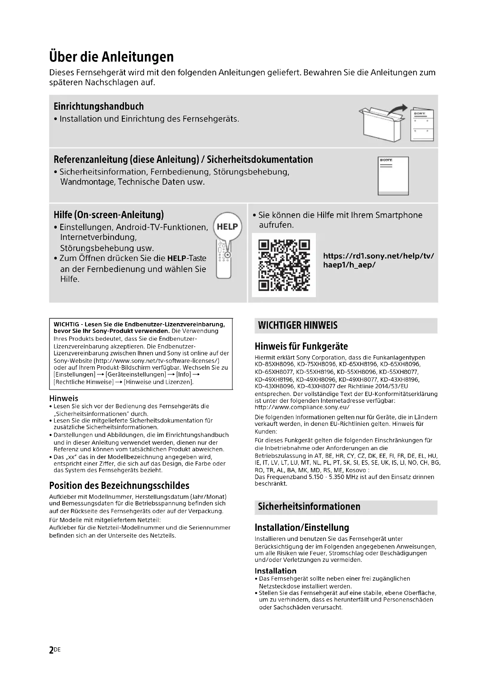- Sie können die Hilfe mit Ihrem Smartphone aufrufen. https://rd1.sony.net/help/tv/ haep1/h_aep/ WICHTIG - Lesen Sie die Endbenutzer-Lizenzvereinbarung, bevor Sie Ihr Sony-Produkt verwenden. Die Verwendung Ihres Produkts bedeutet, dass Sie die Endbenutzer- Lizenzvereinbarung akzeptieren. Die Endbenutzer- Lizenzvereinbarung zwischen Ihnen und Sony ist online auf der Sony-Website (http://www.sony.net/tv-software-licenses/) oder auf Ihrem Produkt-Bildschirm verfügbar. Wechseln Sie zu [Einstellungen] [Geräteeinstellungen] [Info] [Rechtliche Hinweise] [Hinweise und Lizenzen]. WICHTIGER HINWEIS Sicherheitsinformationen3