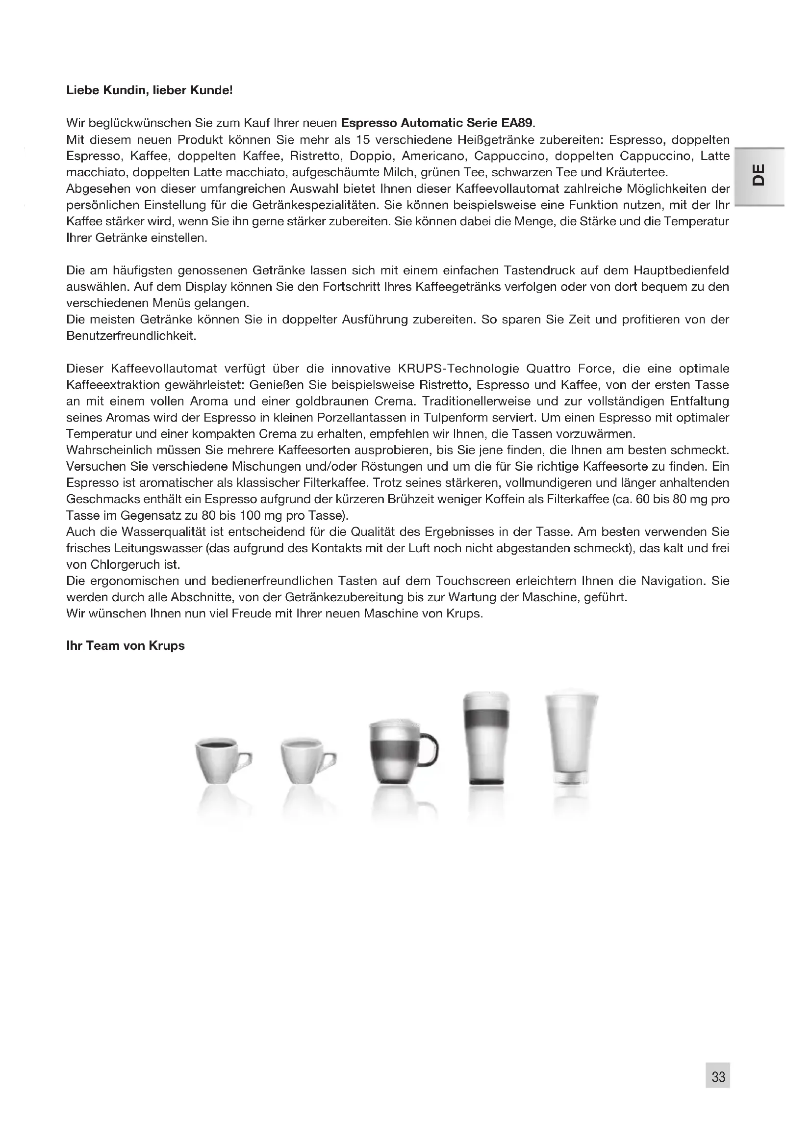 Liebe Kundin, lieber Kunde! Wir beglückwünschen Sie zum Kauf Ihrer neuen Espresso Automatic Serie EA89. Mit diesem neuen Produkt können Sie mehr als 15 verschiedene Heißgetränke zubereiten: Espresso, doppelten Espresso, Kaffee, doppelten Kaffee, Ristretto, Doppio, Americano, Cappuccino, doppelten Cappuccino, Latte macchiato, doppelten Latte macchiato, aufgeschäumte Milch, grünen Tee, schwarzen Tee und Kräutertee. Abgesehen von dieser umfangreichen Auswahl bietet Ihnen dieser Kaffeevollautomat zahlreiche Möglichkeiten der persönlichen Einstellung für die Getränkespezialitäten. Sie können beispielsweise eine Funktion nutzen, mit der Ihr Kaffee stärker wird, wenn Sie ihn gerne stärker zubereiten. Sie können dabei die Menge, die Stärke und die Temperatur Ihrer Getränke einstellen. Die am häugsten genossenen Getränke lassen sich mit einem einfachen Tastendruck auf dem Hauptbedienfeld auswählen. Auf dem Display können Sie den Fortschritt Ihres Kaffeegetränks verfolgen oder von dort bequem zu den verschiedenen Menüs gelangen. Die meisten Getränke können Sie in doppelter Ausführung zubereiten. So sparen Sie Zeit und protieren von der Benutzerfreundlichkeit. Dieser Kaffeevollautomat verfügt über die innovative KRUPS-Technologie Quattro Force, die eine optimale Kaffeeextraktion gewährleistet: Genießen Sie beispielsweise Ristretto, Espresso und Kaffee, von der ersten Tasse an mit einem vollen Aroma und einer goldbraunen Crema. Traditionellerweise und zur vollständigen Entfaltung seines Aromas wird der Espresso in kleinen Porzellantassen in Tulpenform serviert. Um einen Espresso mit optimaler Temperatur und einer kompakten Crema zu erhalten, empfehlen wir Ihnen, die Tassen vorzuwärmen. Wahrscheinlich müssen Sie mehrere Kaffeesorten ausprobieren, bis Sie jene nden, die Ihnen am besten schmeckt. Versuchen Sie verschiedene Mischungen und/oder Röstungen und um die für Sie richtige Kaffeesorte zu nden. Ein Espresso ist aromatischer als klassischer Filterkaffee. Trotz seines stärkeren, vollmundigeren und länger anhaltenden Geschmacks enthält ein Espresso aufgrund der kürzeren Brühzeit weniger Koffein als Filterkaffee (ca. 60 bis 80 mg pro Tasse im Gegensatz zu 80 bis 100 mg pro Tasse). Auch die Wasserqualität ist entscheidend für die Qualität des Ergebnisses in der Tasse. Am besten verwenden Sie frisches Leitungswasser (das aufgrund des Kontakts mit der Luft noch nicht abgestanden schmeckt), das kalt und frei von Chlorgeruch ist. Die ergonomischen und bedienerfreundlichen Tasten auf dem Touchscreen erleichtern Ihnen die Navigation. Sie werden durch alle Abschnitte, von der Getränkezubereitung bis zur Wartung der Maschine, geführt. Wir wünschen Ihnen nun viel Freude mit Ihrer neuen Maschine von Krups. Ihr Team von Krups34 35