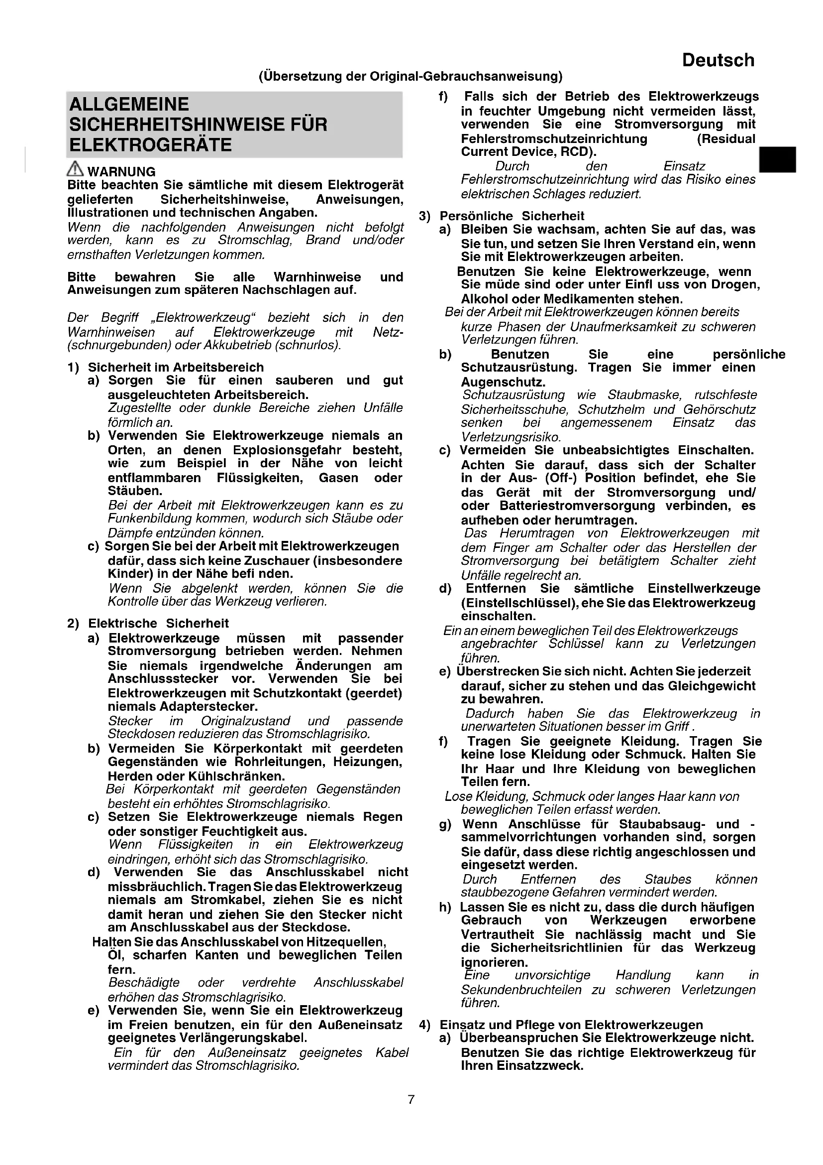 ELEKTROGERÄTE WARNUNG Bitte beachten Sie sämtliche mit diesem Elektrogerät gelieferten Sicherheitshinweise, Anweisungen, Illustrationen und technischen Angaben. Wenn die nachfolgenden Anweisungen nicht befolgt werden, kann es zu Stromschlag, Brand und/oder ernsthaften Verletzungen kommen. Bitte bewahren Sie alle Warnhinweise und Anweisungen zum späteren Nachschlagen auf. Der Begriff „Elektrowerkzeug“ bezieht sich in den Warnhinweisen auf Elektrowerkzeuge mit Netz- (schnurgebunden) oder Akkubetrieb (schnurlos).