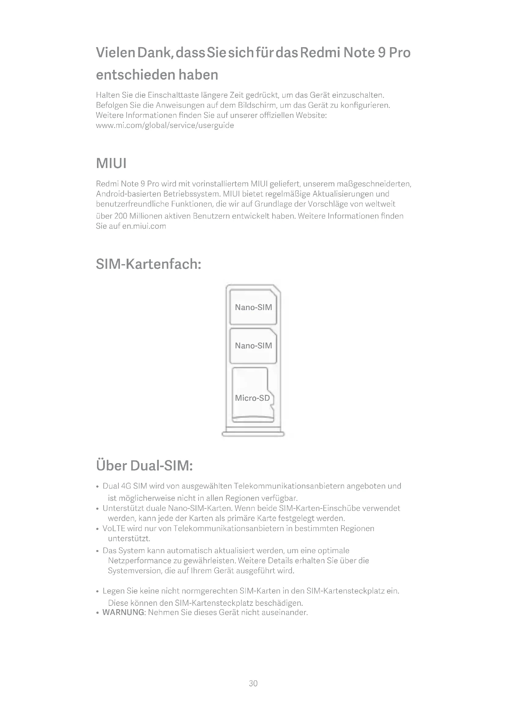 29Vielen Dank, dass Sie sich für das Redmi Note 9 Pro entschieden haben Halten Sie die Einschalaste längere Zeit gedrückt, um das Gerät einzuschalten. Befolgen Sie die Anweisungen auf dem Bildschirm, um das Gerät zu konfigurieren. Weitere Informationen finden Sie auf unserer offiziellen Website: www.mi.com/global/service/userguide MIUI Redmi Note 9 Pro wird mit vorinstalliertem MIUI geliefert, unserem maßgeschneiderten, Android-basierten Betriebssystem. MIUI bietet regelmäßige Aktualisierungen und benutzerfreundliche Funktionen, die wir auf Grundlage der Vorschläge von weltweit über 200 Millionen aktiven Benutzern entwickelt haben. Weitere Informationen finden Sie auf en.miui.com SIM-Kartenfach: Micro-SD Nano-SIM Nano-SIM Über Dual-SIM: