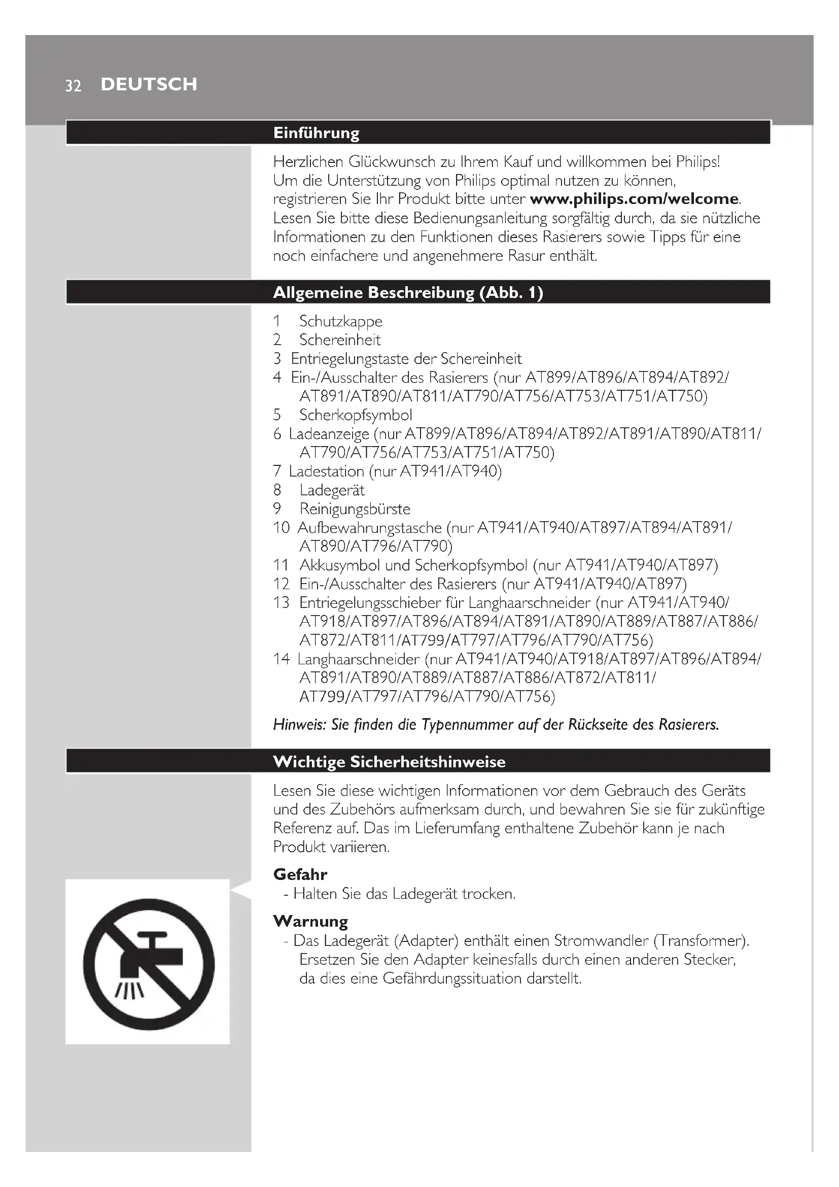 DANSK288 Placer tappen på skærhovedet i rillerne øverst på shaveren. Luk derefter skærhovedet. Bemærk: Hvis skærhovedet ikke lukker uden modstand, skal du kontrollere, at du har placeret skærene korrekt, og at samlerammen er låst. 9 Tryk på tænd/sluk-knappen, og hold den inde i 5 sekunder for at nulstille udskiftningspåmindelsen på shaveren. Den orange lampe slukkes. Bestilling af tilbehør For at købe tilbehør eller reservedele kan du besøge www.shop.philips.com/service eller gå til din Philips-forhandler. Du kan også kontakte det lokale Philips Kundecenter i dit land (se folderen “World-Wide Guarantee” for at få kontaktoplysninger). For at opretholde shaverens ydeevne skal du sørge for at rengøre den regelmæssigt og udskifte skærene som anbefalet. Skær - Vi anbefaler, at du udskifter skærene hvert andet år. Udskift altid med HQ9 (AT941/AT940) or HQ8 (AT897/AT896/AT894/AT891/ AT890/AT889/AT887/AT886/AT872/AT811/AT799/T797/AT796/ AT790/AT770/AT756/AT753/AT751/AT750) Philips-skær. Rengøring - Brug rengøringsspray (HQ110) til at rengøre skærene grundigt. Genanvendelse - Dette symbol på et produkt betyder, at produktet er omfattet af EU-direktivet 2012/19/EU. 5 sec. DANSK 29- Dette symbol betyder, at produktet indeholder et indbygget, genopladeligt batteri omfattet af EU-direktivet 2006/66/EF, som ikke må bortskaffes sammen med almindeligt husholdningsaffald. Vi anbefaler på det kraftigste, at du aeverer produktet på et ofcielt indsamlingssted eller hos en Philips-forhandler, hvor du kan få en fagmand til at tage det genopladelige batteri ud. - Hold dig orienteret om systemet for særskilt indsamling af elektriske og elektroniske produkter og genopladelige batterier. Følg lokale regler, og bortskaf aldrig produktet og de genopladelige batterier med almindeligt husholdningsaffald. Korrekt bortskaffelse af udtjente produkter og genopladelige batterier er med til at forhindre negativ påvirkning af miljøet og menneskers helbred. Udtagning af det genopladelige shaverbatteri Tag ikke det genopladelige batteri ud, før shaveren til sin tid skal kasseres. Sørg for, at batteriet er fuldstændigt aadet, inden det tages ud. 1 Løsn skruerne på bagsiden af shaveren og i skægkammeret. 2 Fjern front- og bagpanel. 3 Bøj de 6 hager ud til siden, og løft motorenheden op. Pas på, hagerne er skarpe. 4 Fjern det genopladelige batteri. Reklamationsret og support Hvis du har brug for hjælp eller support, bedes du besøge www.philips.com/support eller læse i den separate folder “World- Wide Guarantee”. Gældende forbehold i reklamationsretten Skærene (knive og lamelkapper) er ikke omfattet af den internationale garanti, da de udsættes for slitage. Fejlnding Dette kapitel opsummerer de mest almindelige problemer, der kan forekomme ved brug af apparatet. Har du brug for yderligere hjælp og vejledning, så besøg www.philips.com/support for en liste af ofte stillede spørgsmål eller kontakt dit lokale Philips Kundecenter. DANSK30DANSK 31 Problem Mulig årsag Løsning Shaveren barberer ikke så godt, som den gjorde til at begynde med. Skærene er beskadigede eller slidte. Udskift skærene (se afsnittet “Udskiftning”). Skum- eller gelrester tilstopper skærene. Skyl skærenheden under den varme hane (se afsnittet “Rengøring og vedligeholdelse”). Der sidder lange hår i vejen for skærene. Rengør skærene et ad gangen (se afsnittet “Rengøring og vedligeholdelse”). Du har ikke sat skærene korrekt i. Sørg for, at de små tappe passer præcist ned i fordybningerne (se kapitlet “Rengøring og vedligeholdelse”). Shaveren virker ikke, når jeg trykker på tænd/sluk-knappen. Det genopladelige batteri er aadet. Genoplad batteriet (se kapitlet “Opladning”). Temperaturen i shaveren er for høj. I dette tilfælde vil shaveren ikke fungere. Så snart shaverens temperatur er faldet tilstrækkeligt, kan shaveren tændes igen. Shaveren virker ikke, selvom den er tilsluttet stikkontakten. Shaveren er ikke designet til at blive brugt direkte fra stikkontakten. Genoplad batteriet (Se kapitlet “Opladning”), og tag det ud af stikket.32 Einführung Herzlichen Glückwunsch zu Ihrem Kauf und willkommen bei Philips! Um die Unterstützung von Philips optimal nutzen zu können, registrieren Sie Ihr Produkt bitte unter www.philips.com/welcome. Lesen Sie bitte diese Bedienungsanleitung sorgfältig durch, da sie nützliche Informationen zu den Funktionen dieses Rasierers sowie Tipps für eine noch einfachere und angenehmere Rasur enthält. Allgemeine Beschreibung (Abb. 1) 1 Schutzkappe 2 Schereinheit 3 Entriegelungstaste der Schereinheit 4 Ein-/Ausschalter des Rasierers (nur AT899/AT896/AT894/AT892/ AT891/AT890/AT811/AT790/AT756/AT753/AT751/AT750) 5 Scherkopfsymbol 6 Ladeanzeige (nur AT899/AT896/AT894/AT892/AT891/AT890/AT811/ AT790/AT756/AT753/AT751/AT750) 7 Ladestation (nur AT941/AT940) 8 Ladegerät 9 Reinigungsbürste 10 Aufbewahrungstasche (nur AT941/AT940/AT897/AT894/AT891/ AT890/AT796/AT790) 11 Akkusymbol und Scherkopfsymbol (nur AT941/AT940/AT897) 12 Ein-/Ausschalter des Rasierers (nur AT941/AT940/AT897) 13 Entriegelungsschieber für Langhaarschneider (nur AT941/AT940/ AT918/AT897/AT896/AT894/AT891/AT890/AT889/AT887/AT886/ AT872/AT811/AT799/AT797/AT796/AT790/AT756) 14 Langhaarschneider (nur AT941/AT940/AT918/AT897/AT896/AT894/ AT891/AT890/AT889/AT887/AT886/AT872/AT811/ AT799/AT797/AT796/AT790/AT756) Hinweis: Sie nden die Typennummer auf der Rückseite des Rasierers. Wichtige Sicherheitshinweise Lesen Sie diese wichtigen Informationen vor dem Gebrauch des Geräts und des Zubehörs aufmerksam durch, und bewahren Sie sie für zukünftige Referenz auf. Das im Lieferumfang enthaltene Zubehör kann je nach Produkt variieren. Gefahr - Halten Sie das Ladegerät trocken. Warnung - Das Ladegerät (Adapter) enthält einen Stromwandler (Transformer). Ersetzen Sie den Adapter keinesfalls durch einen anderen Stecker, da dies eine Gefährdungssituation darstellt. DEUTS