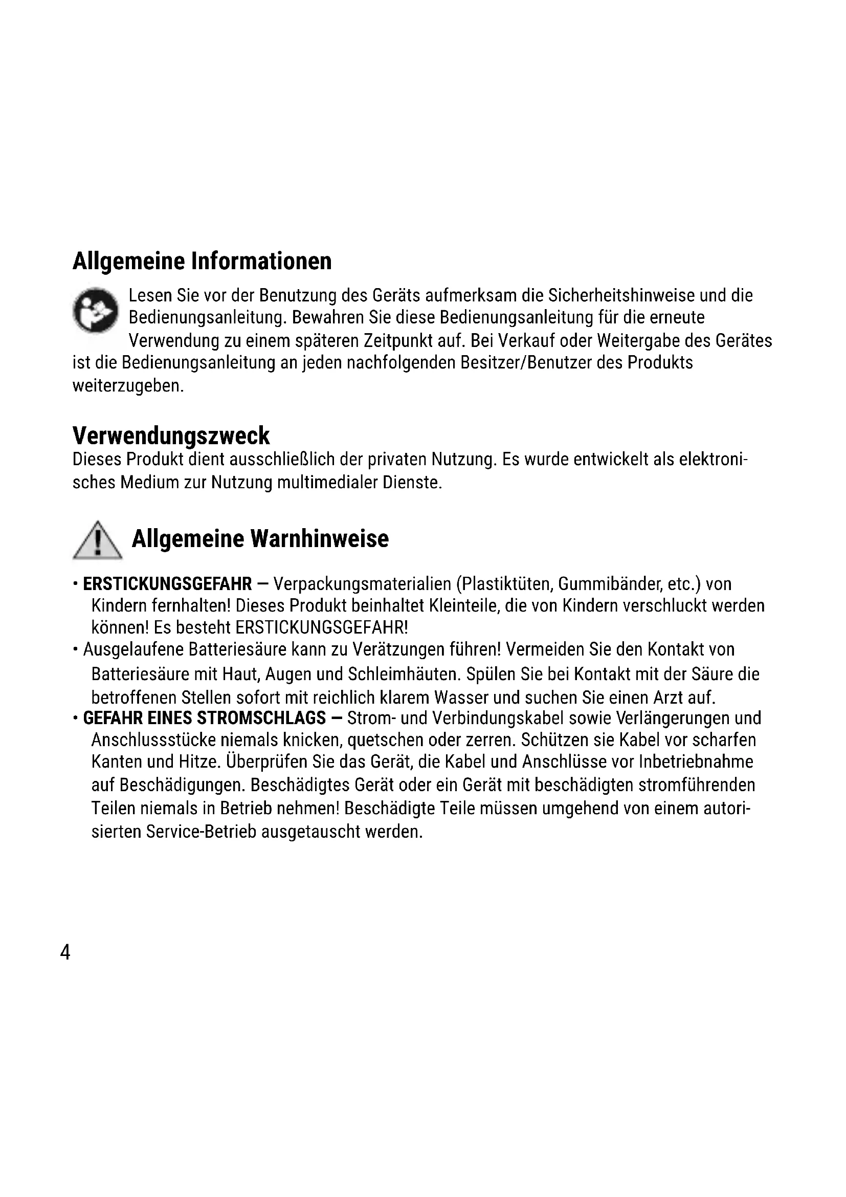www.bresser.de/warranty_terms SERVICE AND WARRANTY: DE4 Allgemeine Informationen Lesen Sie vor der Benutzung des Geräts aufmerksam die Sicherheitshinweise und die Bedienungsanleitung. Bewahren Sie diese Bedienungsanleitung für die erneute Verwendung zu einem späteren Zeitpunkt auf. Bei Verkauf oder Weitergabe des Gerätes ist die Bedienungsanleitung an jeden nachfolgenden Besitzer/Benutzer des Produkts weiterzugeben. Verwendungszweck Dieses Produkt dient ausschließlich der privaten Nutzung. Es wurde entwickelt als elektroni- sches Medium zur Nutzung multimedialer Dienste. Allgemeine Warnhinweise