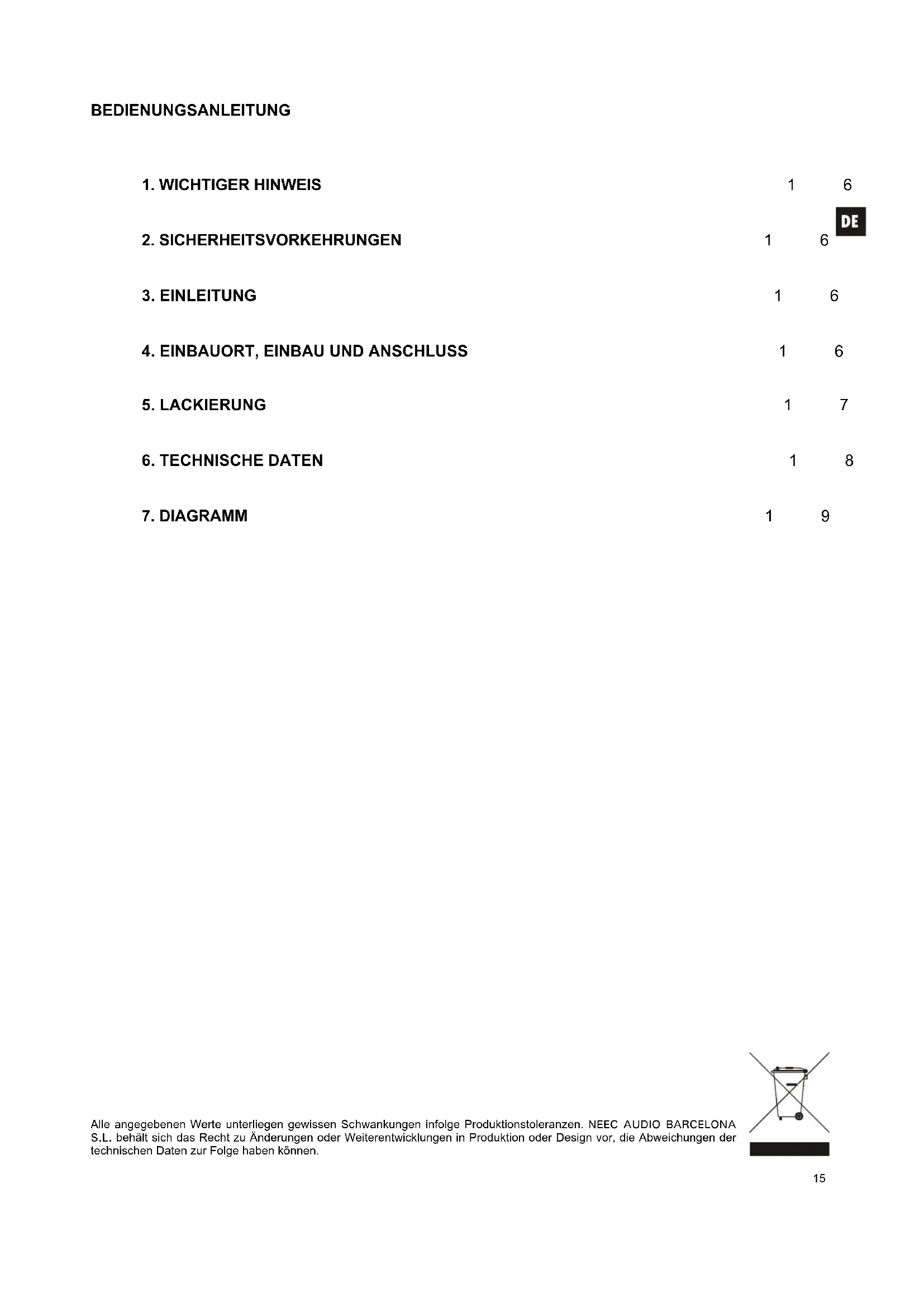 Alle angegebenen Werte unterliegen gewissen Schwankungen infolge Produktionstoleranzen. NEEC AUDIO BARCELONA S.L. behält sich das Recht zu Änderungen oder Weiterentwicklungen in Produktion oder Design vor, die Abweichungen der technischen Daten zur Folge haben können.16
