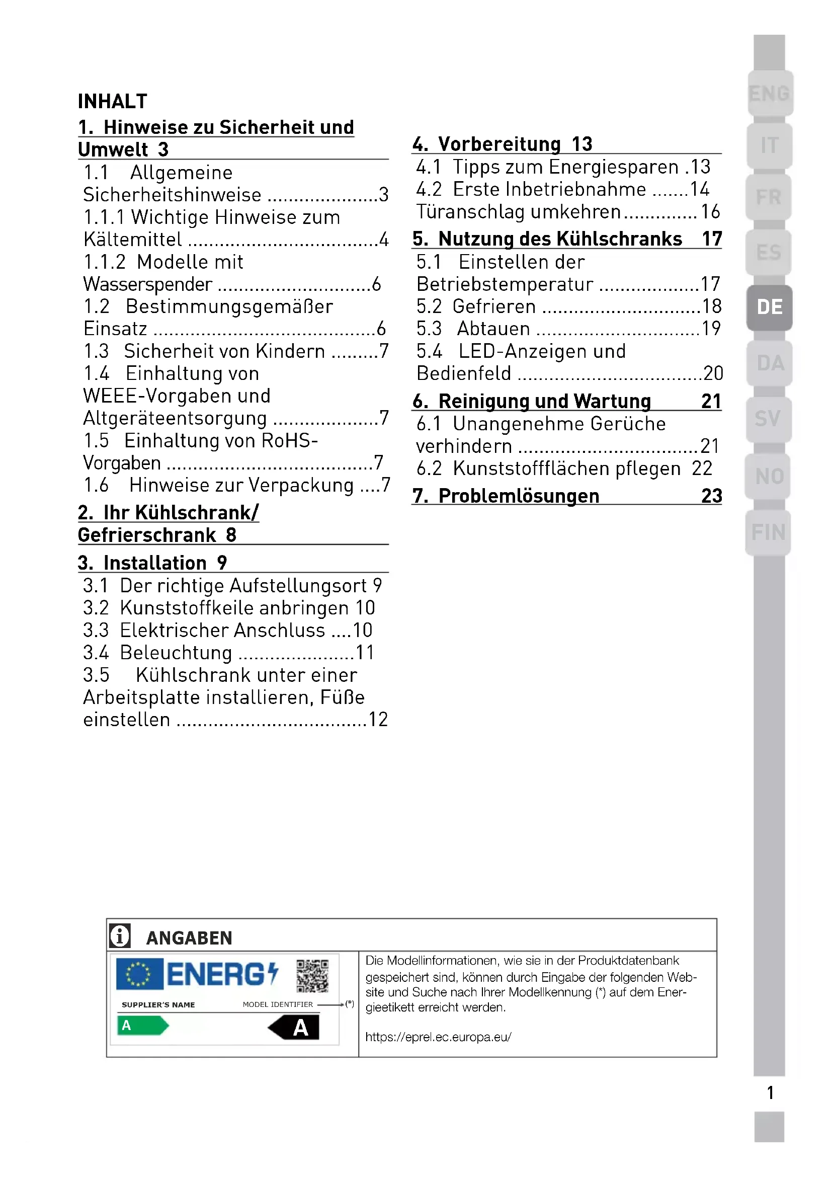 ANGABEN Die Modellinformationen, wie sie in der Produktdatenbank gespeichert sind, können durch Eingabe der folgenden Web-site und Suche nach Ihrer Modellkennung (*) auf dem Ener-gieetikett erreicht werden.https://eprel.ec.europa.eu/