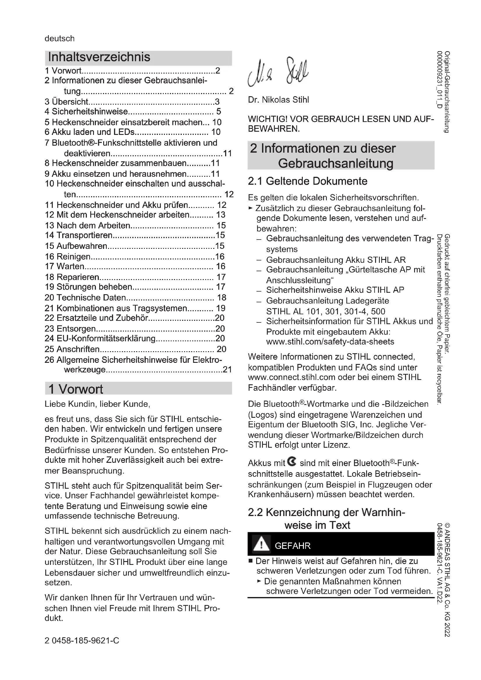 - 26 Allgemeine Sicherheitshinweise für Elektro‐ werkzeuge 1 Vorwort Liebe Kundin, lieber Kunde, es freut uns, dass Sie sich für STIHL entschie‐ den haben. Wir entwickeln und fertigen unsere Produkte in Spitzenqualität entsprechend der Bedürfnisse unserer Kunden. So entstehen Pro‐ dukte mit hoher Zuverlässigkeit auch bei extre‐ mer Beanspruchung. STIHL steht auch für Spitzenqualität beim Ser‐ vice. Unser Fachhandel gewährleistet kompe‐ tente Beratung und Einweisung sowie eine umfassende technische Betreuung. STIHL bekennt sich ausdrücklich zu einem nach‐ haltigen und verantwortungsvollen Umgang mit der Natur. Diese Gebrauchsanleitung soll Sie unterstützen, Ihr STIHL Produkt über eine lange Lebensdauer sicher und umweltfreundlich einzu‐ setzen. Wir danken Ihnen für Ihr Vertrauen und wün‐ schen Ihnen viel Freude mit Ihrem STIHL Pro‐ dukt. Dr. Nikolas Stihl p. 21