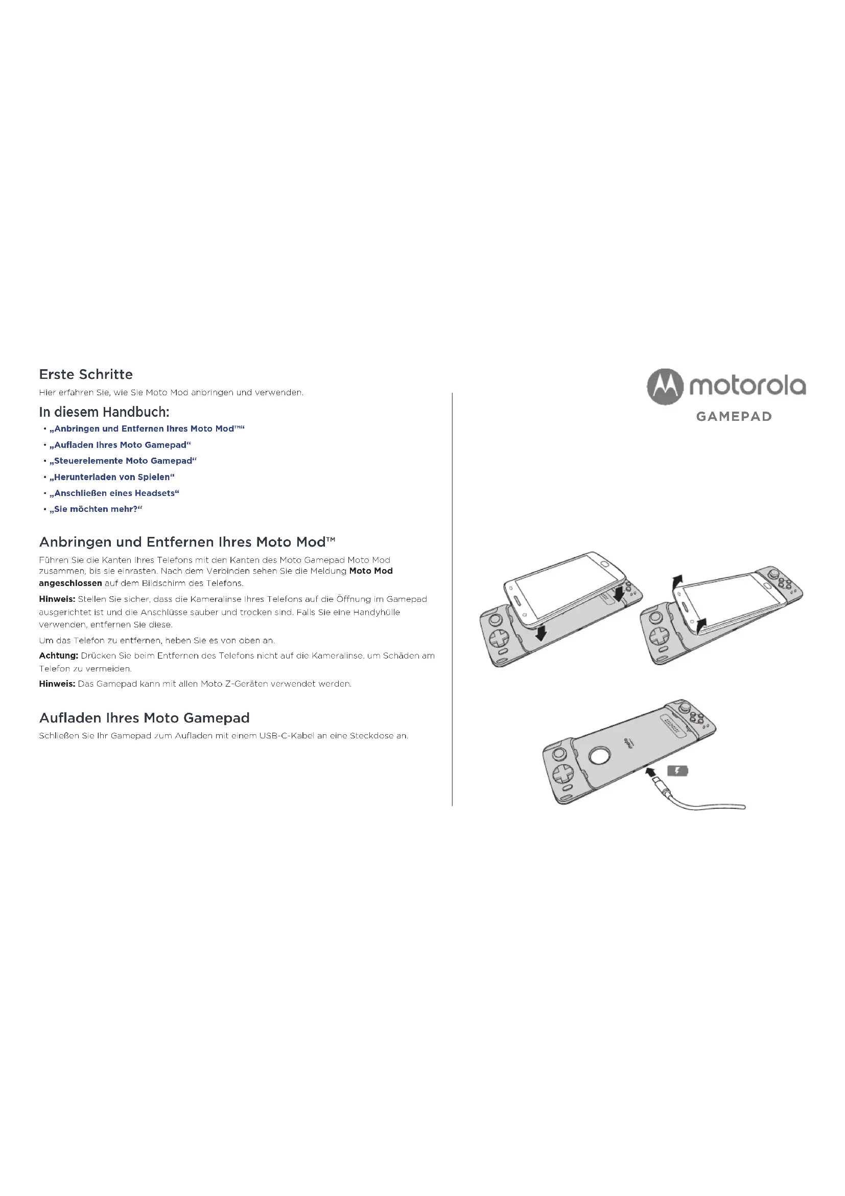 - Moto Mods sind separat erhältlich. Sehen Sie sich die vollständige Sammlung an unter www.motomods.com.Kinder Halten Sie das Mobilgerät und das Zubehör von Kleinkindern fern. Diese Produkte sind kein Spielzeug und sind für Kleinkinder potenziell gefährlich. Abnehmbare Kleinteile können beispielsweise verschluckt werden und zum Ersticken führen. Überwachen Sie den Zugri auf das Mobilgerät. Falls ein Kind das Mobilgerät oder dessen Zubehör verwendet, überwachen Sie das Kind zu seiner Sicherheit beim Zugri auf das Gerät, um Datenverlust oder den überraschenden Anfall von Entgelten für die Lieferung von Daten oder Anwendungen zu vermeiden. Epileptische Anfälle, Ohnmachtsanfälle, Überanstrengung der Augen und Verspannungen Der längere Gebrauch eines Geräts könnte zu Verspannungen in Händen, Fingern, Armen, im Nackenbereich und anderen Teilen Ihres Körpers führen sowie zu Überanstrengung der Augen und Kopfschmerzen führen. Sie sollten Ihr Gerät in einer sicheren Umgebung mit angenehmen Lichtverhältnissen verwenden und mehrere Pausen einlegen, wenn Beschwerden auftreten. Suchen Sie ärztliche Hilfe auf, falls die Symptome anhalten. In seltenen Fällen können flackernde Muster oder Lichter, z. B. in Videospielen oder Filmen, epileptische Anfälle oder Ohnmachtsanfälle auslösen. Falls Sie epileptische Anfälle oder Ohnmachtsanfälle erleiden oder in der Vergangenheit schon einmal epileptische Anfälle erlitten haben, verwenden Sie Ihr Gerät nicht mehr und suchen Sie ärztliche Hilfe auf. Urheberrecht und Warenzeichen Motorola Mobility LLC 222 W. Merchandise Mart Plaza Chicago, IL 60654 www.motorola.com Bestimmte Funktionen, Dienste und Anwendungen sind netzwerkabhängig und u. U. nicht in allen Regionen verfügbar. Es können zusätzliche Bedingungen, Bestimmungen und/oder Änderungen gelten. Weitere Informationen erhalten Sie von Ihrem Mobilfunkanbieter. Alle Funktionen, Funktionalitäten und andere Produktspezifikationen sowie die in diesem Handbuch enthaltenen Informationen basieren auf den neuesten verfügbaren Informationen, die zum Zeitpunkt des Drucks für korrekt befunden wurden. Motorola behält sich das Recht vor, Informationen oder Spezifikationen ohne Ankündigung oder Verpflichtungen zu ändern. Hinweis: Die Bilder in diesem Handbuch sind lediglich Beispiele. MOTOROLA, das Logo mit dem stilisierten M, MOTO und die MOTO-Markenfamilie sind Marken oder eingetragene Marken von Motorola Trademark Holdings, LLC. LENOVO ist eine Marke von Motorola. Google, Android, Google Play und andere Marken sind Marken von Google Inc. Das microSD-Logo ist eine Marke von SD-3C, LLC. Alle sonstigen Produkt- oder Dienstleistungsnamen sind das Eigentum ihrer jeweiligen Inhaber. © 2017 Motorola Mobility LLC. Alle Rechte vorbehalten. Produkt-ID: Moto Gamepad (MD100G) Handbuchnummer: SSC8C20167-ACome iniziare Vi forniremo le istruzioni per collegare e utilizzare il Moto Mod. In questa guida: