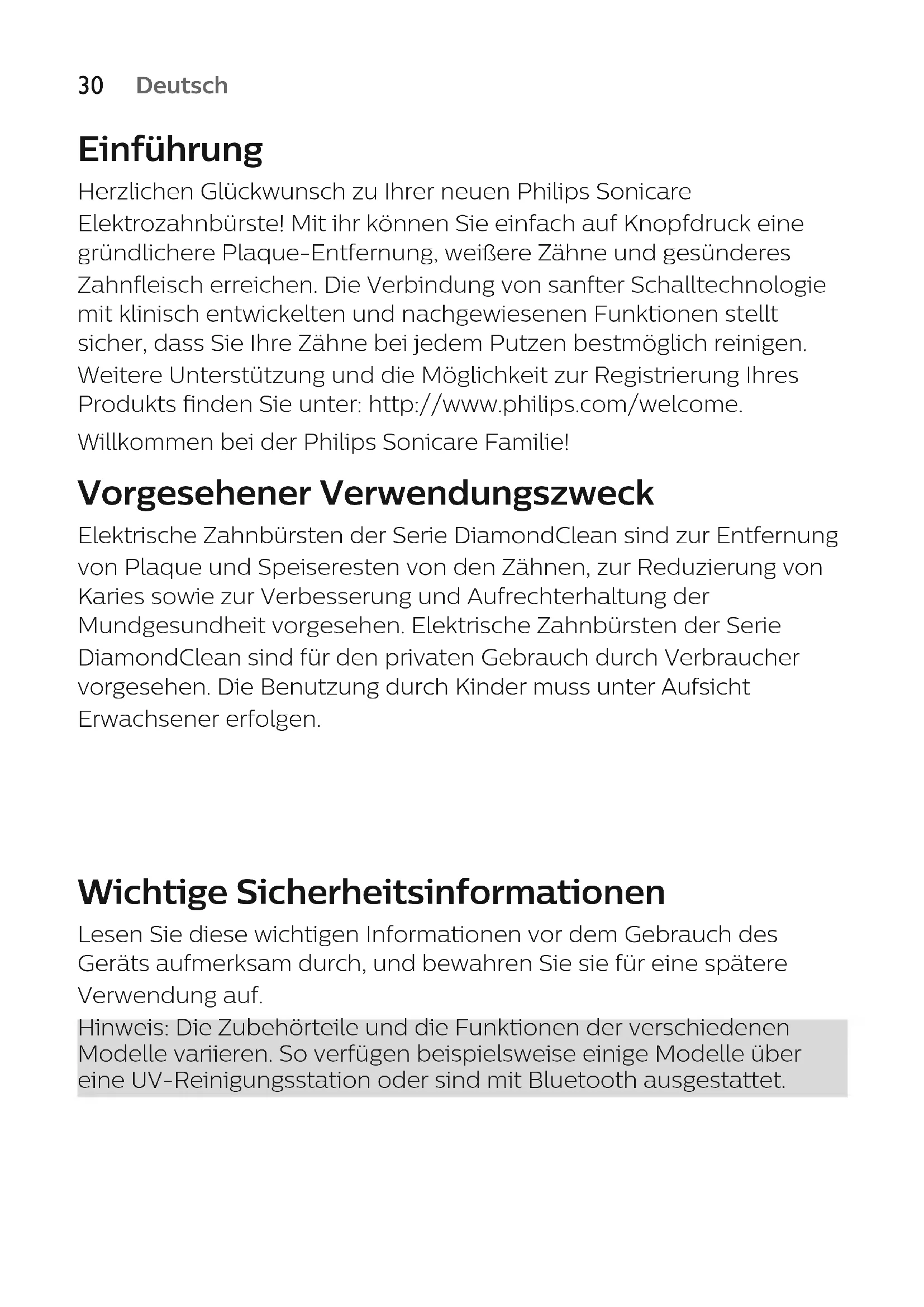 EnglishDeutsch Einführung Herzlichen Glückwunsch zu Ihrer neuen Philips Sonicare Elektrozahnbürste! Mit ihr können Sie einfach auf Knopfdruck eine gründlichere Plaque-Entfernung, weißere Zähne und gesünderes Zahnfleisch erreichen. Die Verbindung von sanfter Schalltechnologie mit klinisch entwickelten und nachgewiesenen Funktionen stellt sicher, dass Sie Ihre Zähne bei jedem Putzen bestmöglich reinigen. Weitere Unterstützung und die Möglichkeit zur Registrierung Ihres Produkts finden Sie unter: http://www.philips.com/welcome. Willkommen bei der Philips Sonicare Familie! Vorgesehener Verwendungszweck Elektrische Zahnbürsten der Serie DiamondClean sind zur Entfernung von Plaque und Speiseresten von den Zähnen, zur Reduzierung von Karies sowie zur Verbesserung und Aufrechterhaltung der Mundgesundheit vorgesehen. Elektrische Zahnbürsten der Serie DiamondClean sind für den privaten Gebrauch durch Verbraucher vorgesehen. Die Benutzung durch Kinder muss unter Aufsicht Erwachsener erfolgen. Wichtige Sicherheitsinformationen Lesen Sie diese wichtigen Informationen vor dem Gebrauch des Geräts aufmerksam durch, und bewahren Sie sie für eine spätere Verwendung auf. Hinweis: Die Zubehörteile und die Funktionen der verschiedenen Modelle variieren. So verfügen beispielsweise einige Modelle über eine UV-Reinigungsstation oder sind mit Bluetooth ausgestattet.