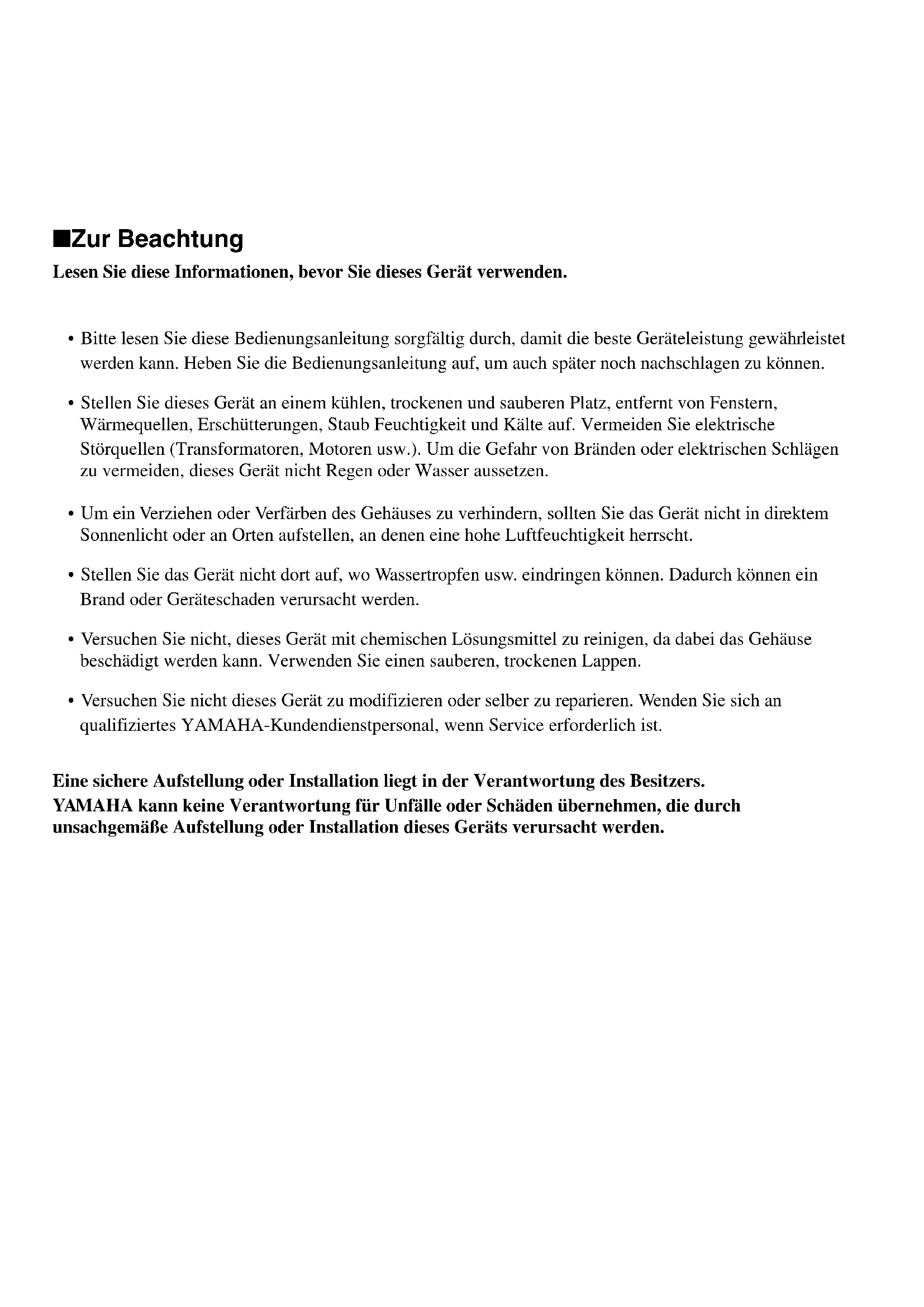 - Stellen Sie das Gerät nicht dort auf, wo Wassertropfen usw. eindringen können. Dadurch können ein Brand oder Geräteschaden verursacht werden.