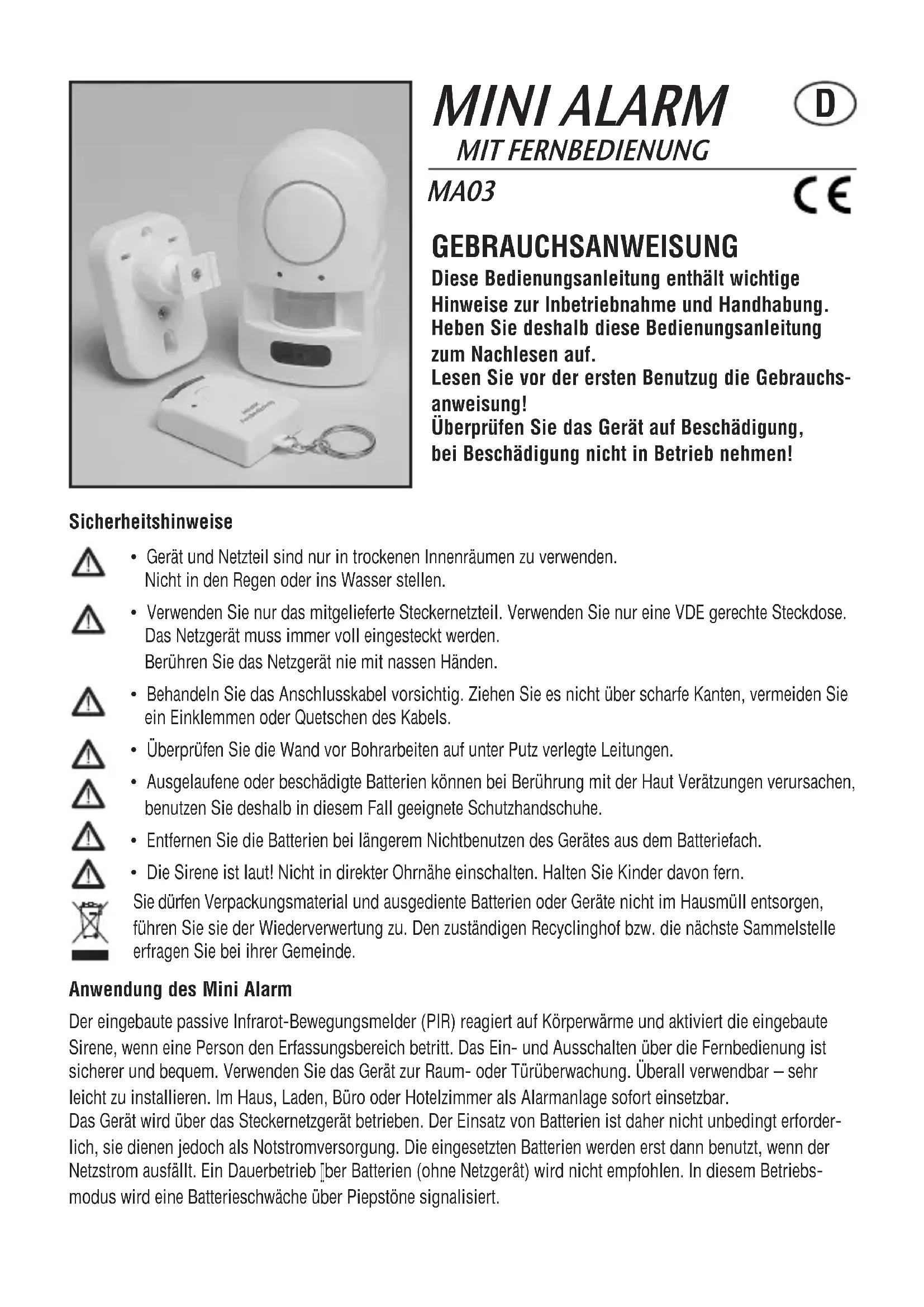 Sicherheitshinweise• Gerät und Netzteil sind nur in trockenen Innenräumen zu verwenden. Nicht in den Regen oder ins Wasser stellen.• Verwenden Sie nur das mitgelieferte Steckernetzteil. Verwenden Sie nur eine VDE gerechte Steckdose.Das Netzgerät muss immer voll eingesteckt werden. Berühren Sie das Netzgerät nie mit nassen Händen.• Behandeln Sie das Anschlusskabel vorsichtig. Ziehen Sie es nicht über scharfe Kanten, vermeiden Sieein Einklemmen oder Quetschen des Kabels. • Überprüfen Sie die Wand vor Bohrarbeiten auf unter Putz verlegte Leitungen.• Ausgelaufene oder beschädigte Batterien können bei Berührung mit der Haut Verätzungen verursachen,benutzen Sie deshalb in diesem Fall geeignete Schutzhandschuhe. • Entfernen Sie die Batterien bei längerem Nichtbenutzen des Gerätes aus dem Batteriefach.• Die Sirene ist laut! Nicht in direkter Ohrnähe einschalten. Halten Sie Kinder davon fern. Sie dürfen Verpackungsmaterial und ausgediente Batterien oder Geräte nicht im Hausmüll entsorgen, führen Sie sie der Wiederverwertung zu. Den zuständigen Recyclinghof bzw. die nächste Sammelstelleerfragen Sie bei ihrer Gemeinde.Anwendung des Mini AlarmDer eingebaute passive Infrarot-Bewegungsmelder (PIR) reagiert auf Körperwärme und aktiviert die eingebaute Sirene, wenn eine Person den Erfassungsbereich betritt. Das Ein- und Ausschalten über die Fernbedienung ist sicherer und bequem. Verwenden Sie das Gerät zur Raum- oder Türüberwachung. Überall verwendbar – sehrleicht zu installieren. Im Haus, Laden, Büro oder Hotelzimmer als Alarmanlage sofort einsetzbar.Das Gerät wird über das Steckernetzgerät betrieben. Der Einsatz von Batterien ist daher nicht unbedingt erforder-lich, sie dienen jedoch als Notstromversorgung. Die eingesetzten Batterien werden erst dann benutzt, wenn derNetzstrom ausfällt. Ein Dauerbetrieb ∏ber Batterien (ohne Netzgerât) wird nicht empfohlen. In diesem Betriebs-modus wird eine Batterieschwäche über Piepstöne signalisiert. MINI ALARM MIT FERNBEDIENUNG MA03 GEBRAUCHSANWEISUNG Diese Bedienungsanleitung enthält wichtige Hinweise zur Inbetriebnahme und Handhabung. Heben Sie deshalb diese Bedienungsanleitung zum Nachlesen auf. Lesen Sie vor der ersten Benutzug die Gebrauchs- anweisung! Überprüfen Sie das Gerät auf Beschädigung, bei Beschädigung nicht in Betrieb nehmen! DTechnische Daten Alar mgerät Stromversorgung: Steckernetzgerät 9 Volt, 200 mA (Innenpol des Steckers negativ) Notstromversorgung: 4 x AA Batterien (alkalisch) 1,5 Volt (Mignonzellen) Stromverbrauch: 1 mA (Bereitschaft), 120 mA bei Alarm Sensor: Passiver Infrarot- Bewegungsmelder (PIR) PIR- Reichweite: ca. 6 m Entfernung x 90° (bei 2 m Montagehöhe) Alarmgeber: Piezoalarm 100 dB Steuerung: über Infrarot-Fernbedienung Anwendungsbereich: Nur in trockenen Räumen, vor Nässe und Frost schützen Betriebstemperatur: 0° C bis +35° C, Optimale Funktion bei Raumtemperatur (20° C). Sehr hohe oder tiefe Temperaturen können zu Funktionsbeeinträchtigung führen, insbesondere bei Batteriebe- trieb. Lieferumfang Alarmgerät Netzgerät (bei Modell MA03) grüne LED Anschluß für Netzgerät rote LED Empfänger für Fernbedienung rote LED EIN/AUS Knopf Fernbedienung (inkl. Batterie) Wandhalterung Wandhalterung einsetzenBatterie einsetzen Abb. 1 Abb. 2 Abb. 3 Fernbedienung Art: Infrarot Ch. B Stromversorgung: 1 x 12 Volt Batterie, Typ 23 A/MN21 (Feuerzeugzelle) Zusätzliche Fernbedienung (FB02 Art.-Nr. 33314) ist erhältlich. DInbetriebnahme Einsetzen der Batterien (Alar mgerät) Batteriefachdeckel an der Rückseite des Gerätes nach unten schieben (Abb. 1). 4 St. AA Batterien (alkalisch) ins Batteriefach einsetzen. Polarität (+/-) beachten. Deckel wieder einsetzen. Einsetzen der Batterien (Fer nbedienung) Eine Batterie wurde schon im Werk eingesetzt. Um die Batterie zu ersetzen, lösen Sie die Schraube, und entfernen Sie das Rückenteil der Fernbedienung (Abb. 2). Ersetzen Sie die Batterie (Typ 23 A) – Polarität (+/-) beachten. Netzgerät anschließen Stecker vom Netzgerätkabel seitlich ins Gerät stecken. Netzgerät dann in eine 230 V Steckdose einstecken. Prüfen des Er fassungsbereiches Das Gerät befindet sich im ausgeschalteten Modus. Bewegen Sie sich im gewünschten Erfassungsbereich. Die rote Lampe hinter der Sensorlinse leuchtet bei erfasster Bewegung kurz auf. Aufstellungsort