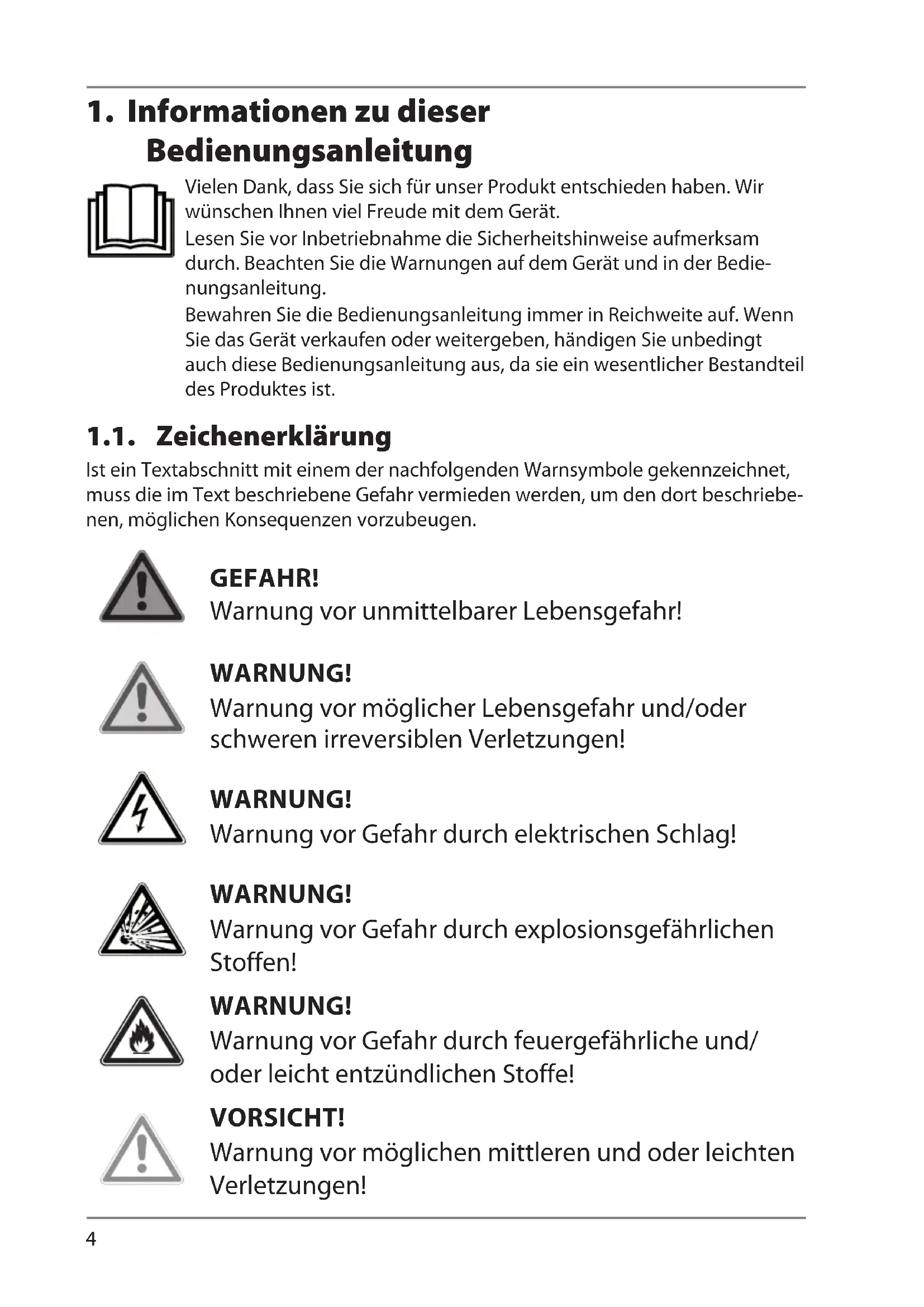 Bedienungsanleitung Vielen Dank, dass Sie sich für unser Produkt entschieden haben. Wir wünschen Ihnen viel Freude mit dem Gerät. Lesen Sie vor Inbetriebnahme die Sicherheitshinweise aufmerksam durch. Beachten Sie die Warnungen auf dem Gerät und in der Bedie- nungsanleitung. Bewahren Sie die Bedienungsanleitung immer in Reichweite auf. Wenn Sie das Gerät verkaufen oder weitergeben, händigen Sie unbedingt auch diese Bedienungsanleitung aus, da sie ein wesentlicher Bestandteil des Produktes ist. 1.1. Zeichenerklärung Ist ein Textabschnitt mit einem der nachfolgenden Warnsymbole gekennzeichnet, muss die im Text beschriebene Gefahr vermieden werden, um den dort beschriebe- nen, möglichen Konsequenzen vorzubeugen. GEFAHR! Warnung vor unmittelbarer Lebensgefahr! WARNUNG! Warnung vor möglicher Lebensgefahr und/oder schweren irreversiblen Verletzungen! WARNUNG! Warnung vor Gefahr durch elektrischen Schlag! WARNUNG! Warnung vor Gefahr durch explosionsgefährlichen Stoffen! WARNUNG! Warnung vor Gefahr durch feuergefährliche und/ oder leicht entzündlichen Stoffe! VORSICHT! Warnung vor möglichen mittleren und oder leichten Verletzungen!DE