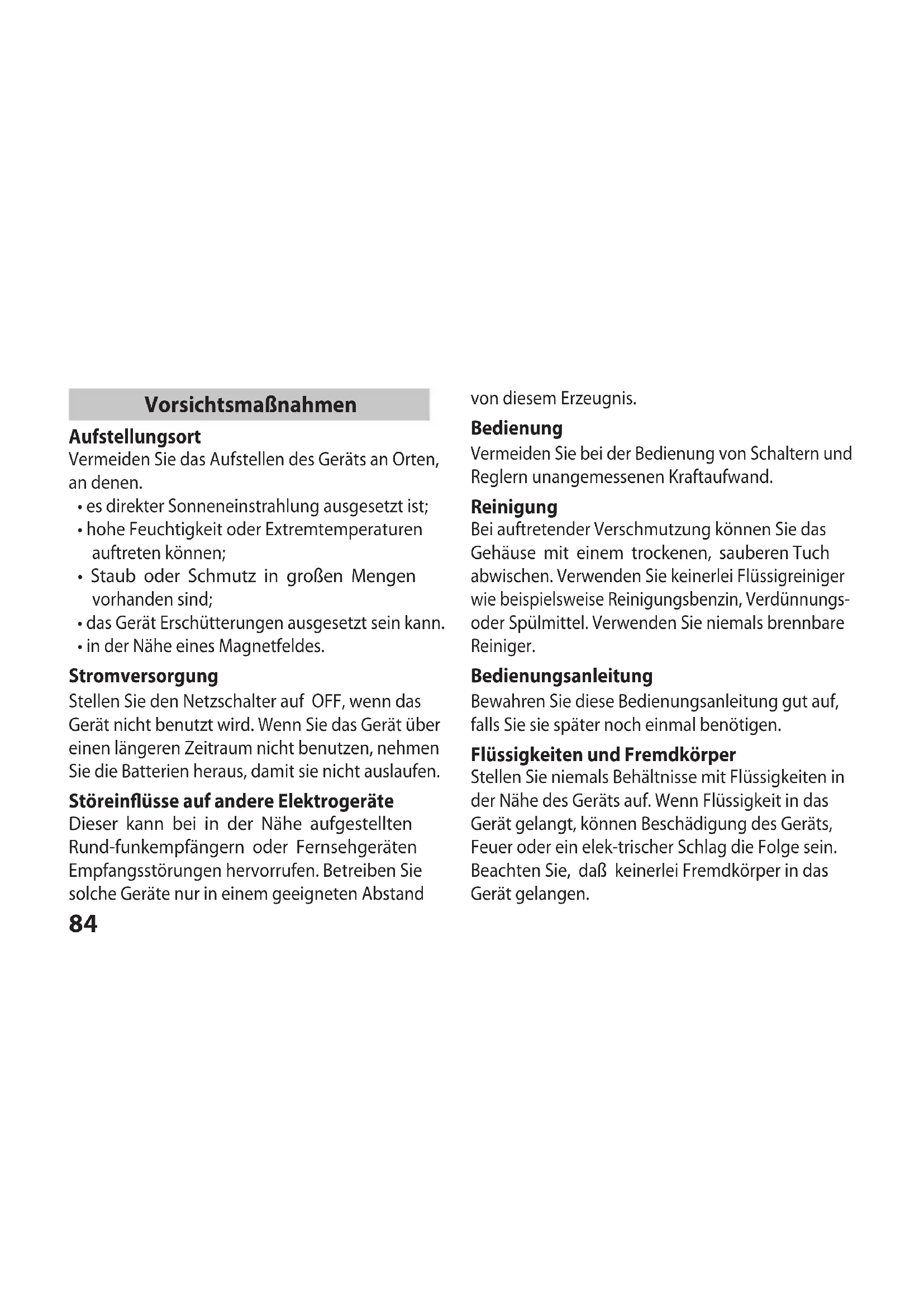 - in der Nähe eines Magnetfeldes. Stromversorgung Stellen Sie den Netzschalter auf OFF, wenn das Gerät nicht benutzt wird. Wenn Sie das Gerät über einen längeren Zeitraum nicht benutzen, nehmen Sie die Batterien heraus, damit sie nicht auslaufen. Störeinüsse auf andere Elektrogeräte Dieser kann bei in der Nähe aufgestellten Rund-funkempfängern oder Fernsehgeräten Empfangsstörungen hervorrufen. Betreiben Sie solche Geräte nur in einem geeigneten Abstand von diesem Erzeugnis. Bedienung Vermeiden Sie bei der Bedienung von Schaltern und Reglern unangemessenen Kraftaufwand. Reinigung Bei auftretender Verschmutzung können Sie das Gehäuse mit einem trockenen, sauberen Tuch abwischen. Verwenden Sie keinerlei Flüssigreiniger wie beispielsweise Reinigungsbenzin, Verdünnungs- oder Spülmittel. Verwenden Sie niemals brennbare Reiniger. Bedienungsanleitung Bewahren Sie diese Bedienungsanleitung gut auf, falls Sie sie später noch einmal benötigen. Flüssigkeiten und Fremdkörper Stellen Sie niemals Behältnisse mit Flüssigkeiten in der Nähe des Geräts auf. Wenn Flüssigkeit in das Gerät gelangt, können Beschädigung des Geräts, Feuer oder ein elek-trischer Schlag die Folge sein. Beachten Sie, daß keinerlei Fremdkörper in das Gerät gelangen.85 Hinweis zur Entsorgung (Nur EU) Wenn Sie das Symbol mit der „durchgekreuzten Mülltonne“ auf Ihrem Produk t , der d a zug e h ör i g en Bedienungsanleitung, der Batterie oder der Verpackung sehen, müssen Sie das Produkt in der vorgeschriebenen Art und Weise entsorgen um Schäden an der menschlichen Gesundheit und der Umwelt zu vermeiden. Batterien oder Akkus, die Schadstoe enthalten, sind auch mit dem Symbol einer durchgekreuzten Mülltonne gekennzeichnet. In der Nähe zum Mülltonnensymbol bendet sich die chemische Bezeichnung des Schadstoes.