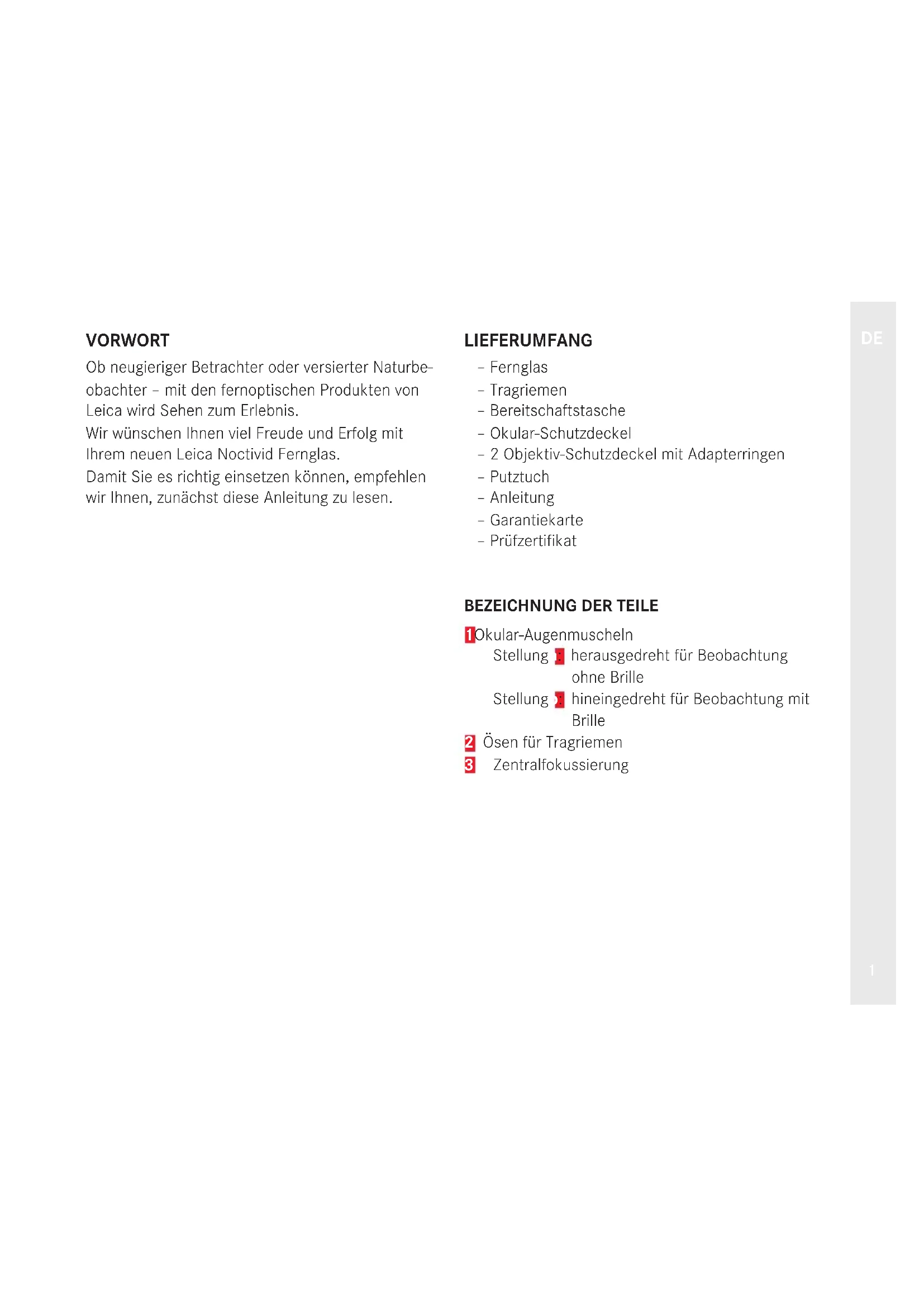 VORWORT Ob neugieriger Betrachter oder versierter Naturbe- obachter – mit den fernoptischen Produkten von Leica wird Sehen zum Erlebnis. Wir wünschen Ihnen viel Freude und Erfolg mit Ihrem neuen Leica Noctivid Fernglas. Damit Sie es richtig einsetzen können, empfehlen wir Ihnen, zunächst diese Anleitung zu lesen. LIEFERUMFANG – Fernglas – Tragriemen – Bereitschaftstasche – Okular-Schutzdeckel – 2 Objektiv-Schutzdeckel mit Adapterringen – Putztuch – Anleitung – Garantiekarte – Prüfzertifikat