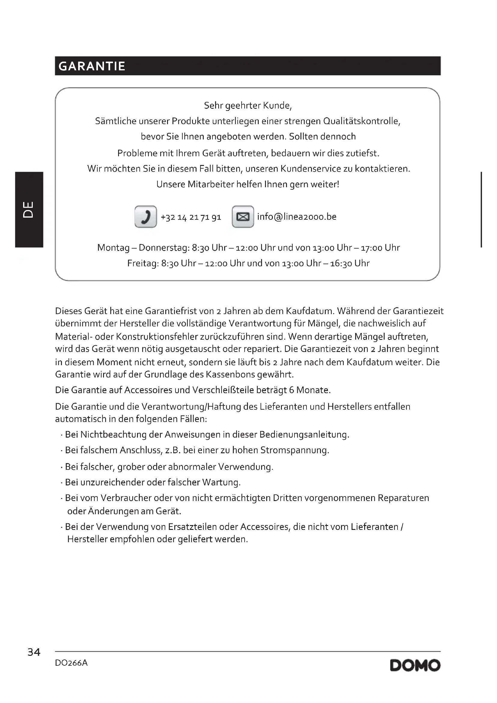- Bei der Verwendung von Ersatzteilen oder Accessoires, die nicht vom Lieferanten / Hersteller empfohlen oder geliefert werden.35 DO266A www.domo-elektro.be