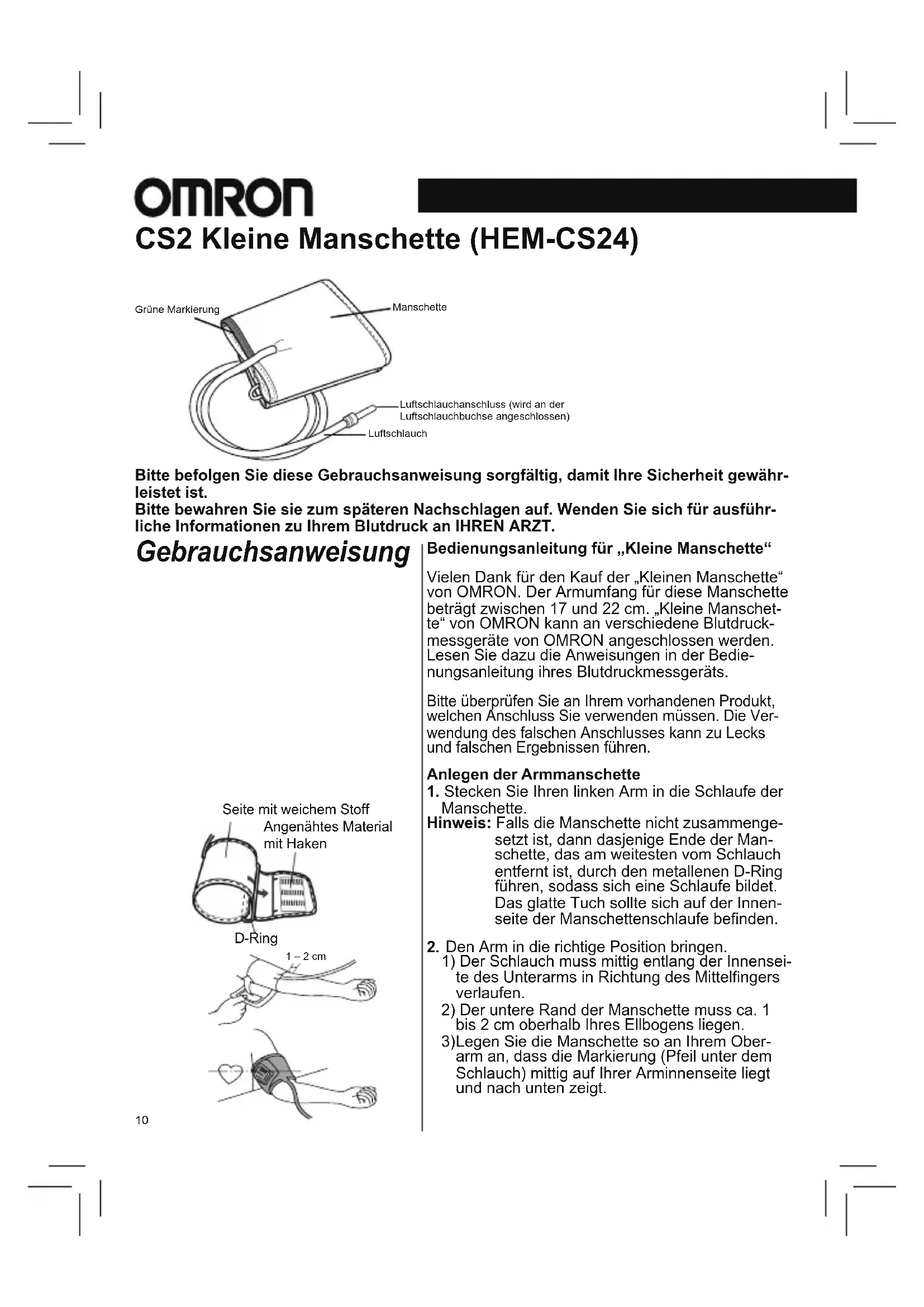 Legen Sie die Manschette so an Ihrem Ober- arm an, dass die Markierung (Pfeil unter dem Schlauch) mittig auf Ihrer Arminnenseite liegt und nach unten zeigt. Bitte befolgen Sie diese Gebrauchsanweisung sorgfältig, damit Ihre Sicherheit gewähr- leistet ist. Bitte bewahren Sie sie zum späteren Nachschlagen auf. Wenden Sie sich für ausführ- liche Informationen zu Ihrem Blutdruck an IHREN ARZT. CS2 Kleine Manschette (HEM-CS24) Grüne MarkierungManschetteLuftschlauchanschluss (wird an der Luftschlauchbuchse angeschlossen)Luftschlauch Pile side material Sewn hook material D-ring 1 – 2 cm Seite mit weichem StoffAngenähtes Material mit Haken -Ring1 – 2 cm11