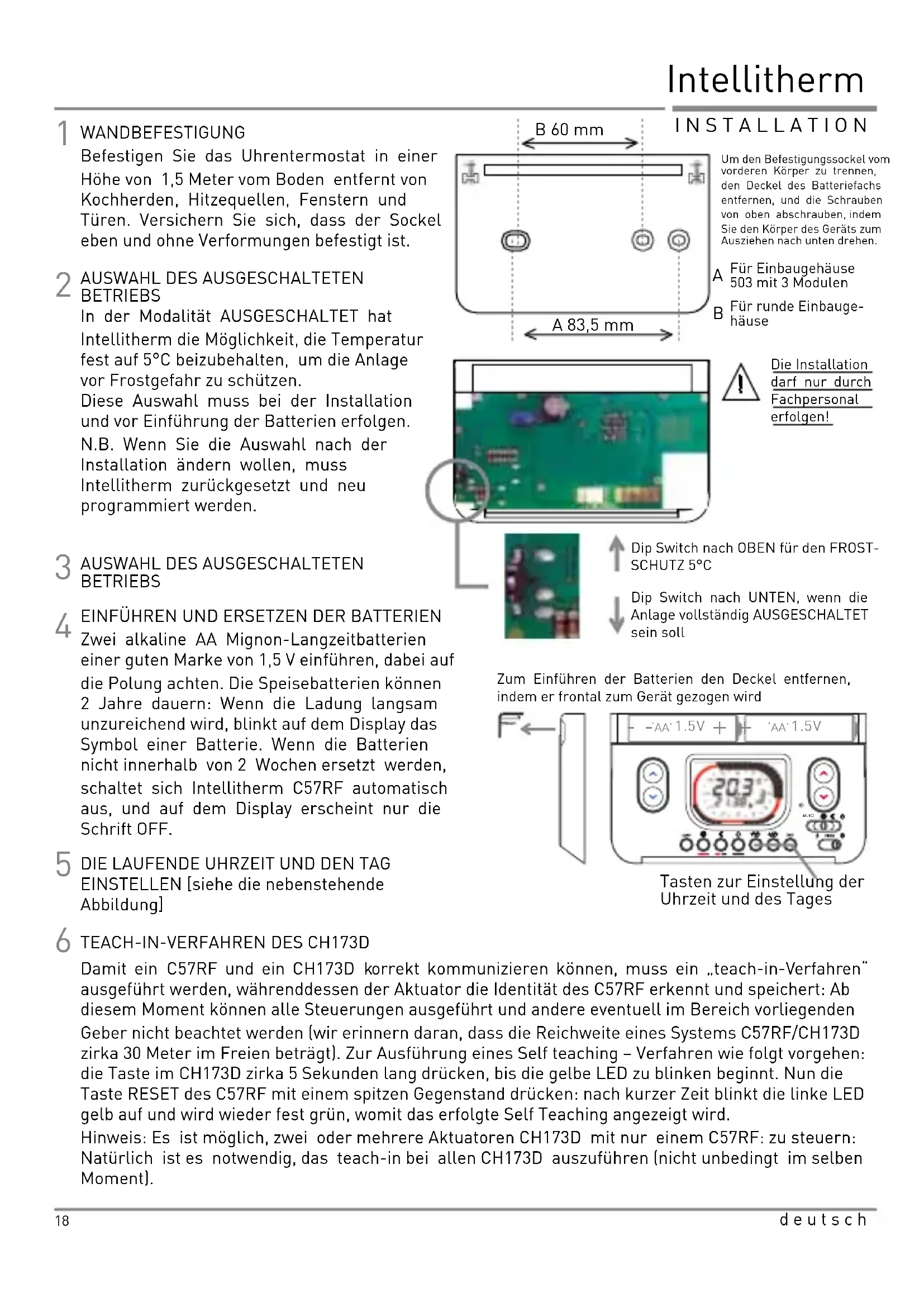Intellitherm Nach Programmierung der Uhrzeiten eines Tages ist es möglich, das Programm durch Drücken der Taste COPY für die nächsten Tage zu kopieren, oder durch Drücken von DAY und Wiederholen der vorhergehenden Vorgänge den Tag zu ändern d e u t s c h 20T E C H N I S C H E E I G E N S C H A F T E N Entspricht den Normen EN 50371, EN60950-1, EN300220-2, EN301489-3. Entspricht den folgenden Richtlinien 1999/5/EC. Software Klasse A. Temperatureinstellung – COMFORT von 2 bis 62°C – ECONOMY von 2 bis 52°C Differential ± 0,25°C Temperaturgradient für den Bezug 4°K/h Ausgeschaltet mit Frostschutzmöglichkeit (5°C) durch Dip Switch Einstellung. Max. Raumtemperatur T45. Speisung ohne Stromanschluss mit 2 alkalinen AA Mignon- Batterien 1,5V (Lebensdauer 2 Jahre). Eigenschaften des Funksignals 868.350 MHz <= 15mW. Signalhöchstleistung 30 m in geschlossenen Räumen, 70m im Freien. Automatische Kontrolle des Ladezustands der Batterien mit Anzeige auf dem Display bei unzureichender Ladung. Ersatz der Batterien ohne Verlust der programmierten. Daten. Schalter für Winter- oder Sommerbetrieb. Reset-Taste zur Wiederherstellung des voreingestellten. Programms. Dimensionen: 130 x 80 x 17 mm. rP Klassifikation: ErP Klasse IV; 2% (EU Verord. EU 811/2013 - 813/2013) Den Schalter auf die Position ECONOMY, um die MIN. Temperatur oder auf die Position COMFORT stellen, um die MAX. Temperatur abzulesen. M I N . U N D M A X . R A U M T E M P E R A T U R A M V O R H E R G E H E N D E N T A G FORTGESCHRITTENE F U N K T I O N E N B E T R I E B S S T U N D E N AU TO BETRIEBSSTUNDEN seit dem Start BETRIEBSSTUNDEN seit dem vorhergehenden Tag AU TO UHRZEITEN, in denen die Temperatur registriert wird MAX. oder MIN. Raumtemperatur Mit dem C57RF ist es möglich zu wissen, für wie viel Zeit am vorhergehenden Tag (Relais geschlossen – ON) und seit Betriebsbeginn von Intellitherm (seit Einführung der Batterien oder seit einem Reset) Wärme gefordert wurde. Durch Positionieren der Schalter gemäß Angabe werden auf dem Display die Verwendungsstunden des Heizbetriebs angezeigt. Mit Intellitherm C57RF ist es möglich, die MIN. und MAX. Temperatur, die der Raum am vorhergehenden Tag erreicht hat, sowie die Uhrzeit der Messung zu überprüfen. Den Schalter auf PROG. stellen. S O M M E R B E T R I E B O D E R K L I M A A N L A G E Wenn der Schalter auf die Position SOMMER gestellt wird, bereitet sich Intellitherm C57RF für den Betrieb der Anlage als KLIMAANLAGE vor. Die Temperatur COMFORT / TMAX, die im Raum beibehalten werden soll, wird mit den roten Tasten eingestellt. Die roten Abschnitte des Rades am Display zeigen daher die Einschaltzeiten der Klimaanlage, die anders gefärbten Tasten die Ausschaltzeiten an. Intellitherm d e u t s c h 21IntellithermIntellitherm