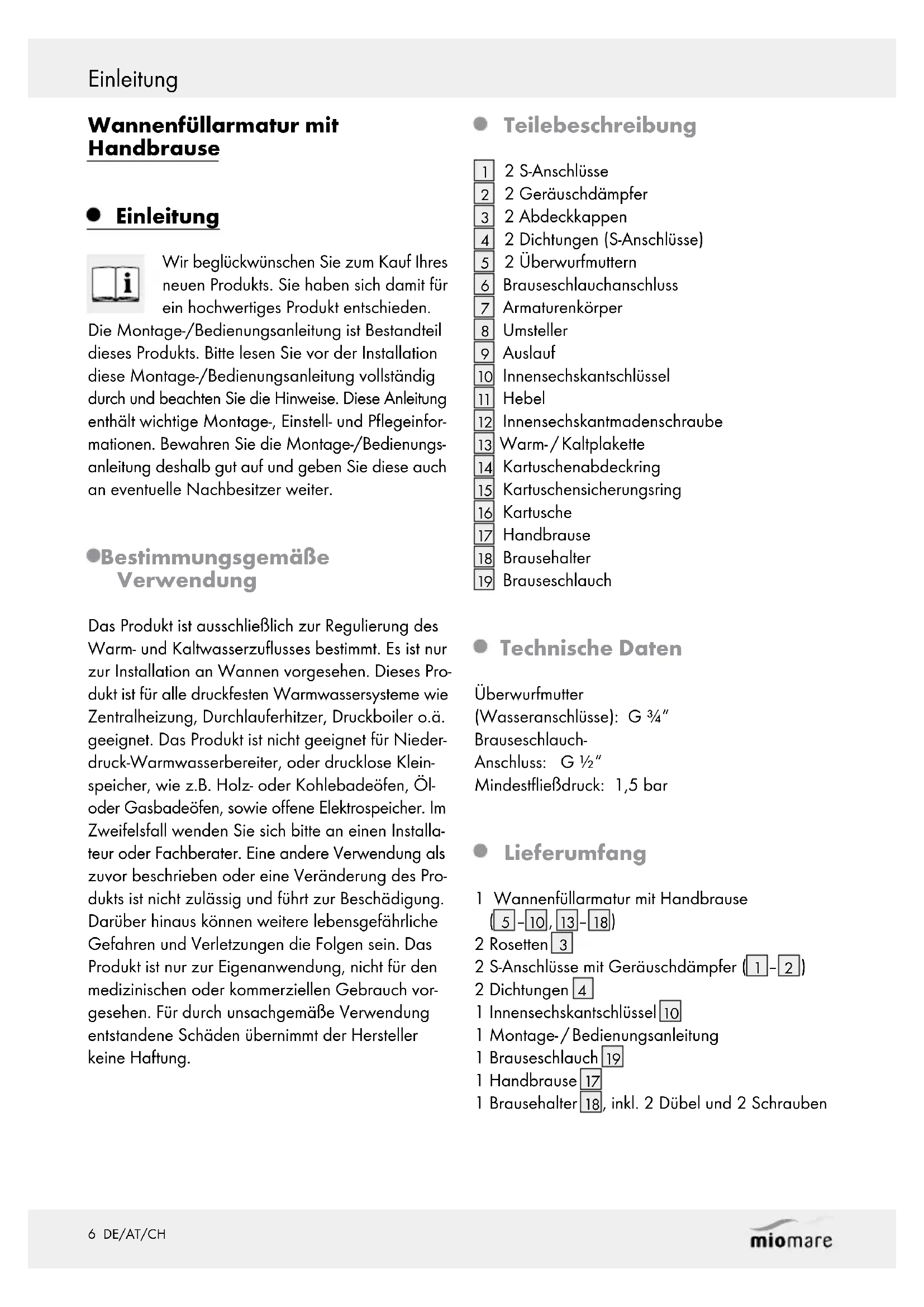 165 DE/AT/CH Einleitung ......................................................................................................................................... Seite 6 Bestimmungsgemäße Verwendung ....................................................................................................Seite 6 Teilebeschreibung ...............................................................................................................................Seite 6 Technische Daten ................................................................................................................................Seite 6 Lieferumfang ........................................................................................................................................ Seite 6 Sicherheitshinweise ................................................................................................................Seite 7 Montage ...........................................................................................................................................Seite 7 Armatur anschließen ........................................................................................................................... Seite 7 Zubehör (Brauseschlauch und Duschkopf) anschließen ...................................................................Seite 8 Wandhalter montieren ........................................................................................................................Seite 8 Bedienung ......................................................................................................................................Seite 8 Inbetriebnahme ...................................................................................................................................Seite 8 Umsteller Wannenauslauf / Brausefunktion .......................................................................................Seite 8 Wartung und Reinigung .....................................................................................................Seite 8 Armatur pflegen und reinigen ............................................................................................................Seite 8 Kartusche austauschen .......................................................................................................................Seite 9 Entsorgung .....................................................................................................................................Seite 9 Informationen .............................................................................................................................Seite 9 Trinkbarkeit von Leitungswasser ......................................................................................................... Seite 9 Garantie und Service ............................................................................................................Seite 10 Inhaltsverzeichnis6 DE/AT/CH Wannenfüllarmatur mit Handbrause Einleitung Wir beglückwünschen Sie zum Kauf Ihres neuen Produkts. Sie haben sich damit für ein hochwertiges Produkt entschieden. Die Montage-/Bedienungsanleitung ist Bestandteil dieses Produkts. Bitte lesen Sie vor der Installation diese Montage-/Bedienungsanleitung vollständig durch und beachten Sie die Hinweise. Diese Anleitung enthält wichtige Montage-, Einstell- und Pflegeinfor- mationen. Bewahren Sie die Montage-/Bedienungs- anleitung deshalb gut auf und geben Sie diese auch an eventuelle Nachbesitzer weiter. Bestimmungsgemäße Verwendung Das Produkt ist ausschließlich zur Regulierung des Warm- und Kaltwasserzuflusses bestimmt. Es ist nur zur Installation an Wannen vorgesehen. Dieses Pro- dukt ist für alle druckfesten Warmwassersysteme wie Zentralheizung, Durchlauferhitzer, Druckboiler o.ä. geeignet. Das Produkt ist nicht geeignet für Nieder- druck-Warmwasserbereiter, oder drucklose Klein- speicher, wie z.B. Holz- oder Kohlebadeöfen, Öl- oder Gasbadeöfen, sowie offene Elektrospeicher. Im Zweifelsfall wenden Sie sich bitte an einen Installa- teur oder Fachberater. Eine andere Verwendung als zuvor beschrieben oder eine Veränderung des Pro- dukts ist nicht zulässig und führt zur Beschädigung. Darüber hinaus können weitere lebensgefährliche Gefahren und Verletzungen die Folgen sein. Das Produkt ist nur zur Eigenanwendung, nicht für den medizinischen oder kommerziellen Gebrauch vor- gesehen. Für durch unsachgemäße Verwendung entstandene Schäden übernimmt der Hersteller keine Haftung. Teilebeschreibung