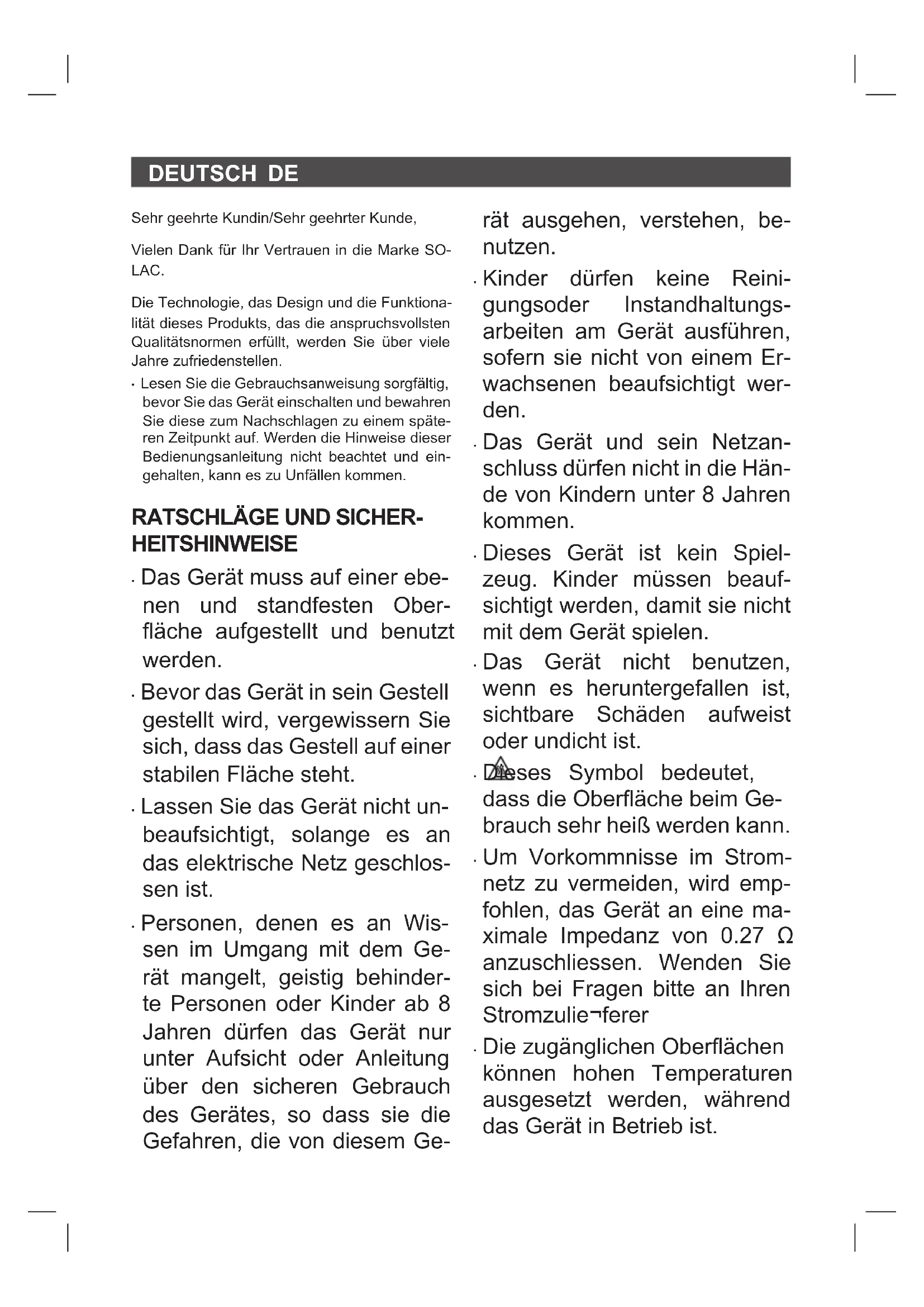 - Die zugänglichen Oberächen können hohen Temperaturen ausgesetzt werden, während das Gerät in Betrieb ist.DE