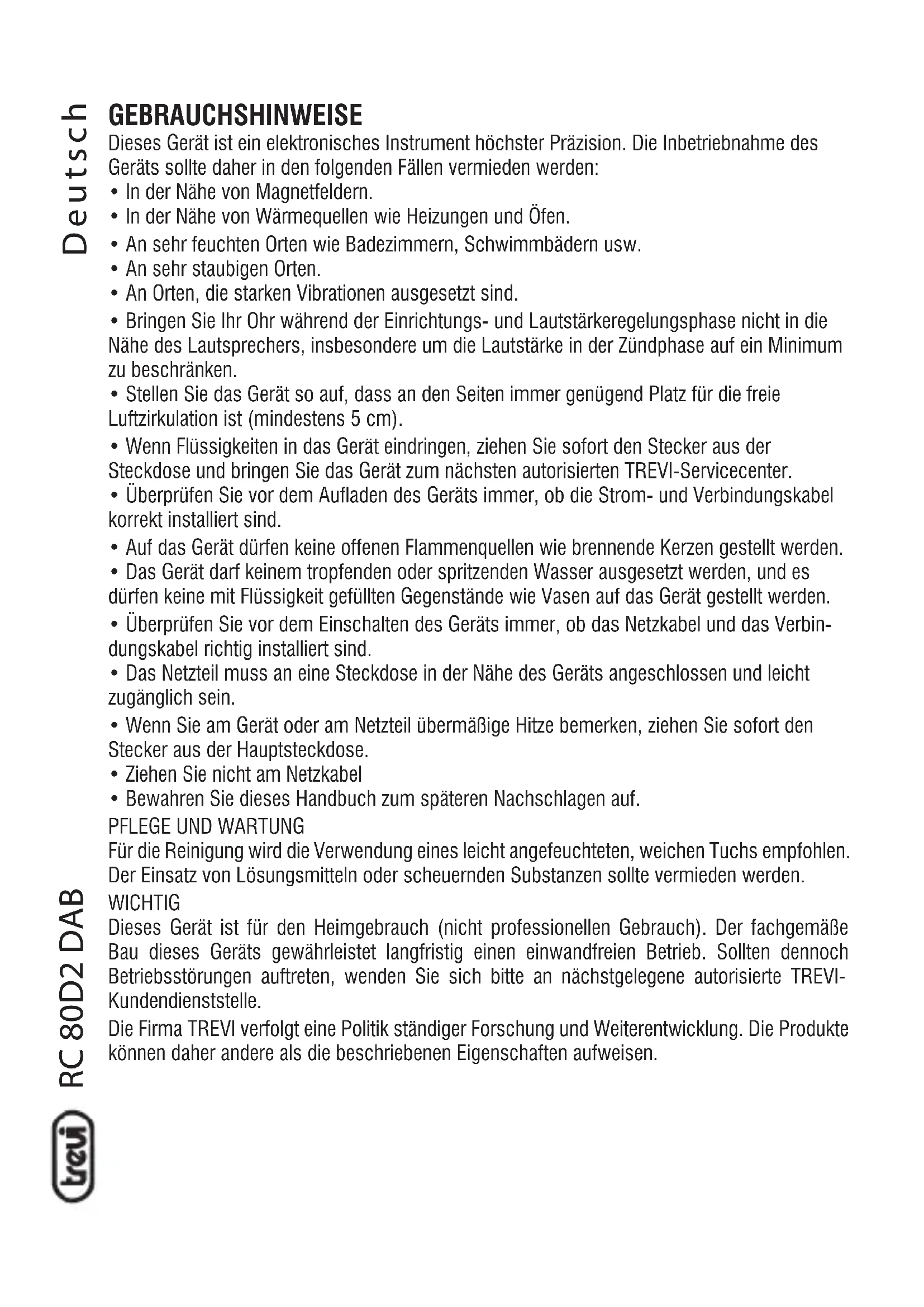 Für die Reinigung wird die Verwendung eines leicht angefeuchteten, weichen Tuchs empfohlen. Der Einsatz von Lösungsmitteln oder scheuernden Substanzen sollte vermieden werden. WICHTIG Dieses Gerät ist für den Heimgebrauch (nicht professionellen Gebrauch). Der fachgemäße Bau dieses Geräts gewährleistet langfristig einen einwandfreien Betrieb. Sollten dennoch Betriebsstörungen auftreten, wenden Sie sich bitte an nächstgelegene autorisierte TREVI- Kundendienststelle. Die Firma TREVI verfolgt eine Politik ständiger Forschung und Weiterentwicklung. Die Produkte können daher andere als die beschriebenen Eigenschaften aufweisen. DeutschRC 80D2 DAB BEFEHLSBESCHREIBUNG
