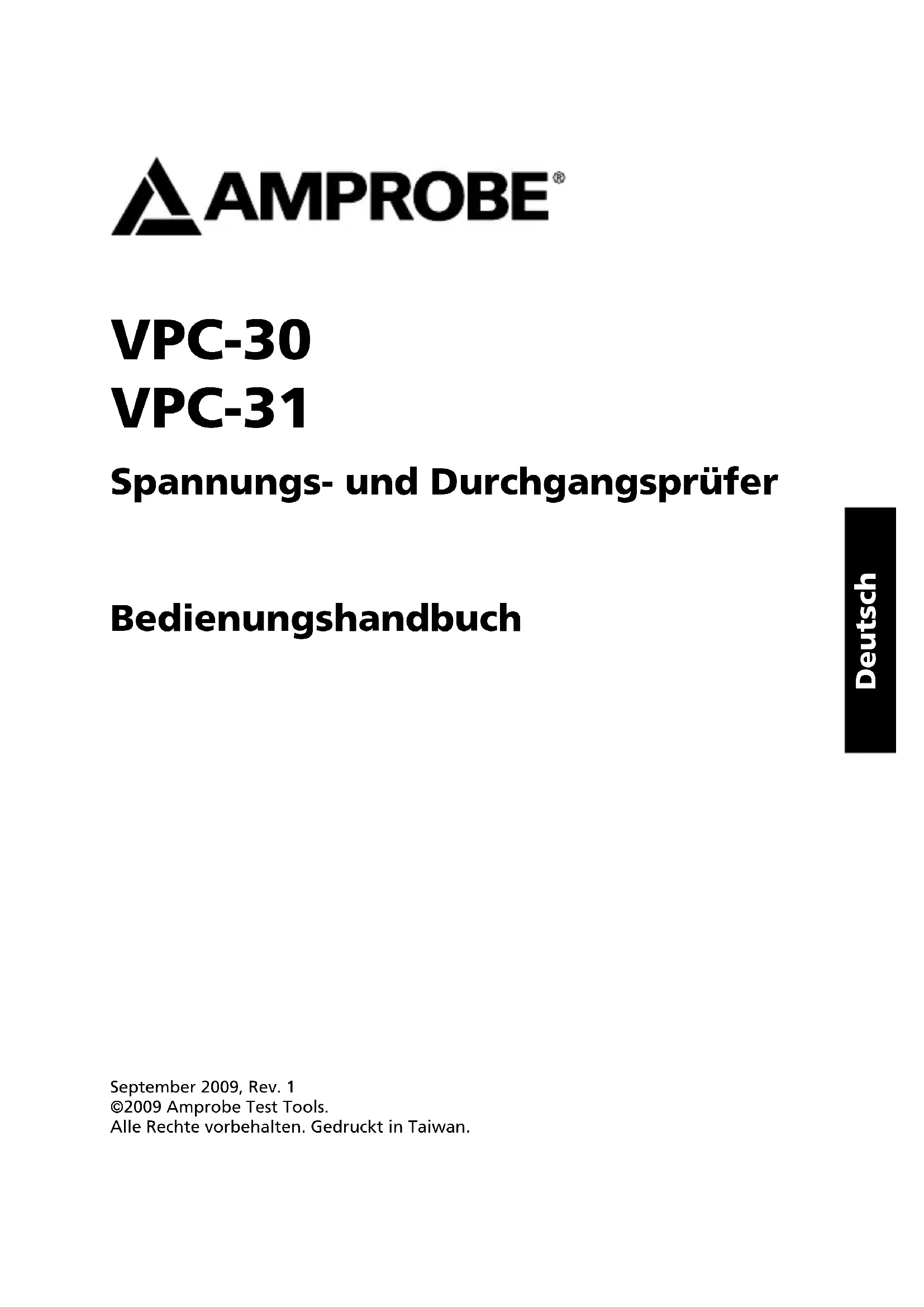 lors de l’utilisation. À l’exception du changement des piles, la réparation de l’appareil doit être effectuée dans un centre de service agréé ou par un autre personnel d’entretien qualifié. La face avant et le boîtier peuvent être nettoyés à l’aide d’une solution légère à base d’eau et de détergent. Appliquez cette solution avec modération en utilisant un tissu doux et laissez bien sécher avant l’utilisation. N’utilisez pas de solvants à base de chlore ou d’hydrocarbures aromatiques pour le nettoyage.13 Fig. 1 Fig. 3 Fig. 4 Fig. 2VPC-30 VPC-31 Spannungs- und Durchgangsprüfer Bedienungshandbuch September 2009, Rev. 1 ©2009 Amprobe Test Tools. Alle Rechte vorbehalten. Gedruckt in Taiwan. DeutschBeschränkte Gewährleistung und Haftungsbeschränkung Es wird gewährleistet, dass dieses Amprobe-Produkt für die Dauer von einem Jahr ab dem Kaufdatum frei von Material- und Fertigungsdefekten ist. Diese Gewährleistung erstreckt sich nicht auf Sicherungen, Einwegbatterien oder Schäden durch Unfälle, Nachlässigkeit, Missbrauch, Änderungen oder abnormale Betriebsbedingungen bzw. unsachgemäße Handhabung. Die Verkaufsstellen sind nicht dazu berechtigt, diese Gewährleistung im Namen von Amprobe zu erweitern. Um während der Gewährleistungsperiode Serviceleistungen in Anspruch zu nehmen, das Produkt mit Kaufnachweis an ein autorisiertes Amprobe Test Tools Service-Center oder an einen Amprobe-Fachhändler/-Distributor einsenden. Nähere Einzelheiten siehe Abschnitt „Reparatur“. DIESE GEWÄHRLEISTUNG STELLT DEN EINZIGEN UND ALLEINIGEN RECHTSANSPRUCH AUF SCHADENERSATZ DAR. ALLE ANDEREN (VERTRAGLICH GEREGELTEN ODER GESETZLICH VORGESCHRIEBENEN) GEWÄHRLEISTUNGEN, EINSCHLIESSLICH DER GESETZLICHEN GEWÄHRLEISTUNG DER MARKTFÄHIGKEIT UND DER EIGNUNG FÜR EINEN BESTIMMTEN ZWECK, WERDEN ABGELEHNT. DER HERSTELLER ÜBERNIMMT KEINE HAFTUNG FÜR SPEZIELLE, INDIREKTE, NEBEN- ODER FOLGESCHÄDEN ODER FÜR VERLUSTE, DIE AUF BELIEBIGER URSACHE ODER RECHTSTHEORIE BERUHEN. Weil einige Staaten oder Länder den Ausschluss oder die Einschränkung einer implizierten Gewährleistung sowie den Ausschluss von Begleit- oder Folgeschäden nicht zulassen, ist diese Gewährleistungsbeschränkung möglicherweise für Sie nicht gültig. Reparatur Zu allen Geräten, die zur Reparatur oder Kalibrierung im Rahmen der Garantie oder außerhalb der Garantie eingesendet werden, muss folgendes beigelegt werden: Name des Kunden, Firmenname, Adresse, Telefonnummer und Kaufbeleg. Zusätzlich bitte eine kurze Beschreibung des Problems oder der gewünschten Wartung sowie die Messleitungen dem Messgerät beilegen. Die Gebühren für außerhalb des Garantiezeitraums durchgeführte Reparaturen oder für den Ersatz von Instrumenten müssen per Scheck, Zahlungsanweisung oder Kreditkarte (Kreditkartennummer mit Ablaufdatum) beglichen werden oder es muss ein Auftrag auf Rechnung an Amprobe