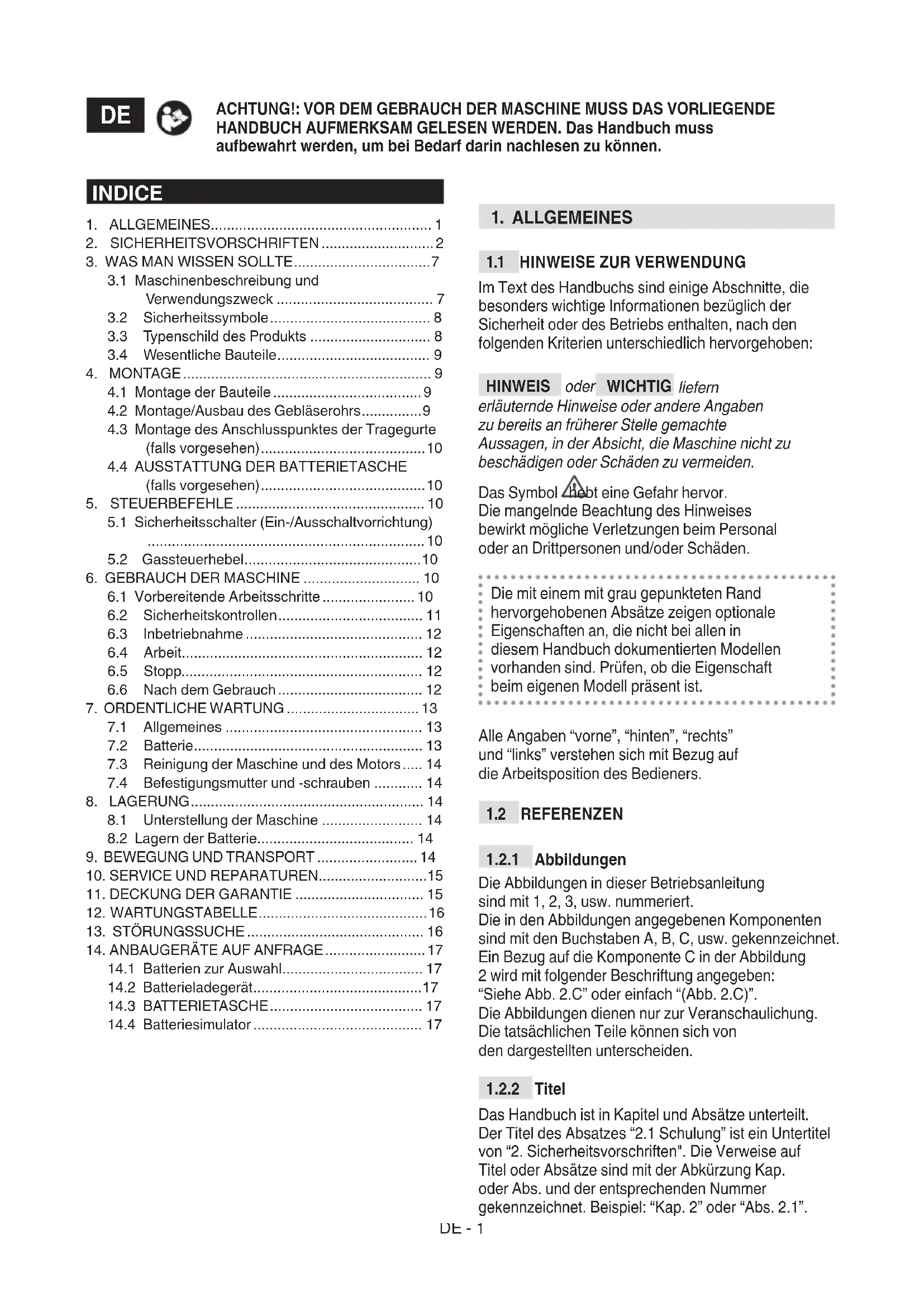 Das Handbuch ist in Kapitel und Absätze unterteilt. Der Titel des Absatzes “2.1 Schulung” ist ein Untertitel von “2. Sicherheitsvorschriften". Die Verweise auf Titel oder Absätze sind mit der Abkürzung Kap. oder Abs. und der entsprechenden Nummer gekennzeichnet. Beispiel: “Kap. 2” oder “Abs. 2.1”. INDICE