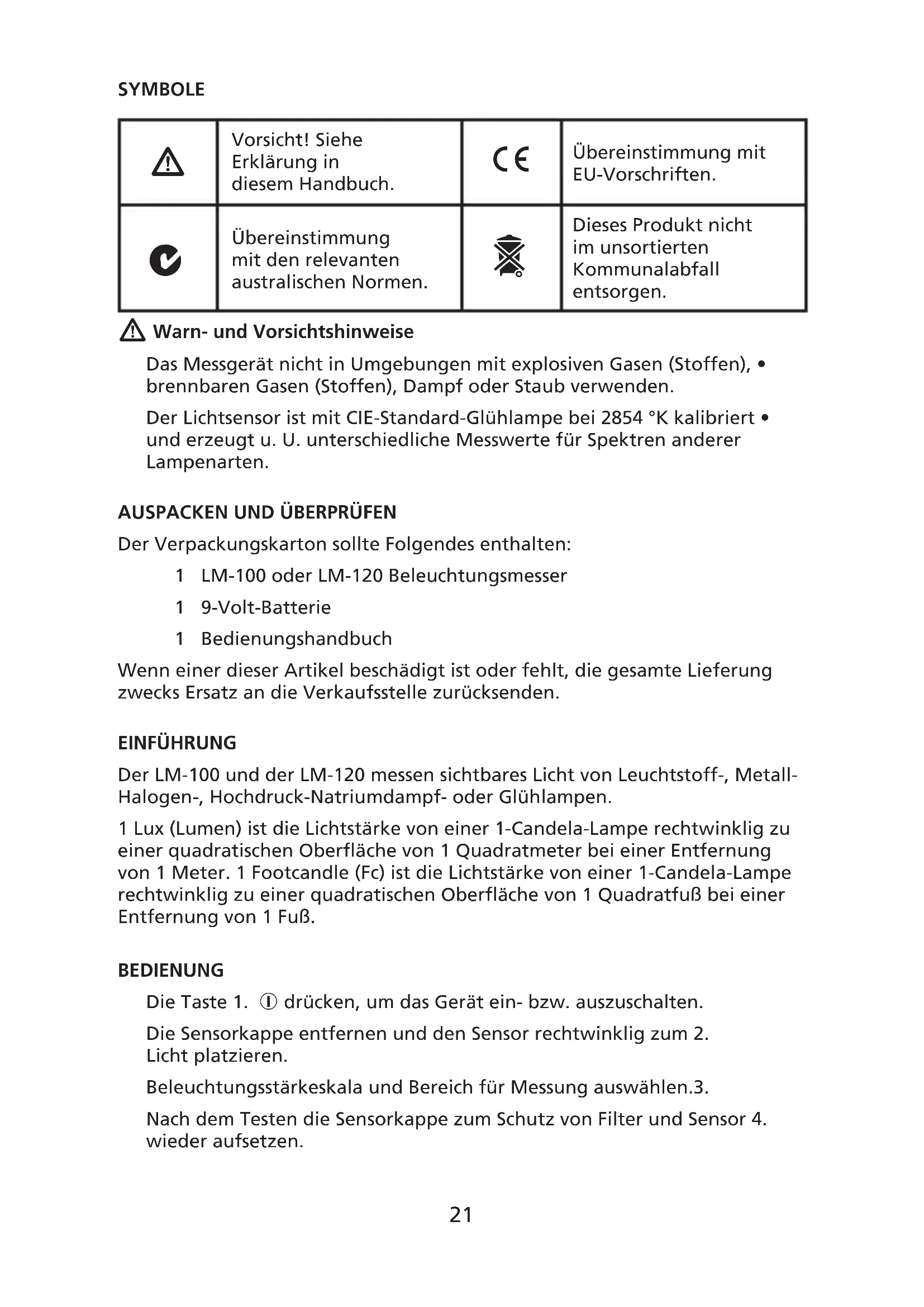Dieses Produkt nicht im unsortierten Kommunalabfall entsorgen. Warn- und Vorsichtshinweise Das Messgerät nicht in Umgebungen mit explosiven Gasen (Stoffen), • brennbaren Gasen (Stoffen), Dampf oder Staub verwenden. Der Lichtsensor ist mit CIE-Standard-Glühlampe bei 2854 °K kalibriert • und erzeugt u. U. unterschiedliche Messwerte für Spektren anderer Lampenarten.