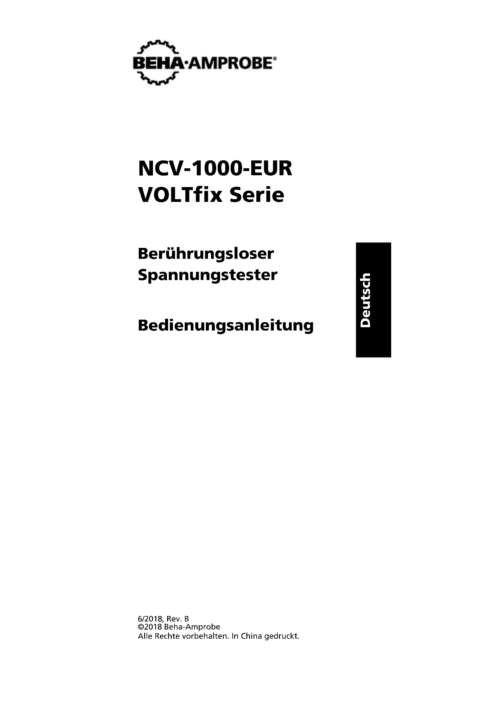 Low Battery Indication The NCV-1030/1040-EUR (MAGNO-)VOLTx Voltage Probe provide a low battery indication in the form of a very slowly blinking red LED upon power on when battery level is low and the batteries should be replaced. At that point no voltage indication is possible. The NCV-1020-EUR VOLTx does not provide the same indication; instead, batteries will need to be replaced when no LED appears upon power on. Battery Replacement To remove the battery cap, use the thumb grip to pull it upwards and outwards. Remove batteries and replace with (2) AAA 1.5 V alkaline batteries, noting the battery orientation as shown on the side of the Voltage Probe. Replace the cap. If the Voltage Probe will not be used for a long period of time, remove the batteries. Battery Cap Latch8 Cleaning The Voltage Probe can be cleaned with a mild solution of soapy water. Apply sparingly with a soft cloth and allow to dry completely before using. Do not use aromatic hydrocarbons, gasoline, or chlorinated solvents for cleaning.NCV-1000-EUR VOLTfix Serie Berührungsloser Spannungstester Bedienungsanleitung 6/2018, Rev. B ©2018 Beha-Amprobe Alle Rechte vorbehalten. In China gedruckt. DeutschEingeschränkte Garantie und Haftungseinschränkungen Innerhalb eines Jahres ab Kaufdatum oder innerhalb des gesetzlich vorgeschriebenen Mindestzeitraums garantieren wir, dass Ihr Beha-Amprobe-Produkt keinerlei Material- und Herstellungsfehler aufweist. Sicherungen, Einwegbatterien sowie Schäden durch Unfall, Fahrlässigkeit, Missbrauch, Manipulation, Kontamination sowie anomale Nutzung und Einsatzbedingungen werden nicht durch die Garantie abgedeckt. Händler sind nicht berechtigt, jegliche Erweiterungen der Garantie im Namen von Beha-Amprobe in Aussicht zu stellen. Um Serviceleistungen während der Garantiezeit in Anspruch zu nehmen, übergeben Sie das Produkt mitsamt Kaufbeleg einem autorisierten Amprobe-Servicecenter oder einem Beha-Amprobe-Händler oder -Distributor. Details dazu nden Sie im Reparatur- Abschnitt. Sämtliche Ansprüche Ihrerseits ergeben sich aus dieser Garantie. Sämtliche sonstigen Gewährleistungen oder Garantien, ob ausdrücklich, stillschweigend oder satzungsgemäß, sowie Gewährleistungen der Eignung für einen bestimmten Zweck oder Marktgängigkeit werden hiermit abgelehnt. Der Hersteller haftet nicht für spezielle, indirekte, beiläuge oder Folgeschäden sowie für Verluste, die auf andere Weise eintreten. In bestimmten Staaten oder Ländern sind Ausschlüsse oder Einschränkungen stillschweigender Gewährleistungen, beiläuger oder Folgeschäden nicht zulässig; daher müssen diese Haftungseinschränkungen nicht zwingend auf Sie zutreffen. Reparatur Sämtliche innerhalb oder außerhalb der Garantiezeit zur Reparatur oder Kalibrierung eingereichten Geräte sollten mit folgenden Angaben begleitet werden: Ihr Name, Name Ihres Unternehmens, Anschrift, Telefonnummer und Kaufbeleg. Zusätzlich fügen Sie bitte eine Kurzbeschreibung des Problems oder der gewünschten Dienstleistung bei, vergessen Sie auch die Messleitungen des Gerätes nicht. Gebühren für Reparaturen oder Austausch außerhalb der Garantiezeit sollten per Scheck, Überweisung, Kreditkarte (mit Angabe des Ablaufdatums) oder per Auftrag zugunsten von Beha- Amprobe beglichen werden. Reparatur und Austausch innerhalb der Garantiezeit – Alle Länder Bitte lesen Sie die Garantiebedingungen und prüfen Sie den Zustand der Batterie, bevor Sie Reparaturleistungen in Anspruch nehmen. Innerhalb der Garantiezeit können sämtliche defekte Geräte zum Austausch gegen ein gleiches oder gleichartiges Produkt an Ihren Beha- Amprobe-Distributor zurückgegeben werden. Eine Liste mit Distributoren in Ihrer Nähe nden Sie im Bezugsquellen- Bereich bei beha-amprobe.com. In den USA und in Kanada können Geräte zum Austausch oder zur Reparatur auch an das Amprobe-Servicecenter (Anschrift weiter unten) eingesandt werden. Reparatur und Austausch außerhalb der Garantiezeit – USA und Kanada Außerhalb der Garantiezeit sollten Geräte in den USA und in Kanada zur Reparatur an ein Amprobe-Servicecenter gesandt werden. Informationen zu aktuellen Reparatur- und Austauschgebühren erhalten Sie von Ihrem Händler oder telefonisch von Amprobe. USA: Kanada: Amprobe Amprobe Everett, WA 98203 Mississauga, ON L4Z 1X9 Tel.: 877-AMPROBE (267-7623) Tel.: 905-890-7600Reparatur und Austausch außerhalb der Garantiezeit – Europa In Europa können Geräte außerhalb der Garantiezeit gegen eine geringe Gebühr von Ihrem Beha-Amprobe-Distributor ausgetauscht werden. Eine Liste mit Distributoren in Ihrer Nähe nden Sie im Bereich Vertriebspartner unter beha-amprobe.com. Beha-Amprobe Abteilung und registrierte Marke von Fluke Corp. (USA) Deutschland* Vereinigtes Königreich In den Engematten 14 52 Hurricane Way 79286 Glottertal Norwich, Norfolk Germany NR6 6JB United Kingdom Tel: +49 (0) 7684 8009 - 0 Tel: +44 (0) 1603 25 6662 beha-amprobe.de beha-amprobe.com Niederlande – Hauptsitz** Science Park Eindhoven 5110 5692 EC Son The Netherlands Tel: +31 (0) 40 267 51 00 beha-amprobe.com