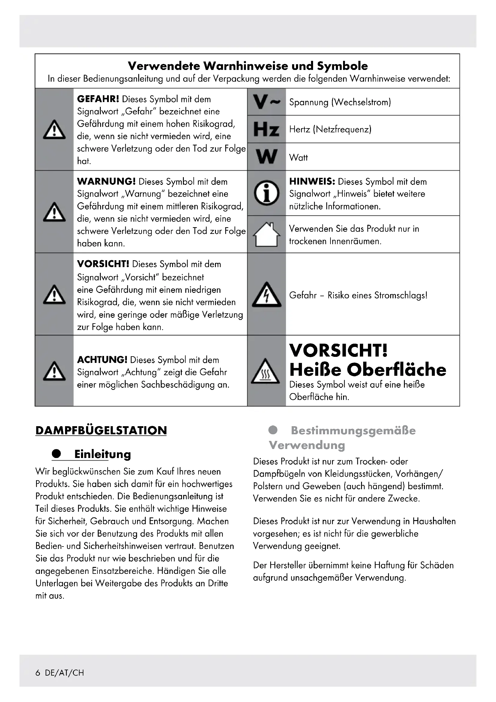 | Verwendete Warnhinweise und Symbole In dieser Bedienungsanleitung und auf der Verpackung werden die folgenden Warnhinweise verwendet: | |||