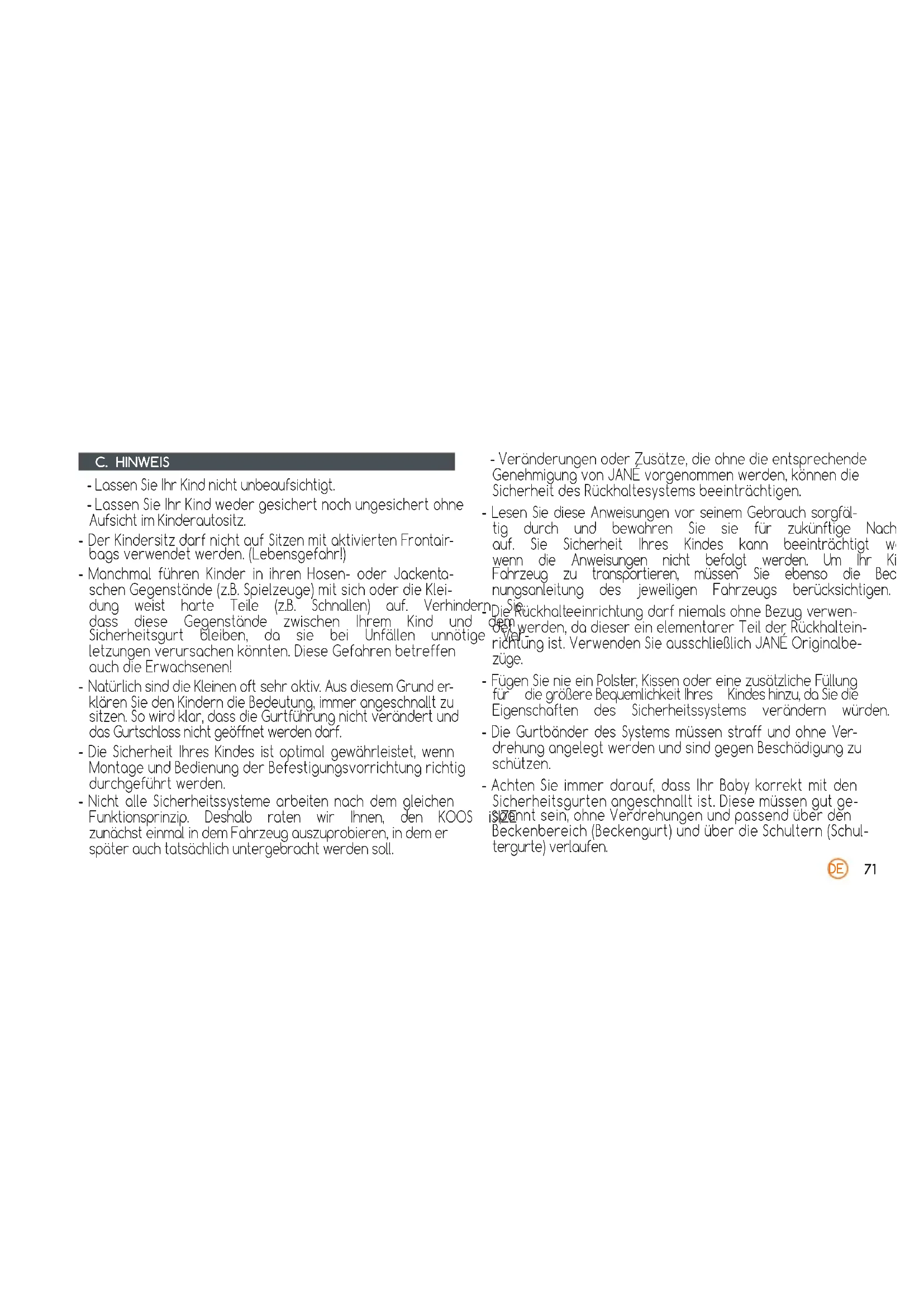 ANWEISUNGEN C. HINWEIS - LassenSieIhrKindnichtunbeaufsichtigt. - LassenSieIhrKindwedergesichertnochungesichertohne AufsichtimKinderautositz. - DerKindersitzdarfnichtaufSitzenmitaktiviertenFrontair- bagsverwendetwerden.(Lebensgefahr!) - Manchmal führen Kinder in ihren Hosen- oder Jackenta- schenGegenstände(z.B.Spielzeuge)mitsichoderdieKlei- dung weist harte Teile (z.B. Schnallen) auf. Verhindern Sie, dass diese Gegenstände zwischen Ihrem Kind und dem Sicherheitsgurt bleiben, da sie bei Unfällen unnötige Ver- letzungenverursachenkönnten.DieseGefahrenbetreffen auchdieErwachsenen! - NatürlichsinddieKleinenoftsehraktiv.AusdiesemGrunder- klärenSiedenKinderndieBedeutung,immerangeschnalltzu sitzen.Sowirdklar,dassdieGurtführungnichtverändertund dasGurtschlossnichtgeöffnetwerdendarf. - DieSicherheitIhresKindesist optimalgewährleistet,wenn MontageundBedienungderBefestigungsvorrichtungrichtig durchgeführtwerden. - Nicht alle Sicherheitssysteme arbeiten nach dem gleichen Funktionsprinzip. Deshalb raten wir Ihnen, den KOOS iSIZE zunächsteinmalindemFahrzeugauszuprobieren,indemer späterauchtatsächlichuntergebrachtwerdensoll. - VeränderungenoderZusätze,dieohnedieentsprechende GenehmigungvonJANÉvorgenommenwerden,könnendie SicherheitdesRückhaltesystemsbeeinträchtigen. - Lesen Sie diese Anweisungen vor seinem Gebrauch sorgfäl- tig durch und bewahren Sie sie für zukünftige Nachfragen auf. Sie Sicherheit Ihres Kindes kann beeinträchtigt werden, wenn die Anweisungen nicht befolgt werden. Um Ihr Kind im Fahrzeug zu transportieren, müssen Sie ebenso die Bedie- nungsanleitung des jeweiligen Fahrzeugs berücksichtigen. - DieRückhalteeinrichtungdarfniemalsohneBezugverwen- detwerden,dadiesereinelementarerTeilderRückhaltein- richtungist.VerwendenSieausschließlichJANÉOriginalbe- züge. - FügenSienieeinPolster,KissenodereinezusätzlicheFüllung für diegrößereBequemlichkeitIhres Kindeshinzu,daSiedie Eigenschaften des Sicherheitssystems verändern würden. - Die Gurtbänder des Systems müssen straff und ohne Ver- drehungangelegtwerdenundsindgegenBeschädigungzu schützen. - Achten Sie immer darauf, dass Ihr Babykorrekt mit den Sicherheitsgurtenangeschnalltist.Diesemüssengutge- spanntsein,ohneVerdrehungenundpassendüberden Beckenbereich(Beckengurt)undüberdieSchultern(Schul- tergurte)verlaufen.DE