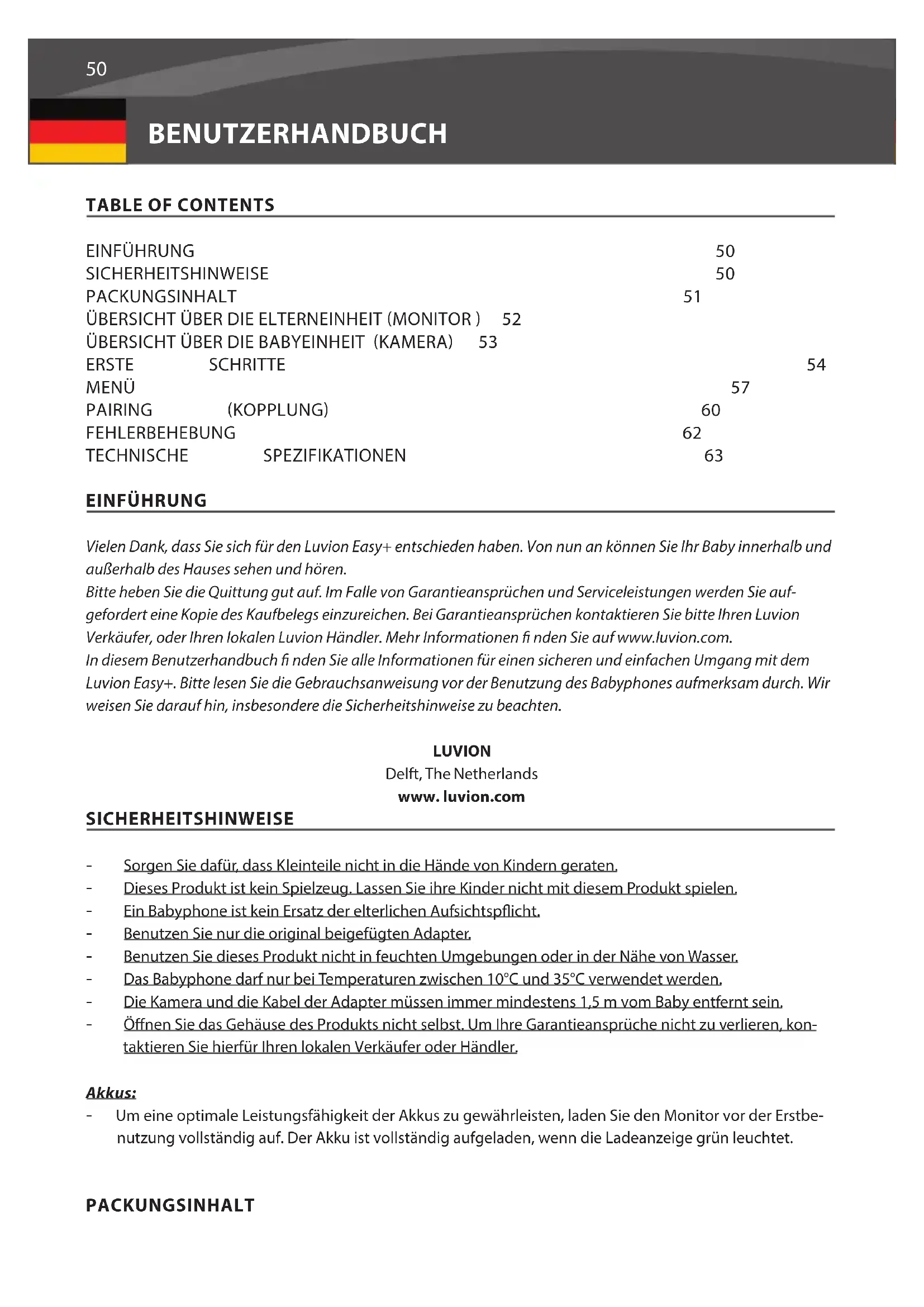 ERSTE SCHRITTE 54 MENÜ 57 PAIRING (KOPPLUNG) 60 FEHLERBEHEBUNG 62 TECHNISCHE SPEZIFIKATIONEN 63 EINFÜHRUNG Vielen Dank, dass Sie sich für den Luvion Easy+ entschieden haben. Von nun an können Sie Ihr Baby innerhalb und außerhalb des Hauses sehen und hören. Bitte heben Sie die Quittung gut auf. Im Falle von Garantieansprüchen und Serviceleistungen werden Sie auf- gefordert eine Kopie des Kaufbelegs einzureichen. Bei Garantieansprüchen kontaktieren Sie bitte Ihren Luvion Verkäufer, oder Ihren lokalen Luvion Händler. Mehr Informationen nden Sie auf www.luvion.com. In diesem Benutzerhandbuch nden Sie alle Informationen für einen sicheren und einfachen Umgang mit dem Luvion Easy+. Bitte lesen Sie die Gebrauchsanweisung vor der Benutzung des Babyphones aufmerksam durch. Wir weisen Sie darauf hin, insbesondere die Sicherheitshinweise zu beachten. LUVION Delft, The Netherlands www. luvion.com SICHERHEITSHINWEISE - Sorgen Sie dafür, dass Kleinteile nicht in die Hände von Kindern geraten. - Dieses Produkt ist kein Spielzeug. Lassen Sie ihre Kinder nicht mit diesem Produkt spielen. - Ein Babyphone ist kein Ersatz der elterlichen Aufsichtsp icht. - Benutzen Sie nur die original beigefügten Adapter. - Benutzen Sie dieses Produkt nicht in feuchten Umgebungen oder in der Nähe von Wasser. - Das Babyphone darf nur bei Temperaturen zwischen 10°C und 35°C verwendet werden. - Die Kamera und die Kabel der Adapter müssen immer mindestens 1,5 m vom Baby entfernt sein. - Öff nen Sie das Gehäuse des Produkts nicht selbst. Um Ihre Garantieansprüche nicht zu verlieren, kon- taktieren Sie hierfür Ihren lokalen Verkäufer oder Händler. Akkus: - Um eine optimale Leistungsfähigkeit der Akkus zu gewährleisten, laden Sie den Monitor vor der Erstbe- nutzung vollständig auf. Der Akku ist vollständig aufgeladen, wenn die Ladeanzeige grün leuchtet. PACKUNGSINHALT51 LUVION