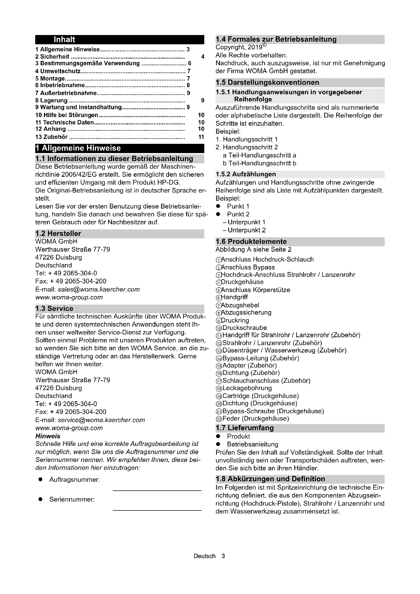Für sämtliche technischen Auskünfte über WOMA Produk- te und deren systemtechnischen Anwendungen steht Ih- nen unser weltweiter Service-Dienst zur Verfügung. Sollten einmal Probleme mit unseren Produkten auftreten, so wenden Sie sich bitte an den WOMA Service, an die zu- ständige Vertretung oder an das Herstellerwerk. Gerne helfen wir Ihnen weiter. WOMA GmbH Werthauser Straße 77-79 47226 Duisburg Deutschland Tel: + 49 2065-304-0 Fax: + 49 2065-304-200 E-mail: service@woma.kaercher.com www.woma-group.com Hinweis Schnelle Hilfe und eine korrekte Auftragsbearbeitung ist nur möglich, wenn Sie uns die Auftragsnummer und die Seriennummer nennen. Wir empfehlen Ihnen, diese bei- den Informationen hier einzutragen: