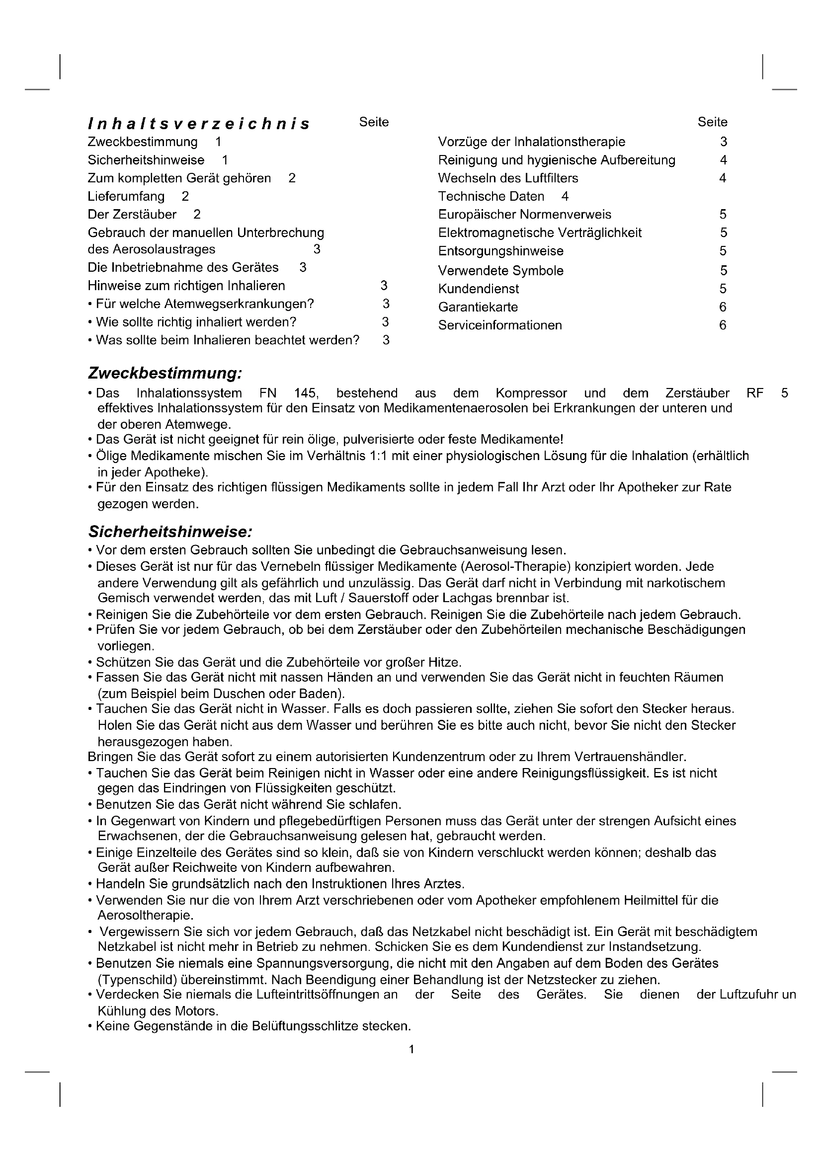 - WassolltebeimInhalierenbeachtetwerden? 3 VorzügederInhalationstherapie 3 ReinigungundhygienischeAufbereitung 4 WechselndesLuftlters 4 TechnischeDaten 4 EuropäischerNormenverweis 5 ElektromagnetischeVerträglichkeit 5 Entsorgungshinweise 5 VerwendeteSymbole 5 Kundendienst 5 Garantiekarte 6 Serviceinformationen 6