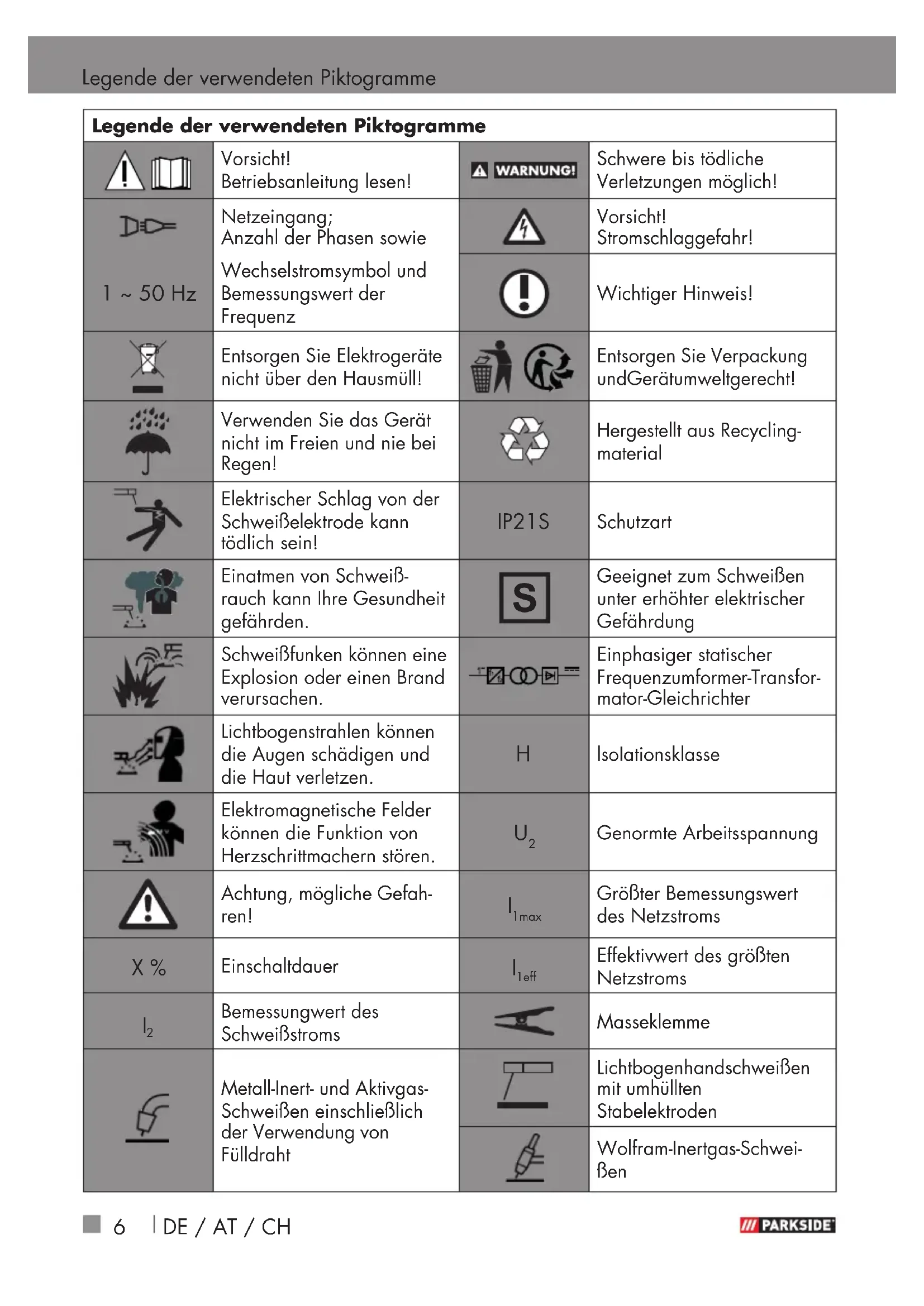 365DE/ AT / CH Legende der verwendeten Piktogramme ......................................... Seite 6 Einleitung .......................................................................................................... Seite 7 Bestimmungsgemäße Verwendung ........................................................................... Seite 7 Lieferumfang ......................................................................................................... Seite 8 Teilebeschreibung .................................................................................................. Seite 8 Technische Daten ................................................................................................... Seite 9 Sicherheitshinweise ..................................................................................... Seite 10 Gefahrenquellen beim Lichtbogenschweißen ............................................................. Seite 12 Schweißschirm-spezifische Sicherheitshinweise .......................................................... Seite 15 Umgebung mit erhöhter elektrischer Gefährdung ....................................................... Seite 16 Schweißen in engen Räumen .................................................................................. Seite 17 Summierung der Leerlaufspannungen ....................................................................... Seite 17 Schutzkleidung ...................................................................................................... Seite 18 Schutz gegen Strahlen und Verbrennungen ............................................................... Seite 18 EMV-Geräteklassifizierung ...................................................................................... Seite 19 Vor der Inbetriebnahme ............................................................................ Seite 20 Montage ............................................................................................................ Seite 20 Schweißschutzschild montieren ................................................................................ Seite 20 Fülldrahtschweißen...................................................................................... Seite 20 Gasflasche montieren ............................................................................................. Seite 20 Geräteanpassung zum Fülldrahtschweißen mit Schutzgas ........................................... Seite 21 Geräteanpassung zum Fülldrahtschweißen ohne Schutzgas ........................................ Seite 22 Fülldraht einsetzen ................................................................................................. Seite 22 Inbetriebnahme ............................................................................................. Seite 23 Gerät ein- und ausschalten ...................................................................................... Seite 23 Fülldrahtschweißen wählen ..................................................................................... Seite 23 Schweißstrom einstellen .......................................................................................... Seite 24 Drahtvorschub einstellen ......................................................................................... Seite 24 Schweißen ............................................................................................................ Seite 24 Schweißnaht erzeugen ........................................................................................... Seite 25 MMA-Schweißen ........................................................................................... Seite 28 WIG/TIG-Schweißen .................................................................................... Seite 28 Wartung und Reinigung ............................................................................ Seite 28 Umwelthinweise und Entsorgungsangaben .................................... Seite 28 EU-Konformitätserklärung ....................................................................... Seite 28 Hinweise zu Garantie und Serviceabwicklung .............................. Seite 29 Garantiebedingungen ............................................................................................ Seite 29 Garantiezeit und gesetzliche Mängelansprüche ......................................................... Seite 30 Garantieumfang .................................................................................................... Seite 30 Abwicklung im Garantiefall ..................................................................................... Seite 30 Service ................................................................................................................. Seite 31 Inhaltsverzeichnis6 DE / AT / CH Legende der verwendeten Piktogramme Legende der verwendeten Piktogramme Vorsicht! Betriebsanleitung lesen! Schwere bis tödliche Verletzungen möglich! Netzeingang; Anzahl der Phasen sowie Vorsicht! Stromschlaggefahr! 1 ~ 50 Hz Wechselstromsymbol und Bemessungswert der Frequenz Wichtiger Hinweis! Entsorgen Sie Elektrogeräte nicht über den Hausmüll! Entsorgen Sie Verpackung und Gerät umweltgerecht! Verwenden Sie das Gerät nicht im Freien und nie bei Regen! Hergestellt aus Recycling- material Elektrischer Schlag von der Schweißelektrode kann tödlich sein! IP21S Schutzart Einatmen von Schweiß- rauch kann Ihre Gesundheit gefährden.