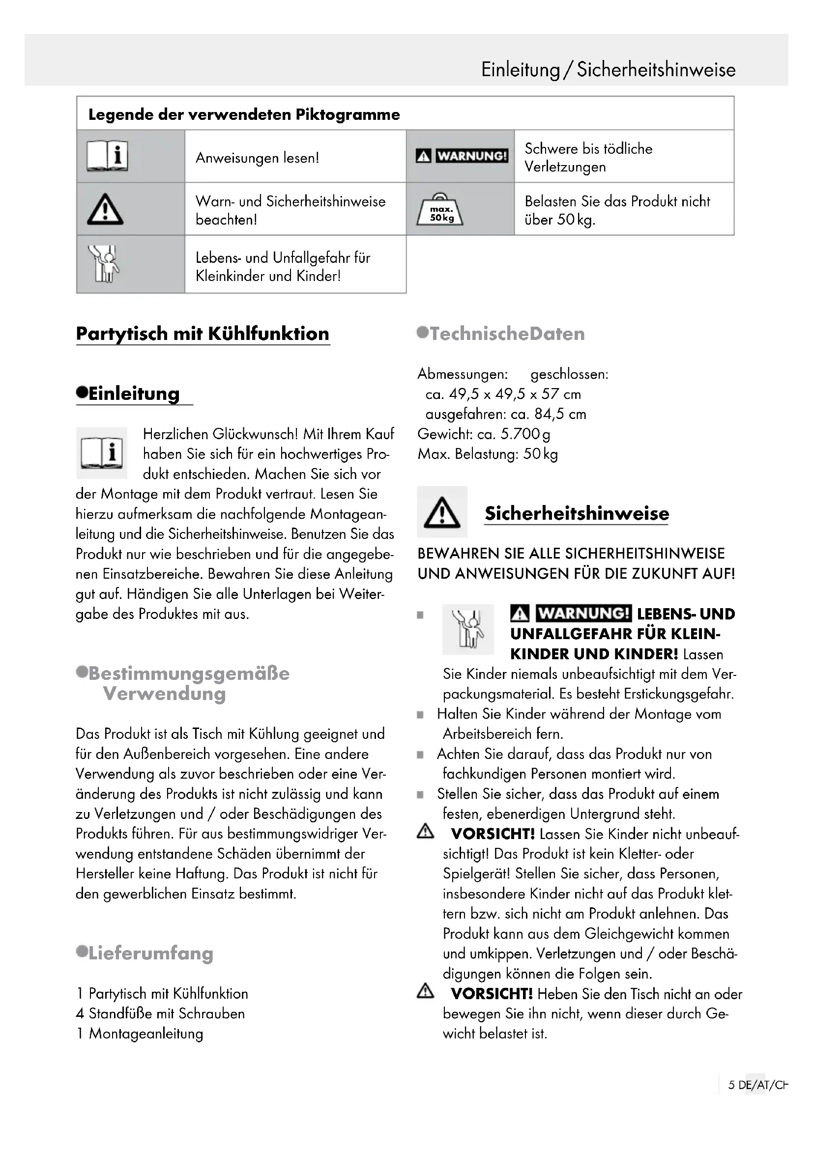 H I F5 DE/AT/CH Einleitung / Sicherheitshinweise Partytisch mit Kühlfunktion Einleitung Herzlichen Glückwunsch! Mit Ihrem Kauf haben Sie sich für ein hochwertiges Pro- dukt entschieden. Machen Sie sich vor der Montage mit dem Produkt vertraut. Lesen Sie hierzu aufmerksam die nachfolgende Montagean- leitung und die Sicherheitshinweise. Benutzen Sie das Produkt nur wie beschrieben und für die angegebe- nen Einsatzbereiche. Bewahren Sie diese Anleitung gut auf. Händigen Sie alle Unterlagen bei Weiter- gabe des Produktes mit aus. Bestimmungsgemäße Verwendung Das Produkt ist als Tisch mit Kühlung geeignet und für den Außenbereich vorgesehen. Eine andere Verwendung als zuvor beschrieben oder eine Ver- änderung des Produkts ist nicht zulässig und kann zu Verletzungen und / oder Beschädigungen des Produkts führen. Für aus bestimmungswidriger Ver- wendung entstandene Schäden übernimmt der Hersteller keine Haftung. Das Produkt ist nicht für den gewerblichen Einsatz bestimmt. Lieferumfang 1 Partytisch mit Kühlfunktion 4 Standfüße mit Schrauben 1 Montageanleitung Technische Daten Abmessungen: geschlossen: ca. 49,5 x 49,5 x 57 cm ausgefahren: ca. 84,5 cm Gewicht: ca. 5.700 g Max. Belastung: 50 kg Sicherheitshinweise