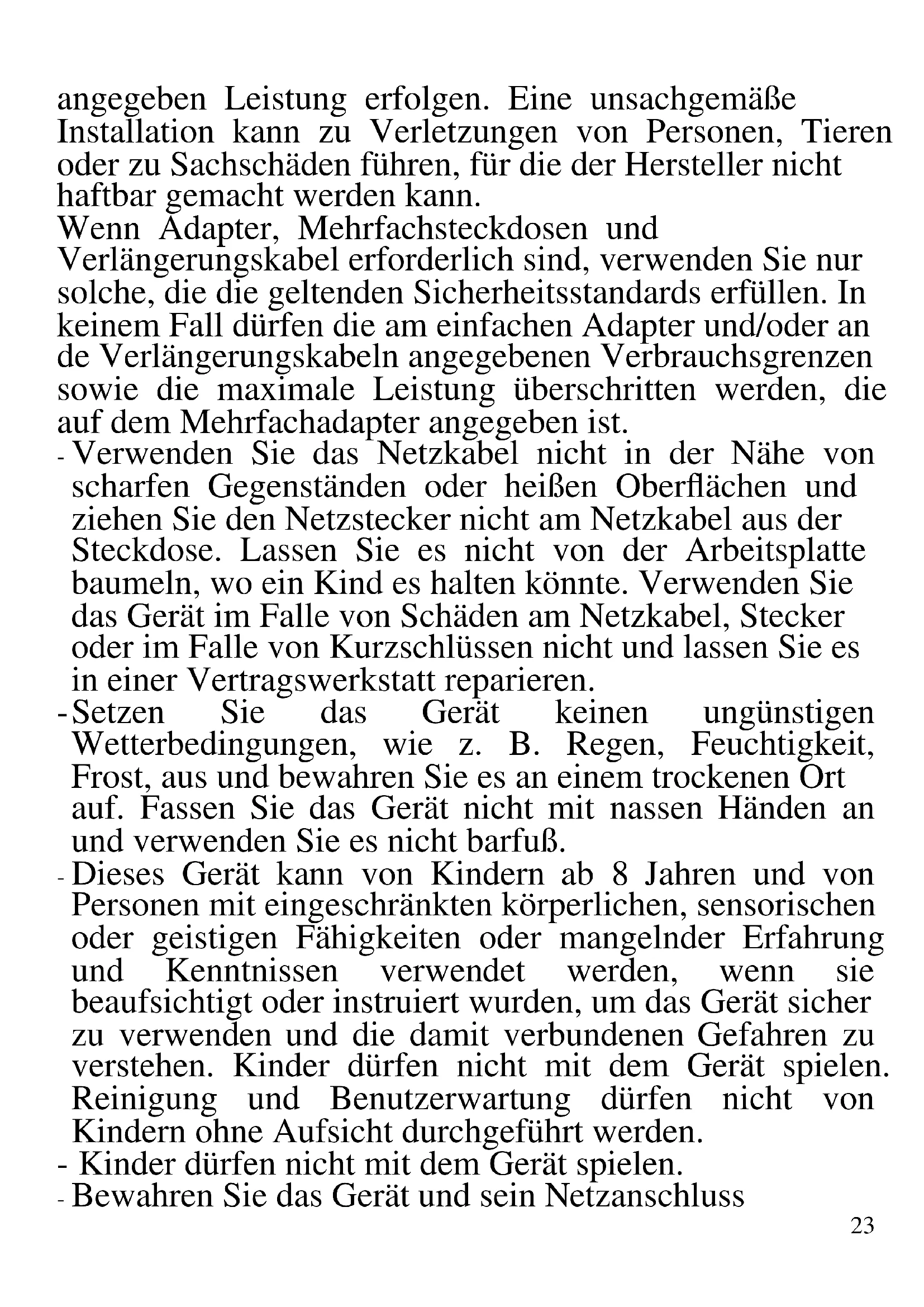 DEUTSCH: HINWEISE: Verwenden Sie das Gerät nur nach den Anweisungen in dieser Bedienungsanleitung. Jede anderweitige Verwendung gilt als unsachgemäß und gefährlich, und der Hersteller kann für Schäden haftbar gemacht werden, die durch eine unsachgemäße, falsche oder unvernünftige Verwendung verursacht werden. Stellen Sie vor der Verwendung sicher, dass das Gerät unversehrt ist. Im Zweifelsfall verwenden Sie es nicht und wenden Sie sich an den Kundendienst. Verpackungsmaterial (Plastiktüten, Styropor, Nägel, Klammern) muss für Kinder unzugänglich aufbewahrt werden, da es eine potenzielle Gefahrenquelle darstellt. Wir möchten Sie in diesem Zusammenhang auch daran erinnern, dass Verpackungsabfall der Mülltrennung zugeführt werden muss. Stellen Sie sicher, dass die Angaben auf dem Typenschild mit denen des Stromnetzes übereinstimmen. Die Installation muss gemäß den Anweisungen des Herstellers unter Berücksichtigung der maximal auf dem Typenschild23 angegeben Leistung erfolgen. Eine unsachgemäße Installation kann zu Verletzungen von Personen, Tieren oder zu Sachschäden führen, für die der Hersteller nicht haftbar gemacht werden kann. Wenn Adapter, Mehrfachsteckdosen und Verlängerungskabel erforderlich sind, verwenden Sie nur solche, die die geltenden Sicherheitsstandards erfüllen. In keinem Fall dürfen die am einfachen Adapter und/oder an de Verlängerungskabeln angegebenen Verbrauchsgrenzen sowie die maximale Leistung überschritten werden, die auf dem Mehrfachadapter angegeben ist. - Verwenden Sie das Netzkabel nicht in der Nähe von scharfen Gegenständen oder heißen Oberflächen und ziehen Sie den Netzstecker nicht am Netzkabel aus der Steckdose. Lassen Sie es nicht von der Arbeitsplatte baumeln, wo ein Kind es halten könnte. Verwenden Sie das Gerät im Falle von Schäden am Netzkabel, Stecker oder im Falle von Kurzschlüssen nicht und lassen Sie es in einer Vertragswerkstatt reparieren. - Setzen Sie das Gerät keinen ungünstigen Wetterbedingungen, wie z. B. Regen, Feuchtigkeit, Frost, aus und bewahren Sie es an einem trockenen Ort auf. Fassen Sie das Gerät nicht mit nassen Händen an und verwenden Sie es nicht barfuß. - Dieses Gerät kann von Kindern ab 8 Jahren und von Personen mit eingeschränkten körperlichen, sensorischen oder geistigen Fähigkeiten oder mangelnder Erfahrung und Kenntnissen verwendet werden, wenn sie beaufsichtigt oder instruiert wurden, um das Gerät sicher zu verwenden und die damit verbundenen Gefahren zu verstehen. Kinder dürfen nicht mit dem Gerät spielen. Reinigung und Benutzerwartung dürfen nicht von Kindern ohne Aufsicht durchgeführt werden. - Kinder dürfen nicht mit dem Gerät spielen. - Bewahren Sie das Gerät und sein Netzanschluss24 außerhalb der Reichweite von Kinder unter 8 Jahren. Wenn das Netzkabel beschädigt ist oder wenn ein Fehler vorliegt, darf das Gerät nicht manipuliert werden. Jede Reparatur muss vom Hersteller oder seinem technischen Kundendienst oder in jedem Fall von einer Person mit ähnlicher Qualifikation durchgeführt werden, um jegliches Risiko zu vermeiden. Die Nichtbeachtung der vorstehenden Bestimmungen kann die Sicherheit des Geräts beeinträchtigen und die Garantiebedingungen ungültig machen. WARNUNG: Dieses Gerät enthält eine Heizfunktion. Oberflächen, außer die funktionellen Oberflächen können hohe Temperaturen entwickeln. Da die Temperaturen von verschiedene Personen unterschiedlich wahrgenommen werden, sollte dieses Gerät mit VORSICHT verwendet werden. Halten Sie das Gerät ausschließlich auf Griffflächen die abhalten und verwenden Sie solche Hitzeschutzmaßen. Dieses Gerät ist nur für den Hausgebrauch oder gleichwertiges bestimmt, in Situationen wie bspw.: Kantinen in kleinen Firmen oder ähnliche Arbeitsumgebungen, von Kunden in Hotels, Motels oder andere Art von touristische Unterkunft, wie ländlicher oder Wohn –Tourismus. Das Gerät darf nicht mit einer Zeitschaltuhr oder mit einem separaten Fernwirksystem betrieben werden Führen Sie vor jedem Gebrauch das Netzkabel aus. Setzen Sie das Produkt keinen Stößen aus, es könnte beschädigt werden. Verwenden Sie nur originale und kompatible Teile und Zubehör. ALLGEMEINE HINWEISE Die hintere Rückseite des Geräts soll gegen eine Wand gestellt werden. Stellen Sie das Gerät auf eine stabile und ebene Fläche.25 Keine heißen Oberflächen berühren. Benutzen Sie immer Griffe und Schalter. Um Elektroschocks zu vermeiden, den Netzkabel, den Stecker oder den Körper niemals in Wasser oder andere Flüssigkeiten tauchen Ziehen Sie den Netzstecker aus der Steckdose, wenn das Gerät nicht gebraucht wird, vor Teile angebracht oder entfernt werden und vor dem Reinigen Die Benutzung von Zubehörteile die nicht vom Hersteller empfohlen werden, können Schäden oder Verletzungen verursachen die nicht von der Garantie abgedeckt werden Stellen Sie das Gerät nicht auf oder in der Nähe eines heißen Gas-oder Elektrokoches oder aufgeheizten Backofen BESCHREIBUNG G10135 1 Stecker und Netzkabel 2 Zeitschaltuhr 3 Bedienschalter 4 Betriebslampe 5 Temperaturwahlschalter 6 obere Abdeckung 7 Griff 8 Grillrost 9 Backblech 10 Heizelemente 11Backblech Griff INBETRIEBNAHME Vor der Verwendung alle Zubehörteile und den Garraum sorgfältig waschen. Lassen Sie den Garraum während 30 min. mit der Tür offen lüften und dann schalten Sie den Ofen für ein paar Minuten leer ein. Vor dem ersten Garen, lassen Sie den Ofen während 10 min. mit seiner maximal Temperatur funktionieren und wählen Sie beide Heizelemente. Bedienfeld Mit dem Bedienschalter (3) ist es möglich nur die untere, obere oder beide Widerstandskräften zu wählen. Position 1 (Grillen): schaltet die obere Widerstandskraft ein (Grill kochen) Position 2: schaltet die untere Widerstandskraft ein Position 3 (Anbraten): schaltet die untere und obere Widerstandskraft ein. Position 4: schaltet die obere Widerstandskraft und die Ventilation ein Position 5: schaltet die untere Widerstandskraf
