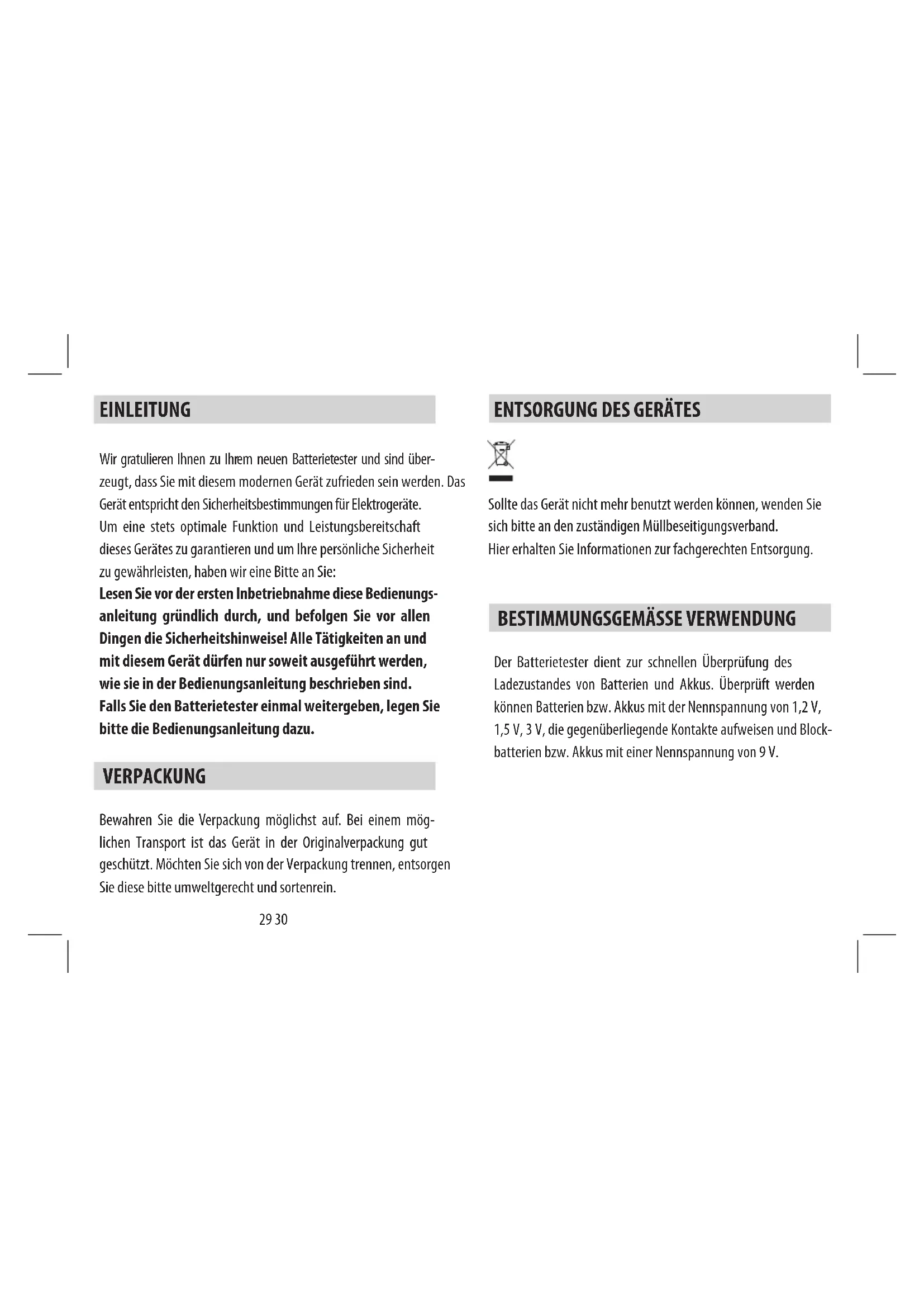 Wir gratulieren Ihnen zu Ihrem neuen Batterietester und sind über- zeugt, dass Sie mit diesem modernen Gerät zufrieden sein werden. Das Gerät entspricht den Sicherheitsbestimmungen für Elektrogeräte. Um eine stets optimale Funktion und Leistungsbereitschaft dieses Gerätes zu garantieren und um Ihre persönliche Sicherheit zu gewährleisten, haben wir eine Bitte an Sie: Lesen Sie vor der ersten Inbetriebnahme diese Bedienungs- anleitung gründlich durch, und befolgen Sie vor allen Dingen die Sicherheitshinweise! Alle Tätigkeiten an und mit diesem Gerät dürfen nur soweit ausgeführt werden, wie sie in der Bedienungsanleitung beschrieben sind. Falls Sie den Batterietester einmal weitergeben, legen Sie bitte die Bedienungsanleitung dazu. VERPACKUNG Bewahren Sie die Verpackung möglichst auf. Bei einem mög- lichen Transport ist das Gerät in der Originalverpackung gut geschützt. Möchten Sie sich von der Verpackung trennen, entsorgen Sie diese bitte umweltgerecht und sortenrein. EINLEITUNG31 32