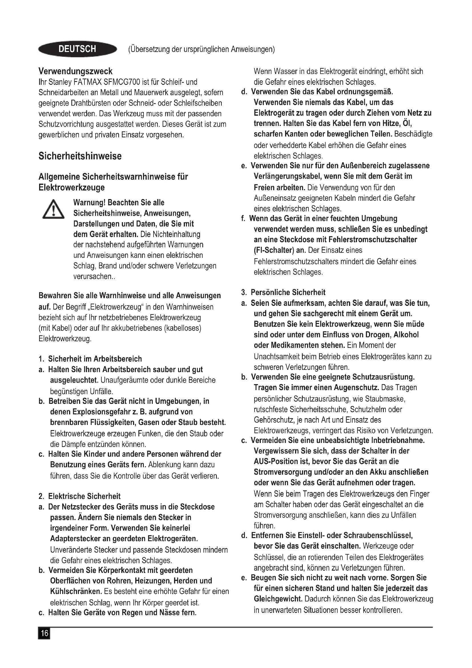 Type 27 Guard Diamond cutting wheels16 (Übersetzung der ursprünglichen Anweisungen) DEUTSCH Verwendungszweck Ihr Stanley FATMAX SFMCG700 ist für Schleif- und Schneidarbeiten an Metall und Mauerwerk ausgelegt, sofern geeignete Drahtbürsten oder Schneid- oder Schleifscheiben verwendet werden. Das Werkzeug muss mit der passenden Schutzvorrichtung ausgestattet werden. Dieses Gerät ist zum gewerblichen und privaten Einsatz vorgesehen. Sicherheitshinweise Allgemeine Sicherheitswarnhinweise für Elektrowerkzeuge Warnung! Beachten Sie alle Sicherheitshinweise, Anweisungen, Darstellungen und Daten, die Sie mit dem Gerät erhalten. Die Nichteinhaltung der nachstehend aufgeführten Warnungen und Anweisungen kann einen elektrischen Schlag, Brand und/oder schwere Verletzungen verursachen.. Bewahren Sie alle Warnhinweise und alle Anweisungen auf. Der Begriff „Elektrowerkzeug“ in den Warnhinweisen bezieht sich auf Ihr netzbetriebenes Elektrowerkzeug (mit Kabel) oder auf Ihr akkubetriebenes (kabelloses) Elektrowerkzeug.