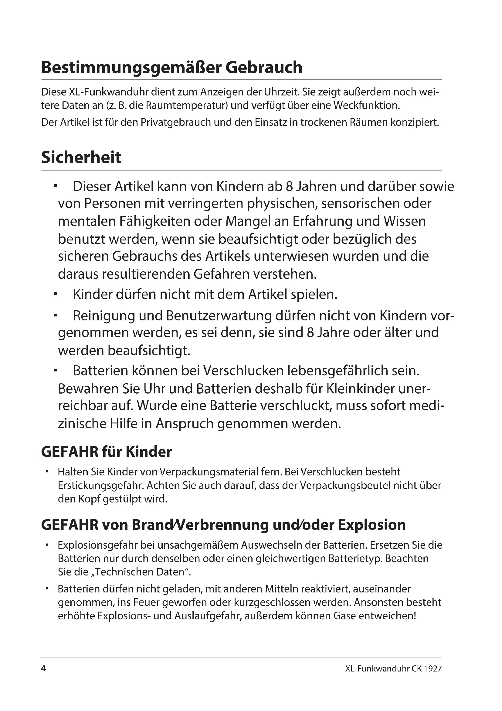 XL-Funkwanduhr CK 1927 Bestimmungsgemäßer Gebrauch Diese XL-Funkwanduhr dient zum Anzeigen der Uhrzeit. Sie zeigt außerdem noch wei- tere Daten an (z.B. die Raumtemperatur) und verfügt über eine Weckfunktion. Der Artikel ist für den Privatgebrauch und den Einsatz in trockenen Räumen konzipiert. Sicherheit Dieser Artikel kann von Kindern ab 8 Jahren und darüber sowie von Personen mit verringerten physischen, sensorischen oder mentalen Fähigkeiten oder Mangel an Erfahrung und Wissen benutzt werden, wenn sie beaufsichtigt oder bezüglich des sicheren Gebrauchs des Artikels unterwiesen wurden und die daraus resultierenden Gefahren verstehen. Kinder dürfen nicht mit dem Artikel spielen. Reinigung und Benutzerwartung dürfen nicht von Kindern vor- genommen werden, es sei denn, sie sind 8 Jahre oder älter und werden beaufsichtigt. Batterien können bei Verschlucken lebensgefährlich sein. Bewahren Sie Uhr und Batterien deshalb für Kleinkinder uner- reichbar auf. Wurde eine Batterie verschluckt, muss sofort medi- zinische Hilfe in Anspruch genommen werden. GEFAHR für Kinder Halten Sie Kinder von Verpackungsmaterial fern. Bei Verschlucken besteht Erstickungsgefahr. Achten Sie auch darauf, dass der Verpackungsbeutel nicht über den Kopf gestülpt wird. GEFAHR von Brand/Verbrennung und/oder Explosion Explosionsgefahr bei unsachgemäßem Auswechseln der Batterien. Ersetzen Sie die Batterien nur durch denselben oder einen gleichwertigen Batterietyp. Beachten Sie die „Technischen Daten“. Batterien dürfen nicht geladen, mit anderen Mitteln reaktiviert, auseinander genommen, ins Feuer geworfen oder kurzgeschlossen werden. Ansonsten besteht erhöhte Explosions- und Auslaufgefahr, außerdem können Gase entweichen!Technische Daten